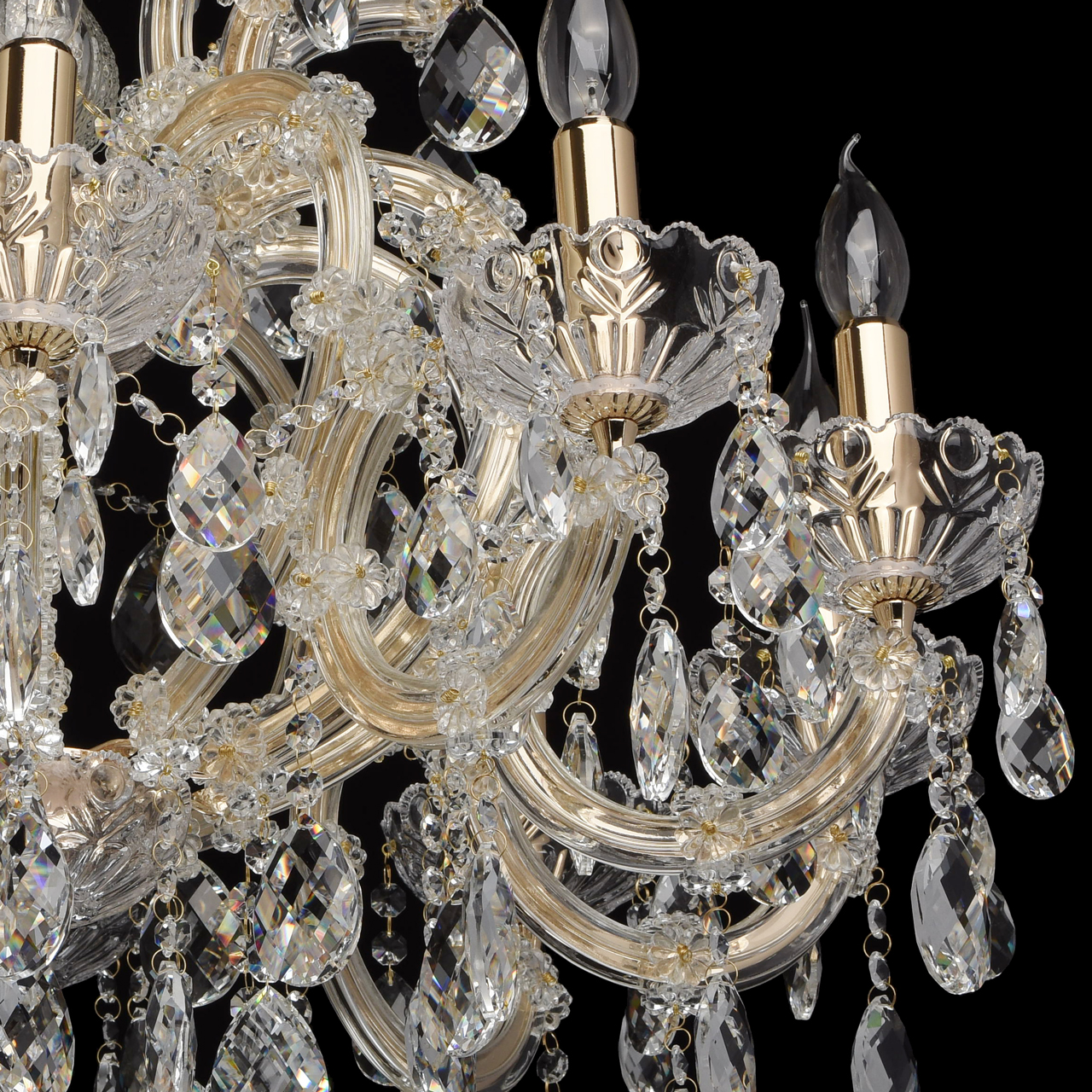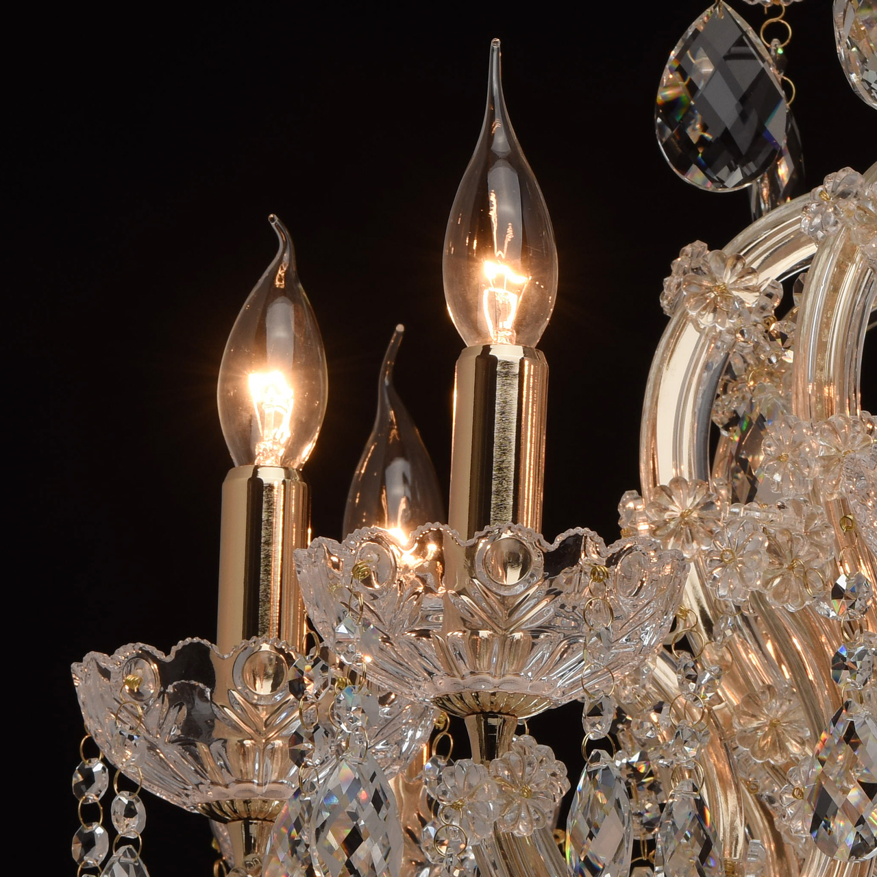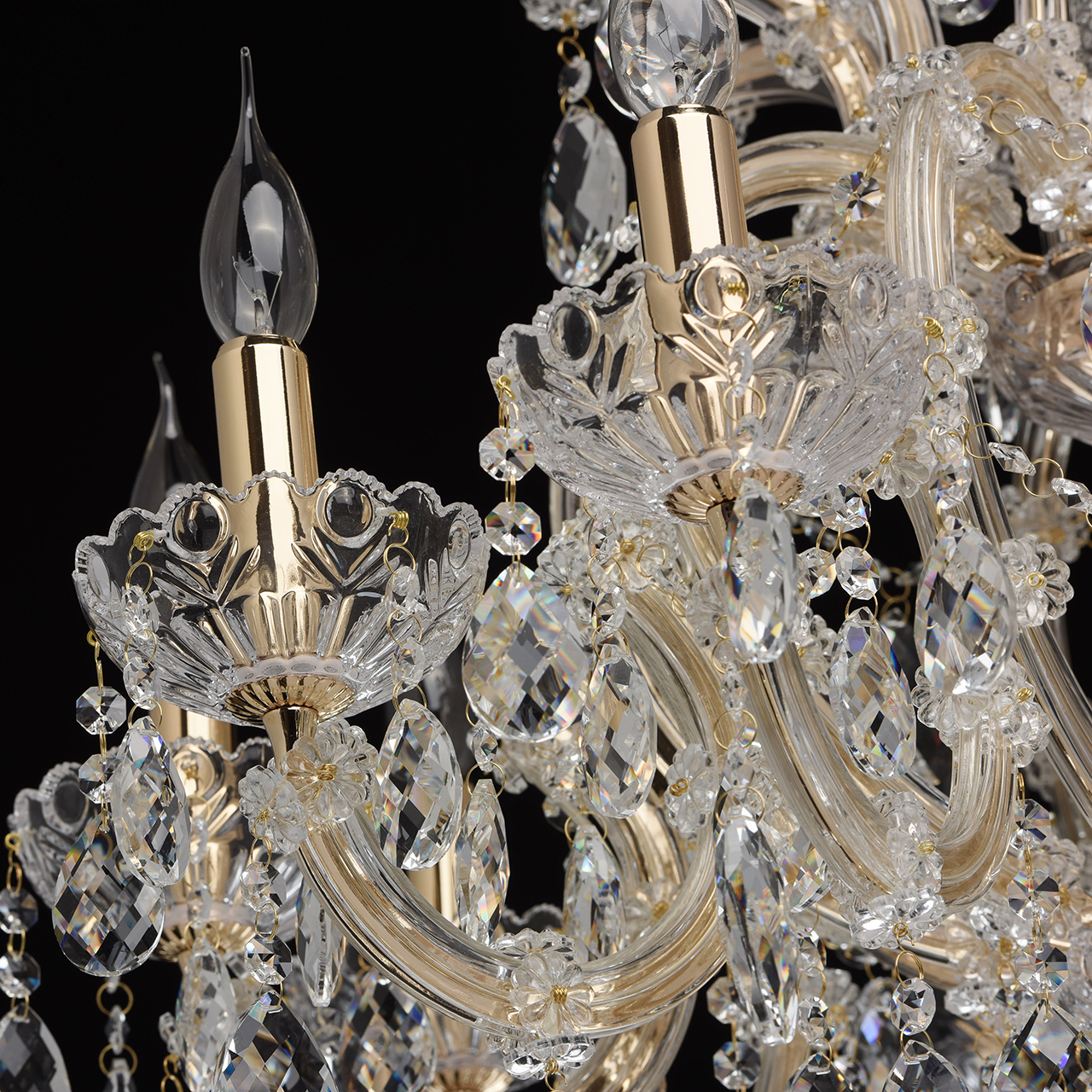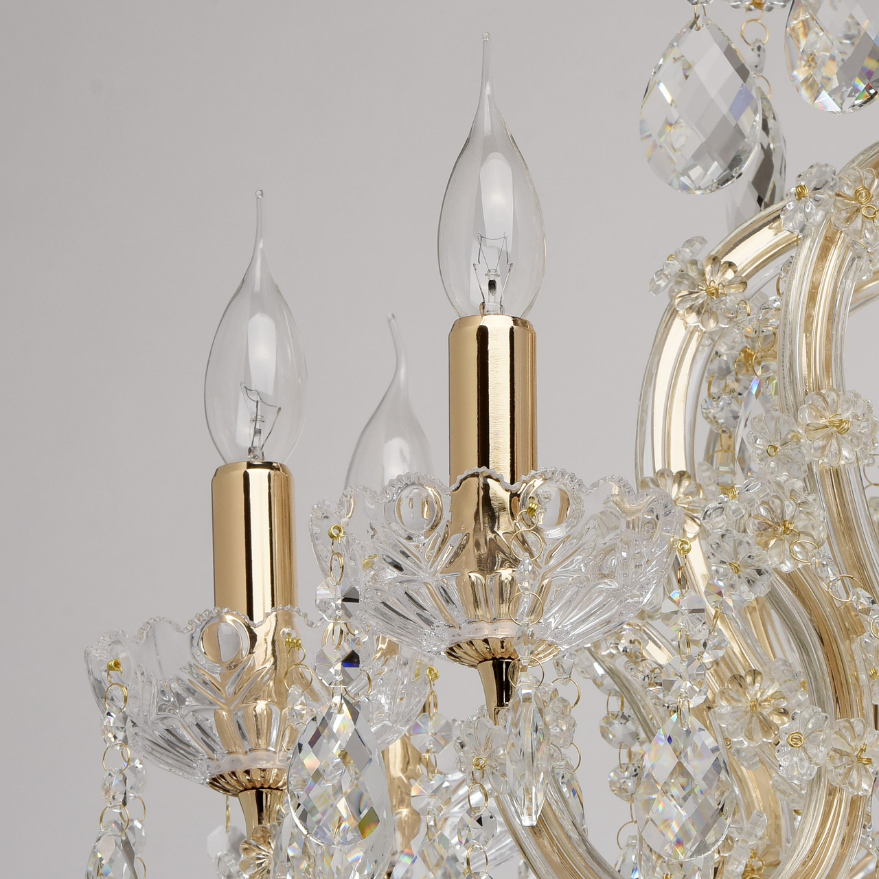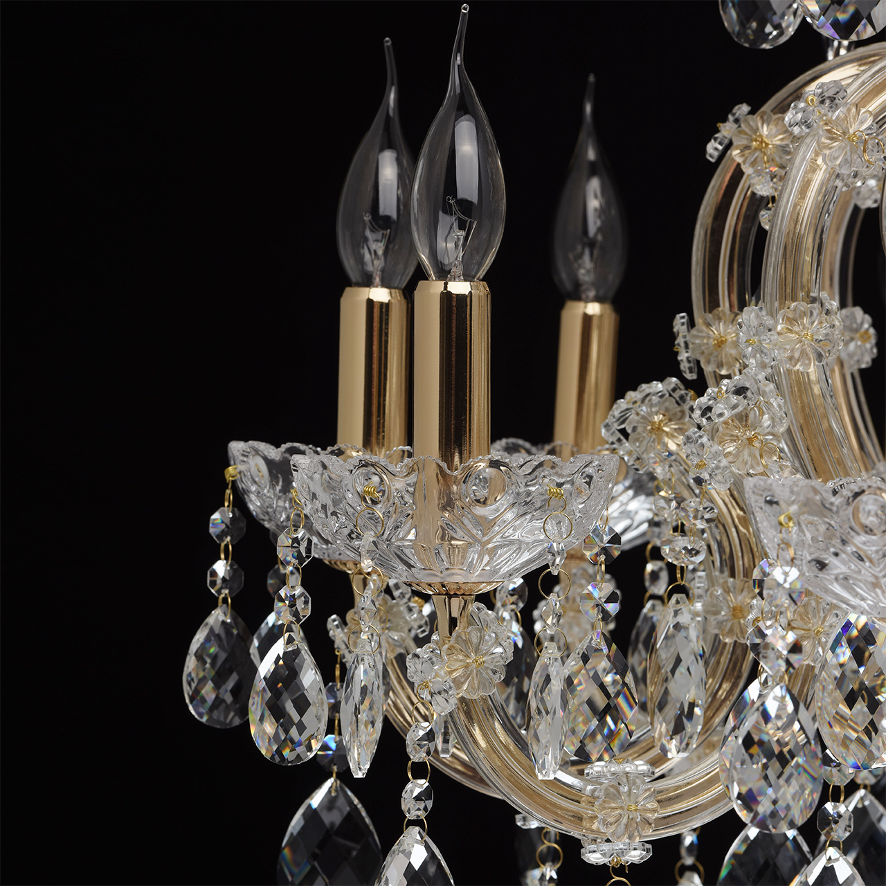 Изобилие хрустальных элементов и многогранная игра света превращают люстру из коллекции «Одетта» в настоящее произведение искусства. Металлическое основание золотого цвета в сочетании с элементами из дутого прозрачного стекла создают необычный дуэт. Обилие хрустальных подвесов придает люстре особенно воздушный вид. Источники света в виде свеч напоминают об античных временах. Люстра станет прекрасным украшением богатой гостиной или зала для приемов.Преимущества модели