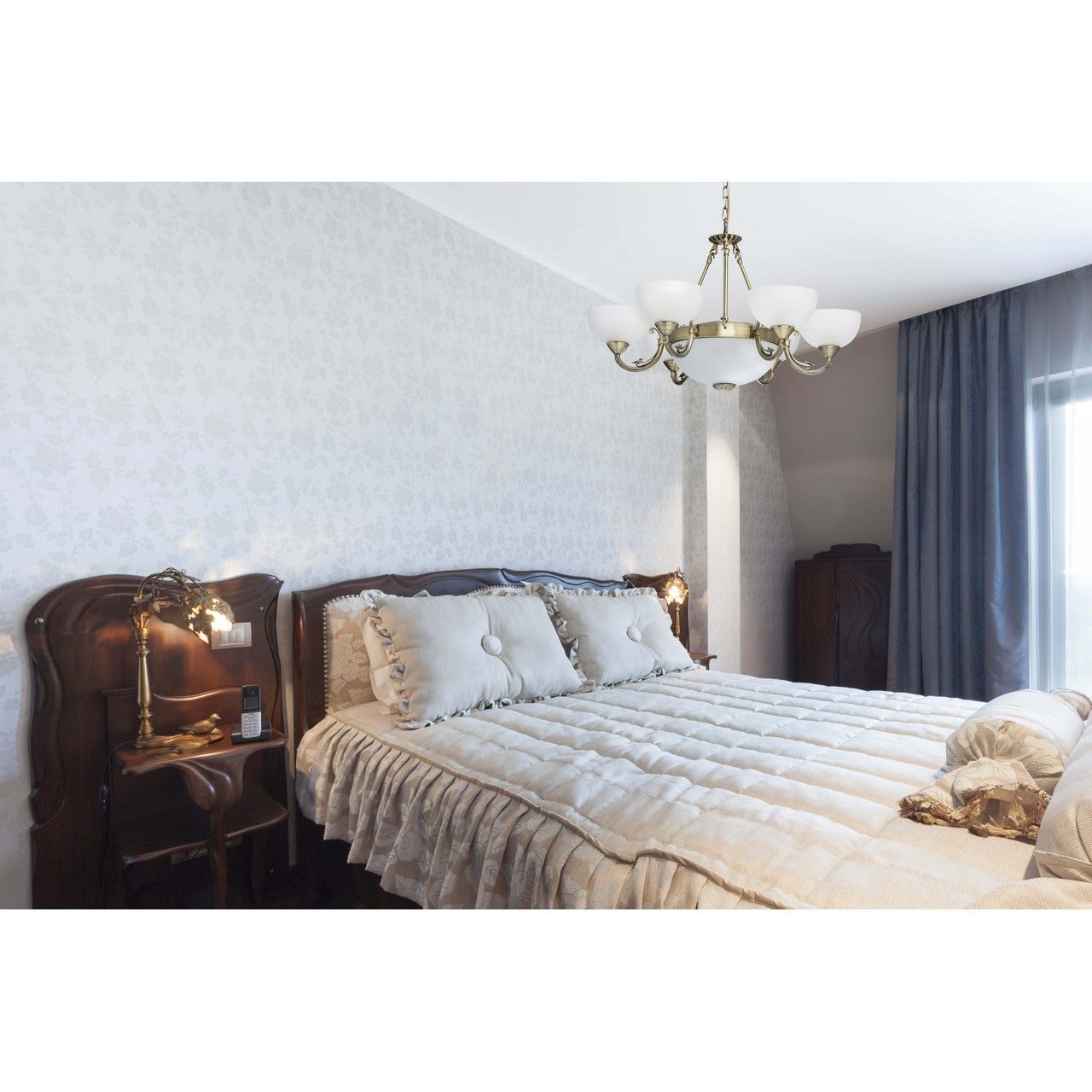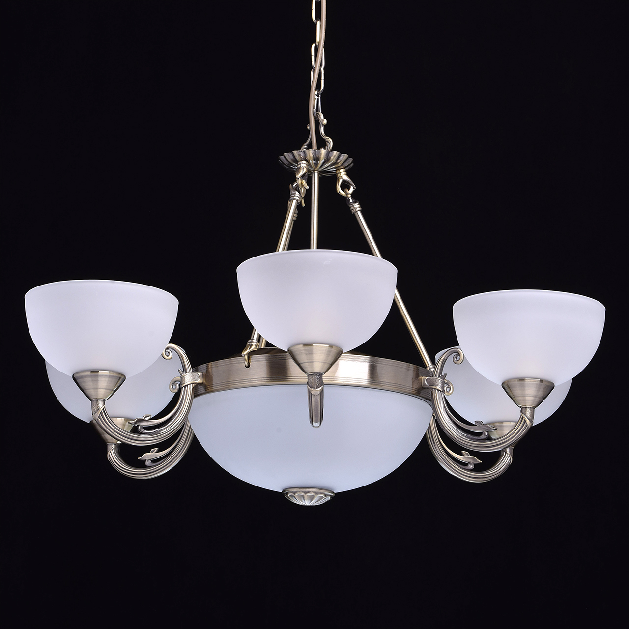 Классический дизайн светильника с элементами античного стиля. Тонко и элегантно проработаны плафоны, декор на основания светильника. Высокие параметры освещенности. Светильник подойдет для стандартных потолков за счет регулируемого подвеса.Стилевые решения интерьера