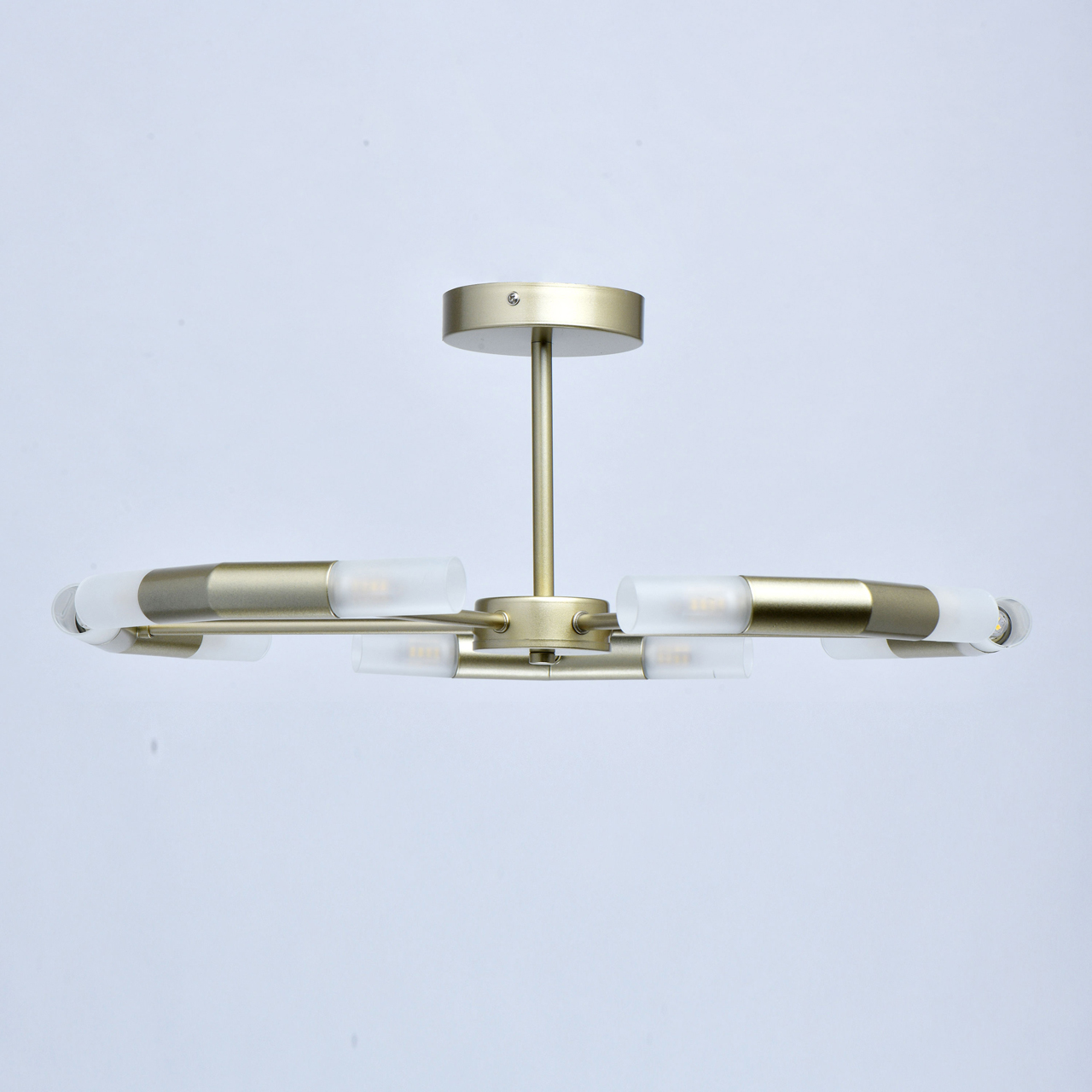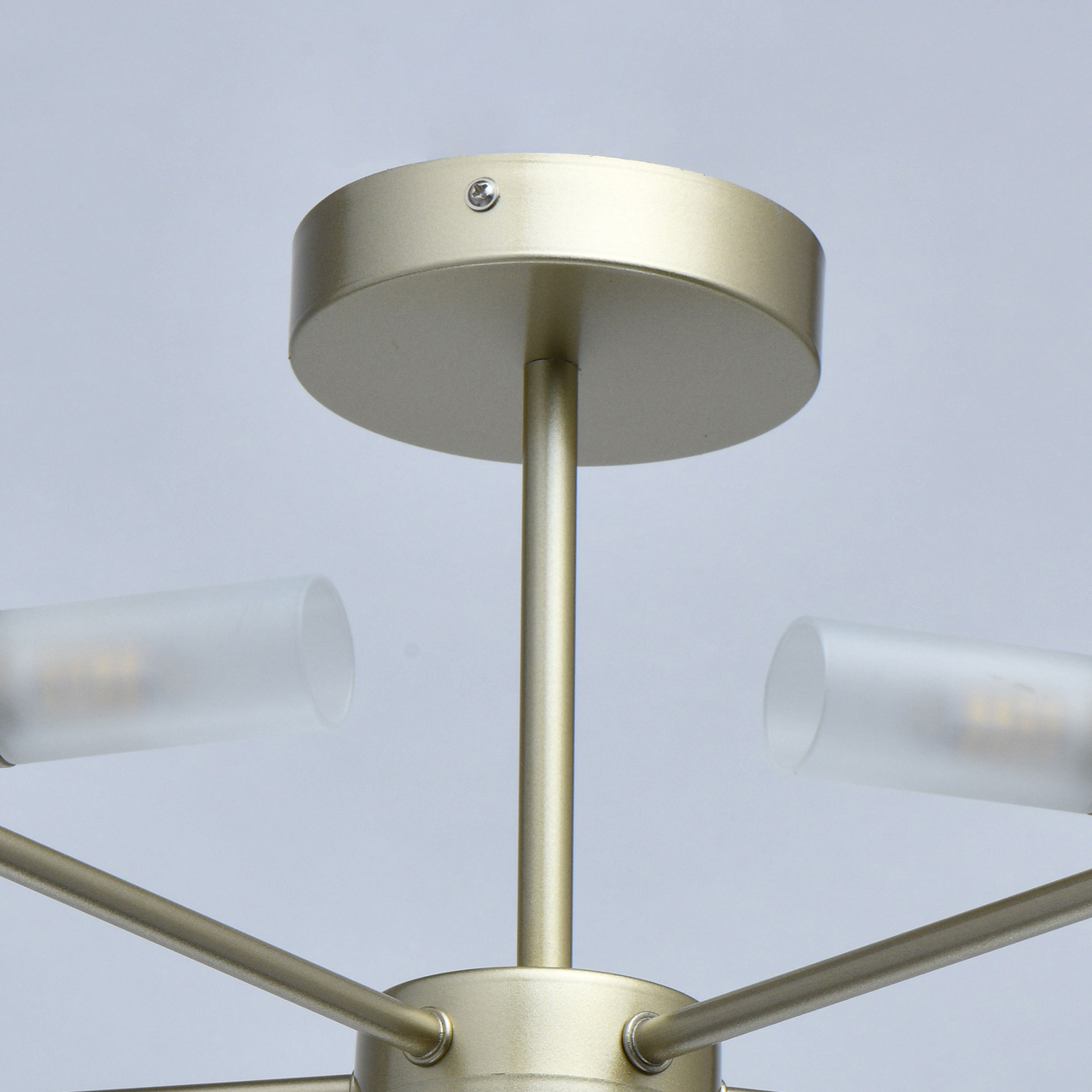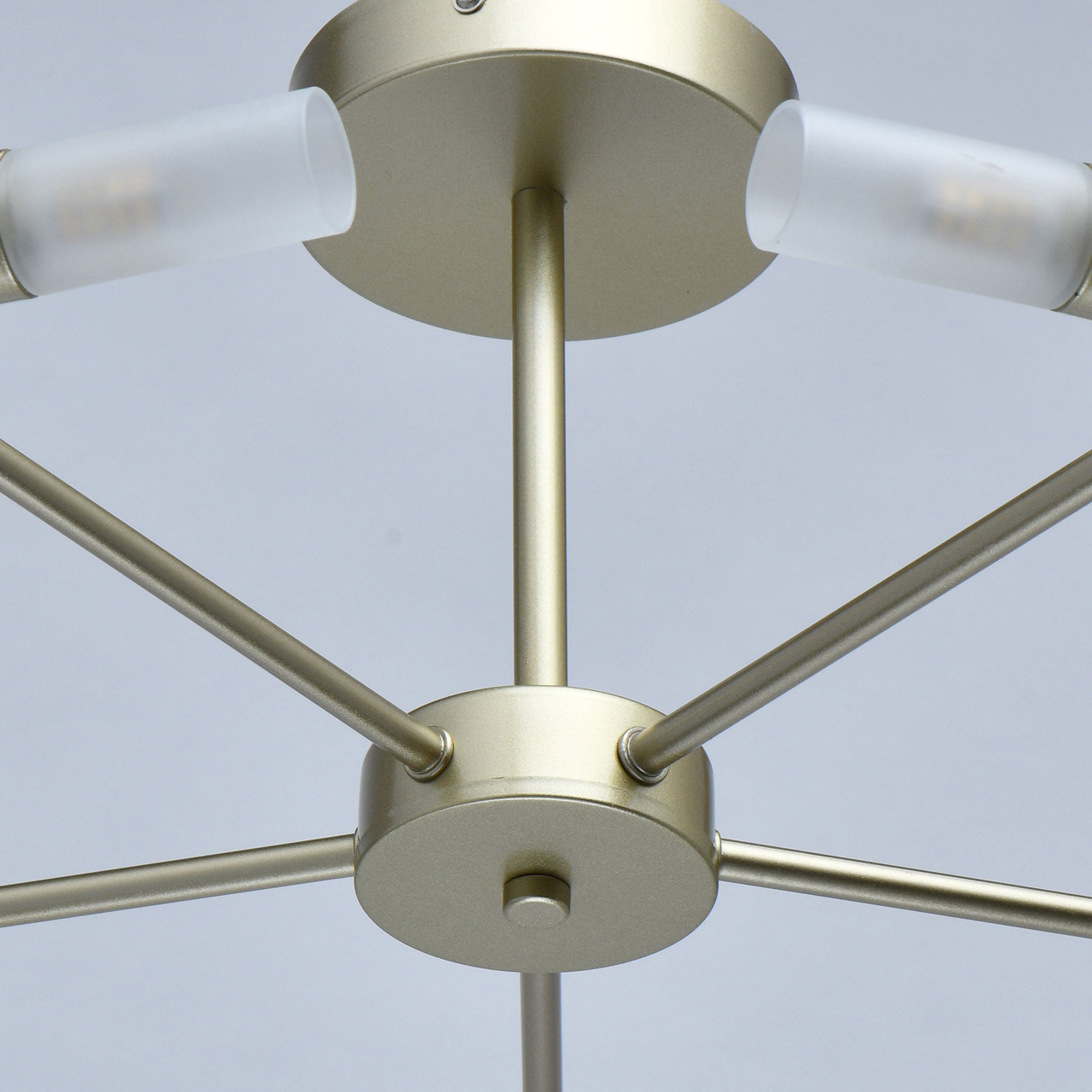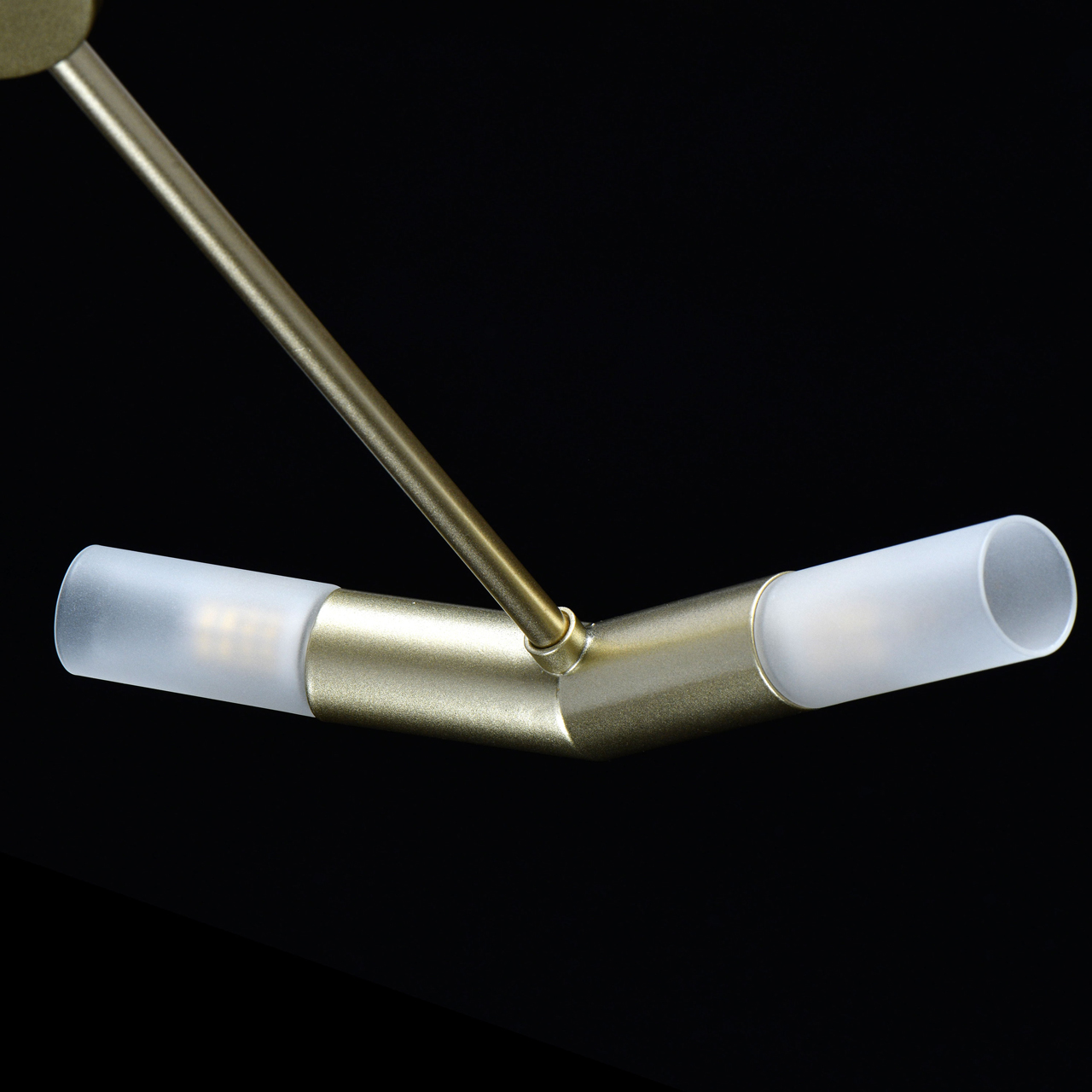 Компактная высота идеальна для стандартной высоты потолка. Конструкция светильника позволяет равномерно распределять свет в помещении, менять направление светового потока при повороте рожка. Плафоны матового белого цвета создают мягкое освещение. Основание светильника окрашено в модный цвет шампань.Стилевые решения интерьера