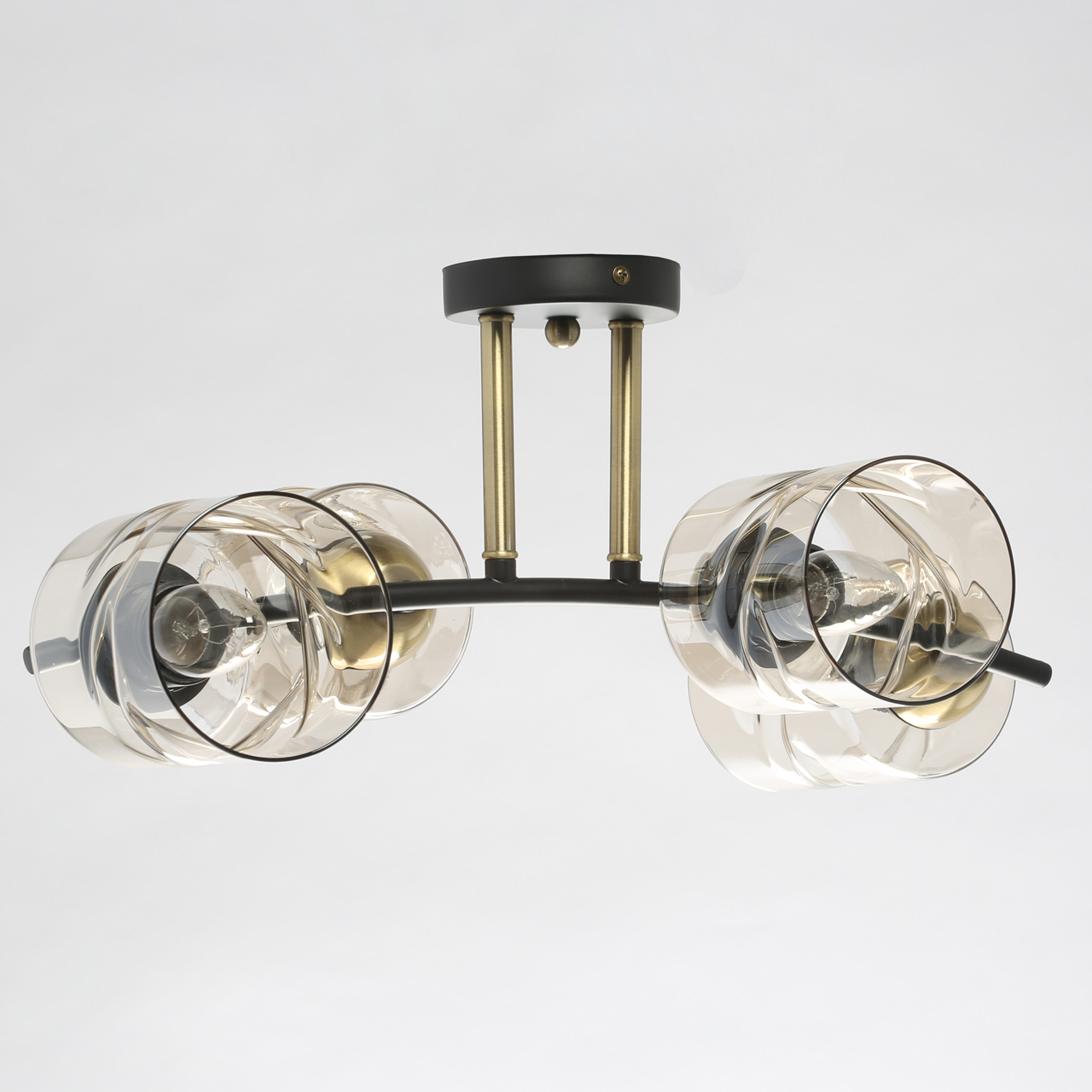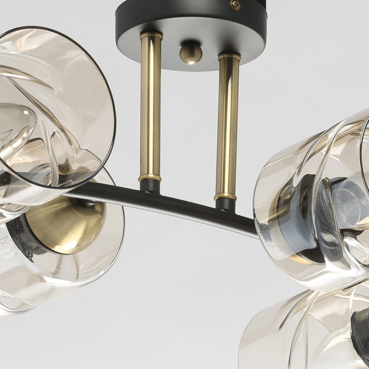 Компактная высота модели идеальна для стандартной высоты потолка. Комбинация фактур металла черного цвета и античной бронзы в тренде. Плафоны скрученной формы из тонированного стекла обеспечивают мягкий световой поток. Заменяемые источники света удобны в эксплуатации.Стилевые решения интерьера