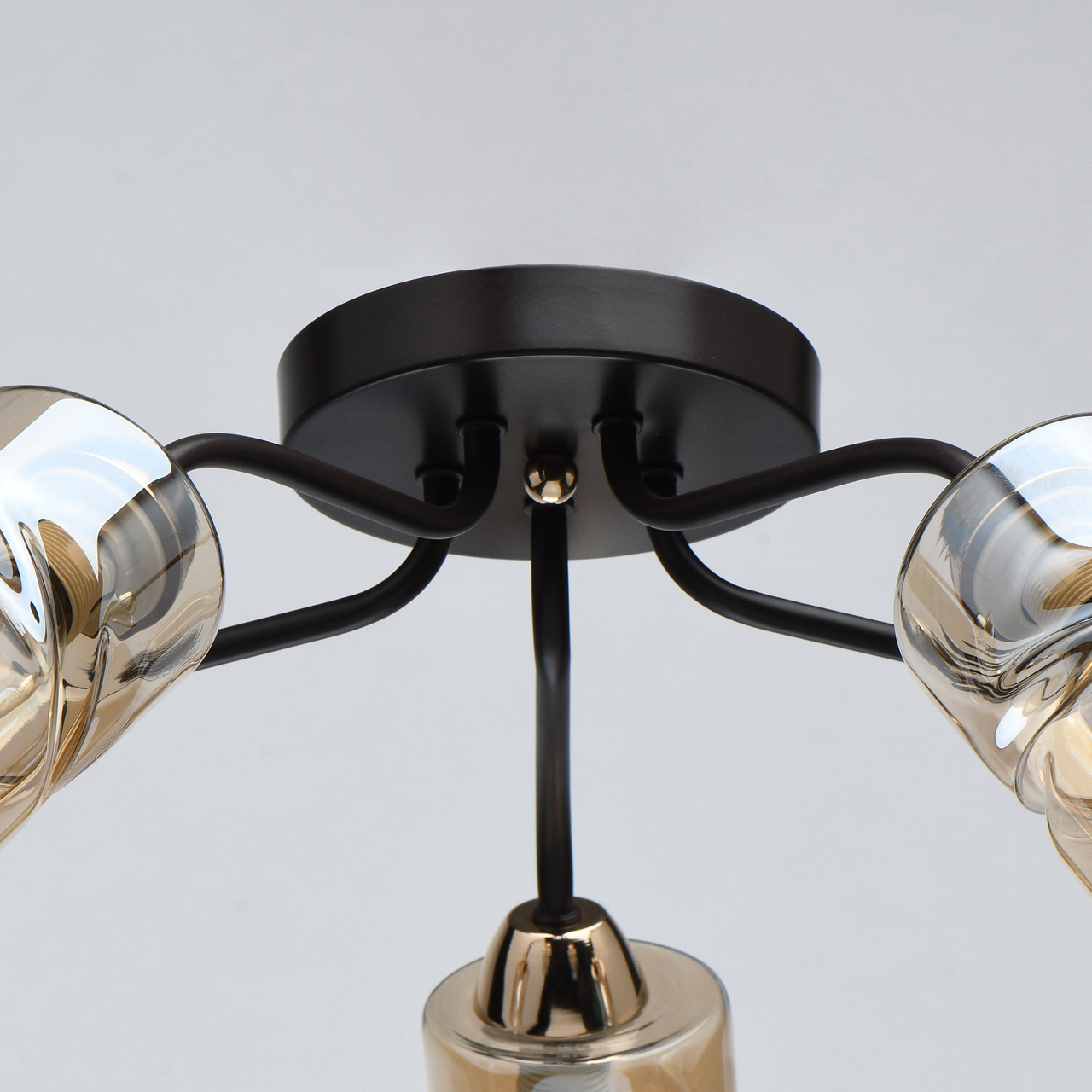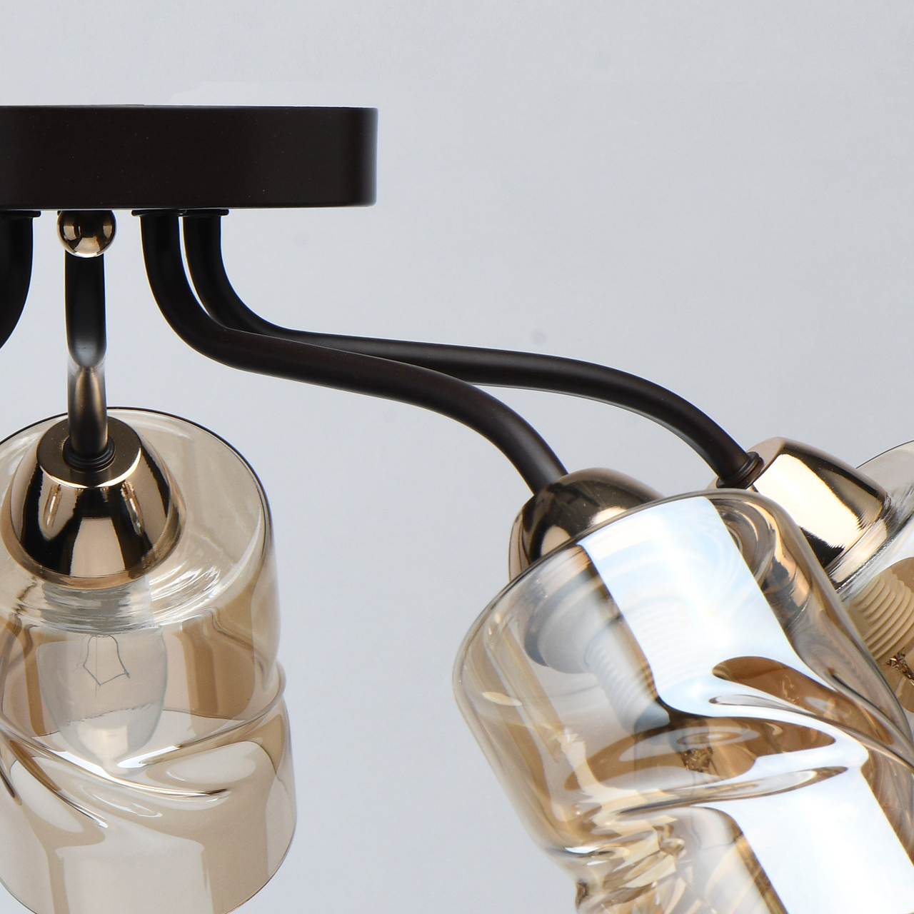 Актуальное сочетание цвета кофе и золотого в тренде. Плафоны скрученной формы из гальванизированного стекла в цвет шампань обеспечивают мягкий световой поток. Компактная высота модели идеальна для стандартной высоты потолка. Заменяемые источники света удобны в эксплуатации.Стилевые решения интерьера