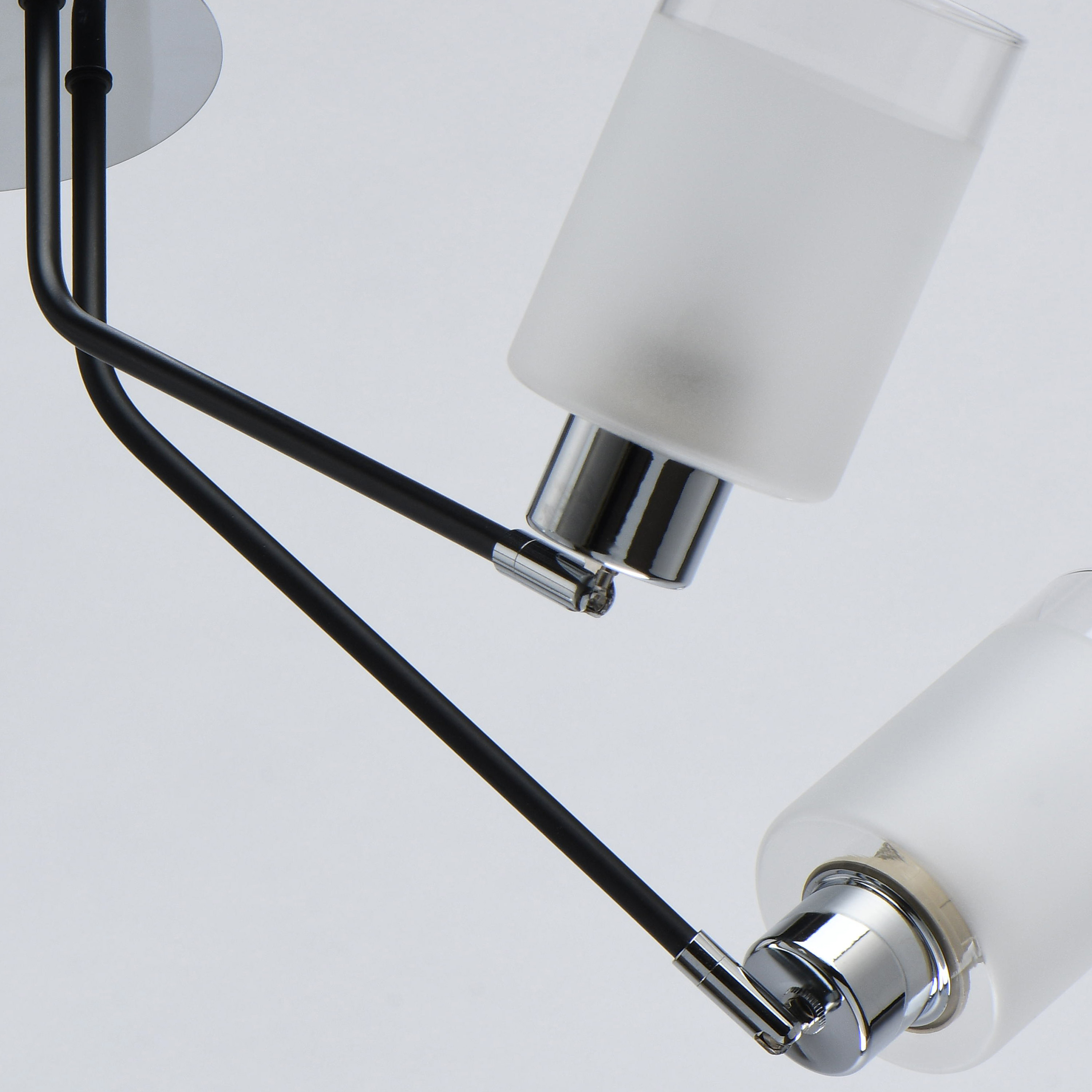 Комбинация фактур металла глянцевого хрома и матового черного цвета в тренде. Стеклянные, частично матированные плафоны обеспечивают мягкий световой поток. Поворот плафонов регулирует направление светового потока. Компактные размеры светильника по высоте идеальны для стандартных потолков.Стилевые решения интерьера