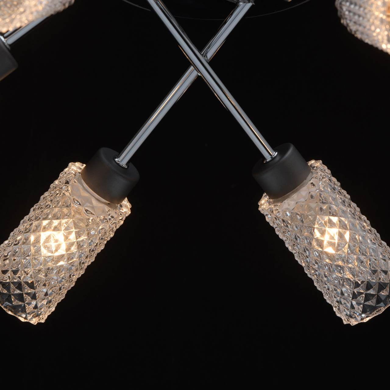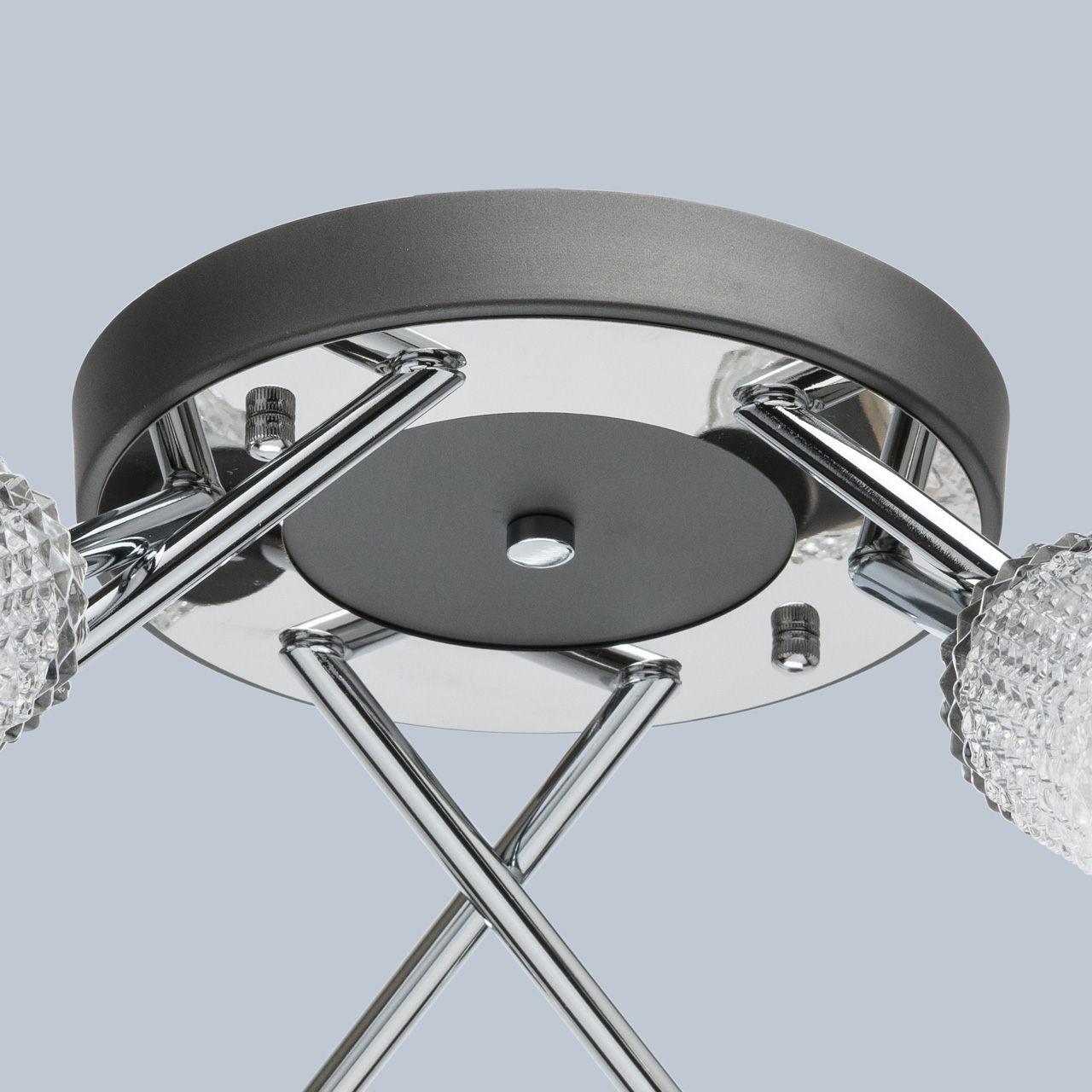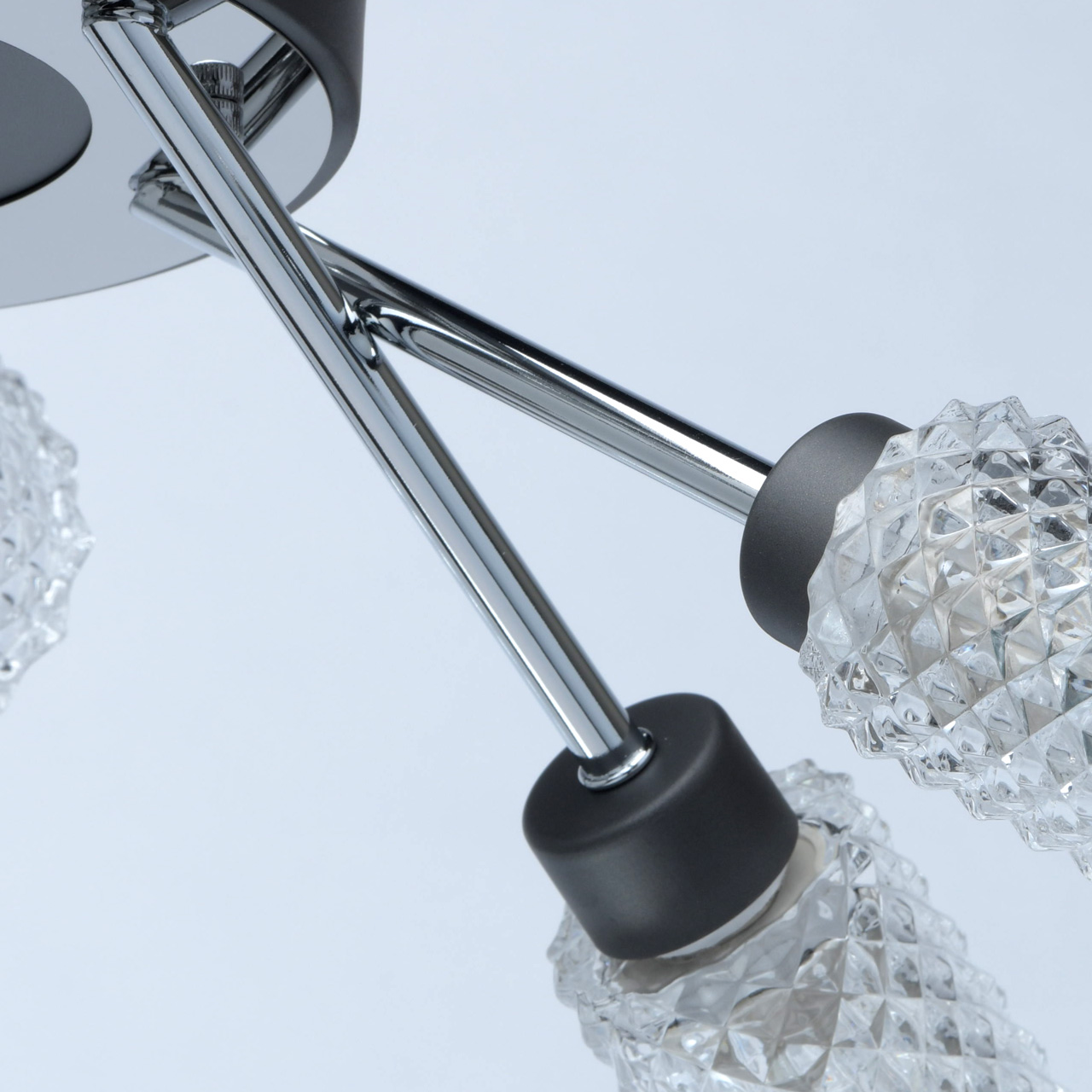 Основание светильника выполнено из металла. Потолочная чаша и держатели плафонов окрашены в темно-серый цвет. Рожки гальванизированы в цвет хрома. Потолочная чаша закрыта пластиной из нержавеющей стали, отполированной до зеркального блеска. Светильник декорирован прозрачными стеклянными плафонами, отлитыми в сложную форму.Тип помещения