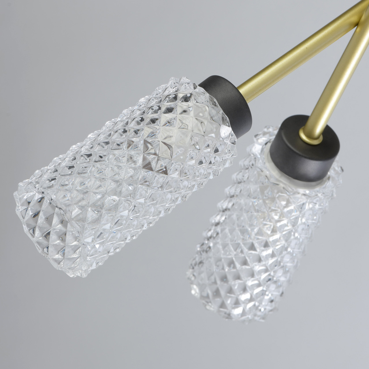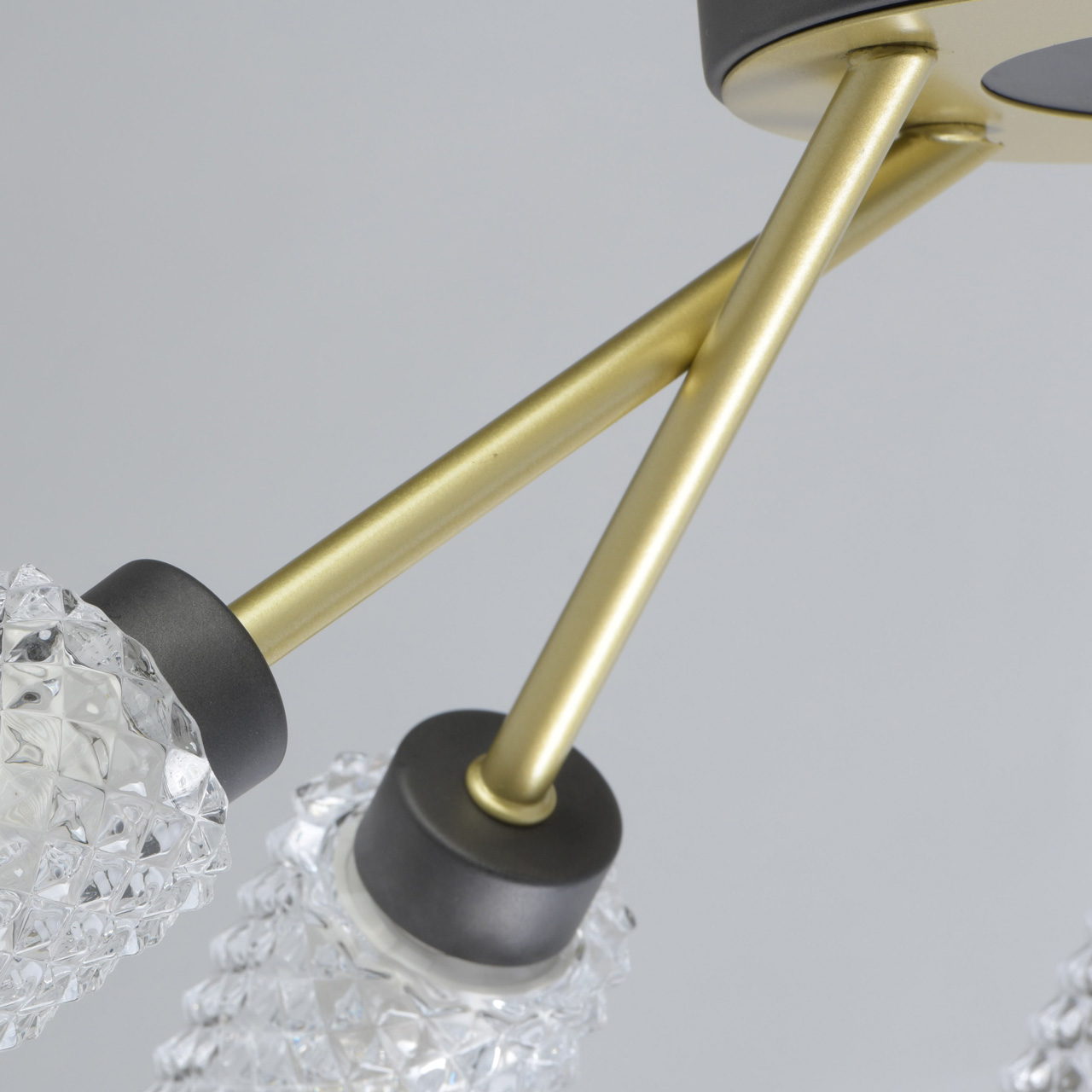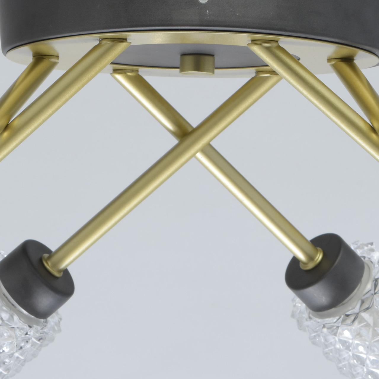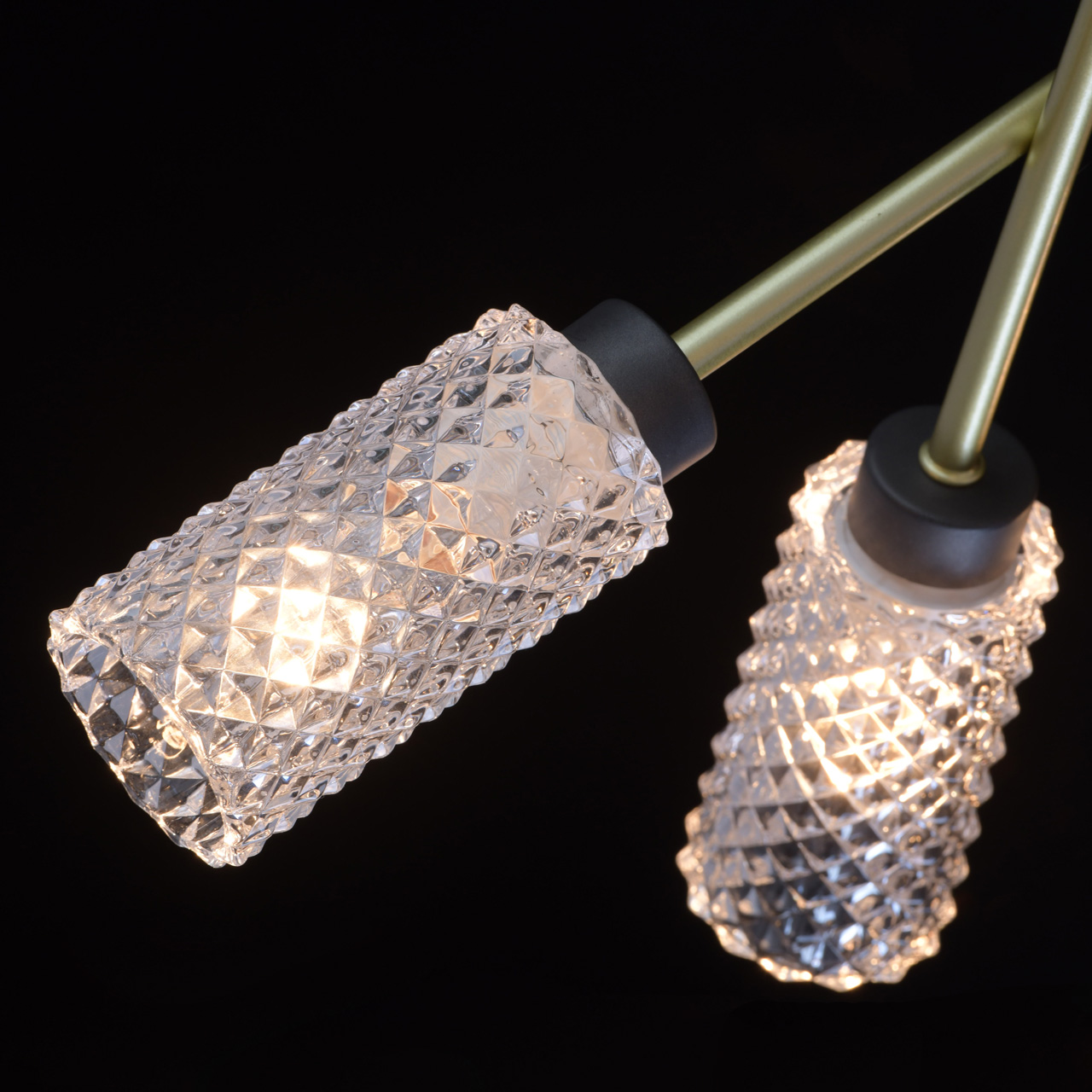 Основание светильника выполнено из металла. Потолочная чаша и держатели плафонов окрашены в темно-серый цвет. Рожки окрашены в цвет матового самородного золота. Светильник декорирован прозрачными стеклянными плафонами, отлитыми в сложную форму.Тип помещения
