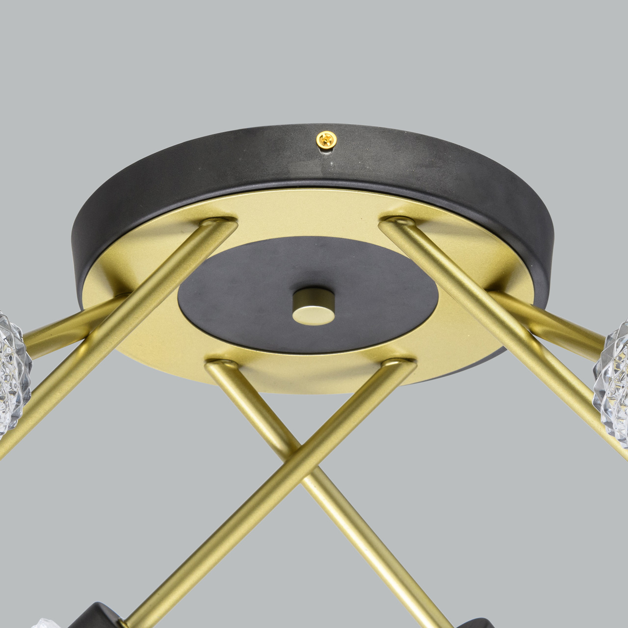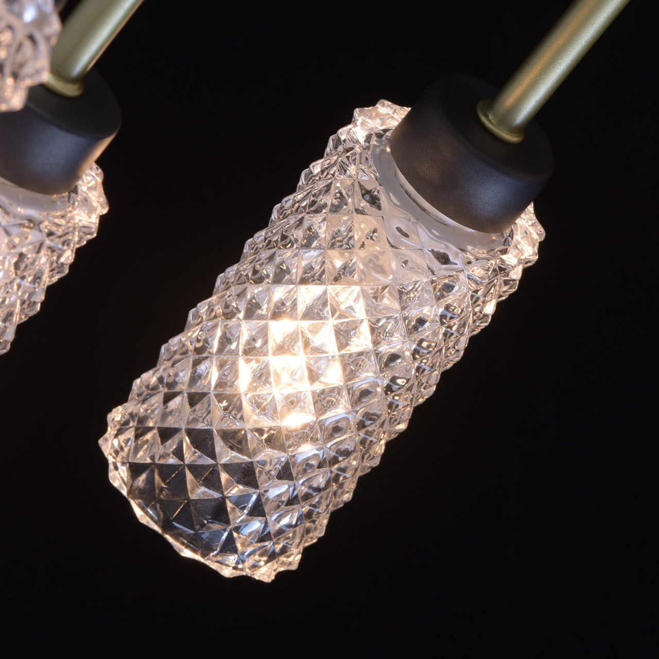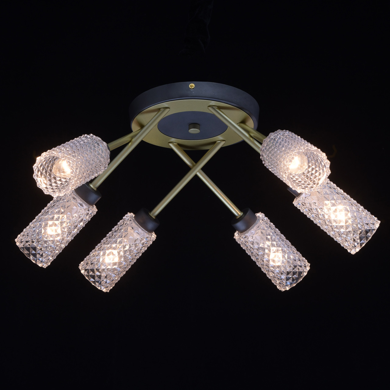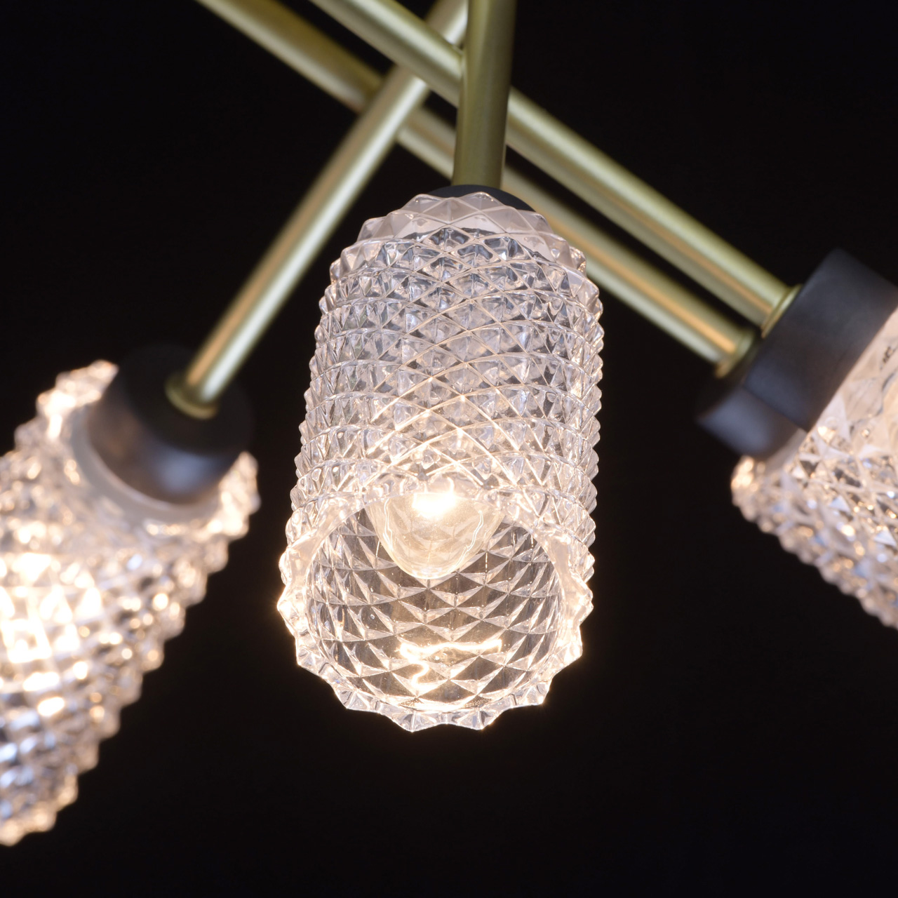 Основание светильника выполнено из металла. Потолочная чаша и держатели плафонов окрашены в темно-серый цвет. Рожки окрашены в цвет матового самородного золота. Светильник декорирован прозрачными стеклянными плафонами, отлитыми в сложную форму.Тип помещения