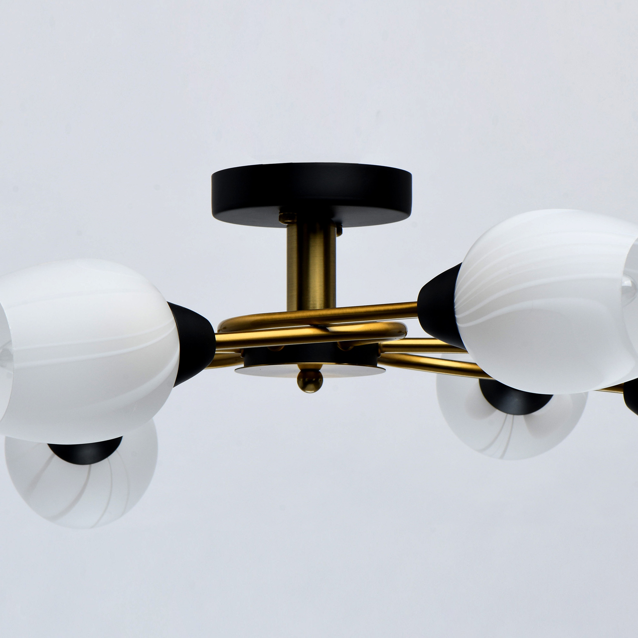 Актуальное сочетание металлического основания черного цвета и бронзы. Плафоны гладкого матового стекла с природным рисунком мягко рассеивают свет. Компактная высота модели идеальна для стандартной высоты потолка. Полная семья из бра, потолочного светильника на 6 и 8 ламп.Стилевые решения интерьера