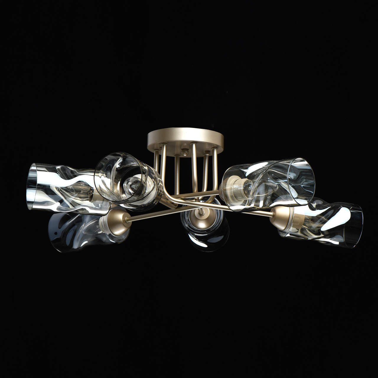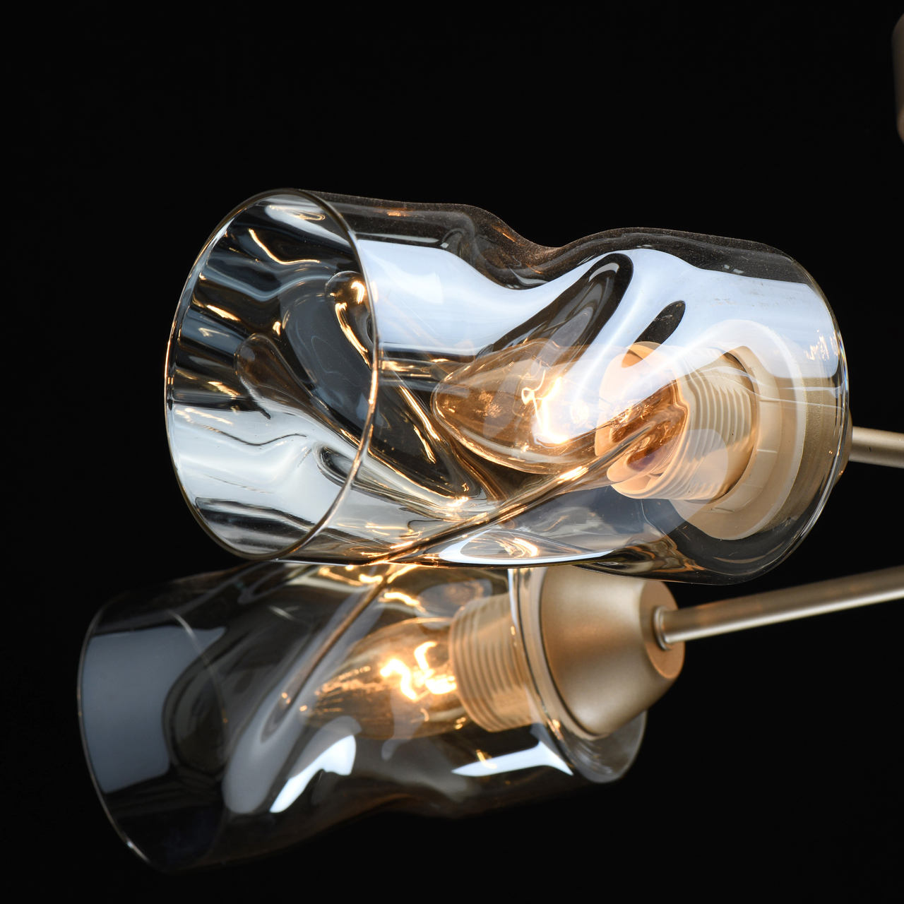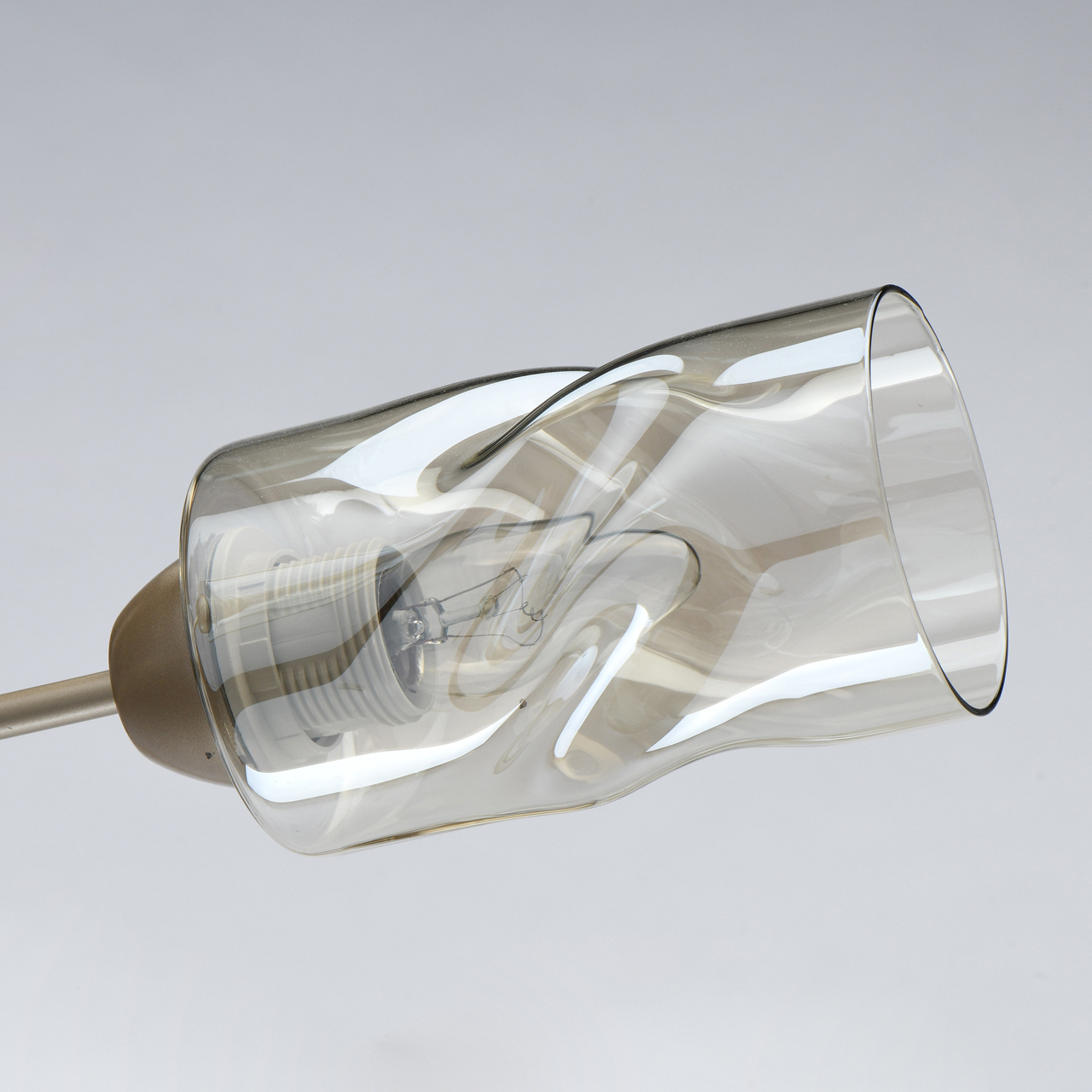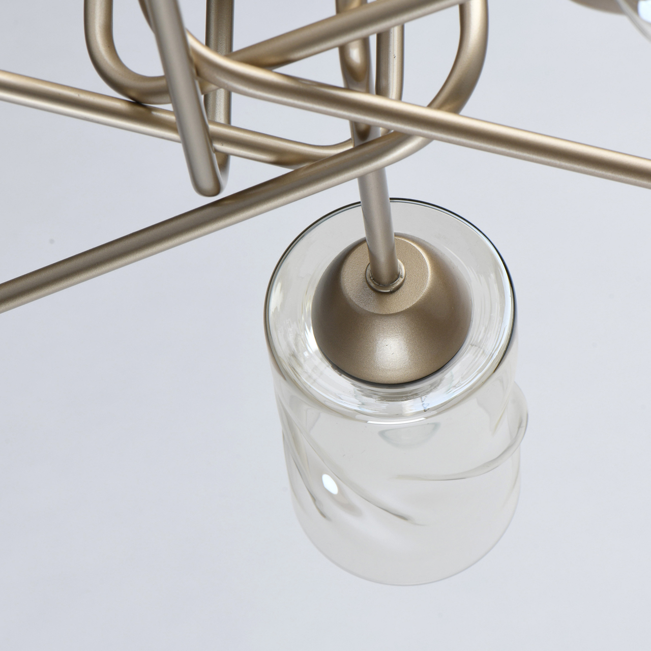 Трендовый цвет перламутрового золота основания актуален для современных интерьеров. Плафоны скрученной формы из тонированного стекла обеспечивают мягкий световой поток. Компактная высота модели идеальна для стандартной высоты потолка. Заменяемые источники света удобны в эксплуатации.Стилевые решения интерьера