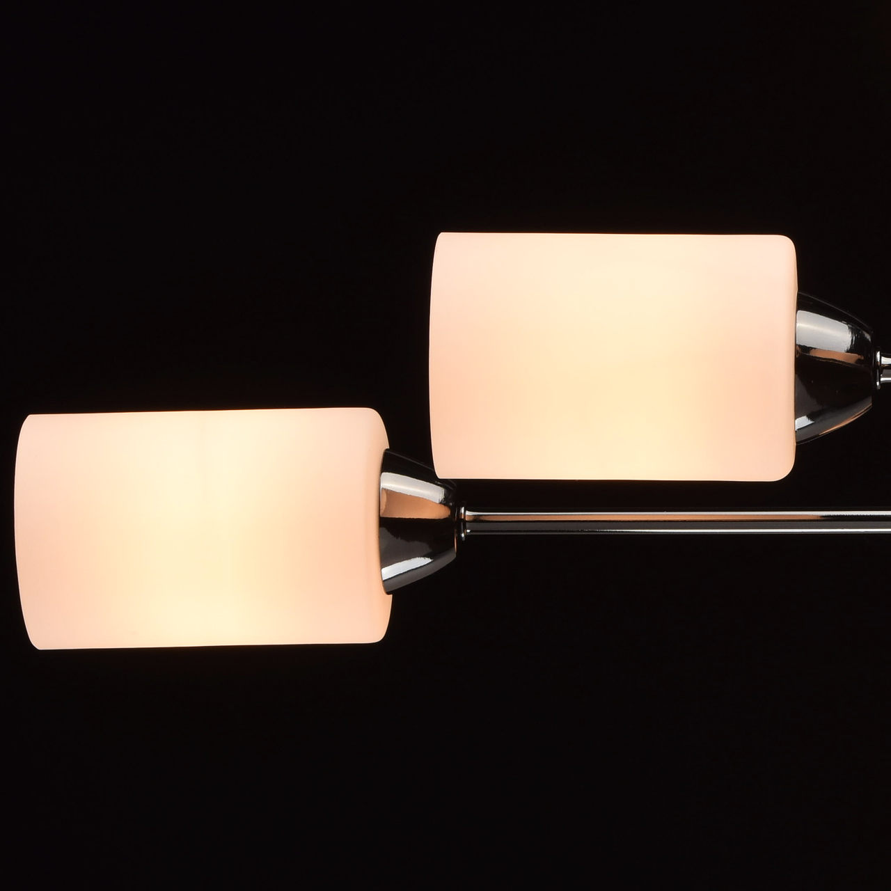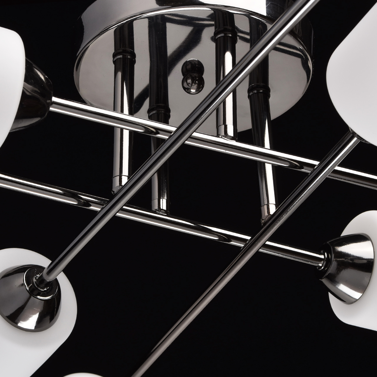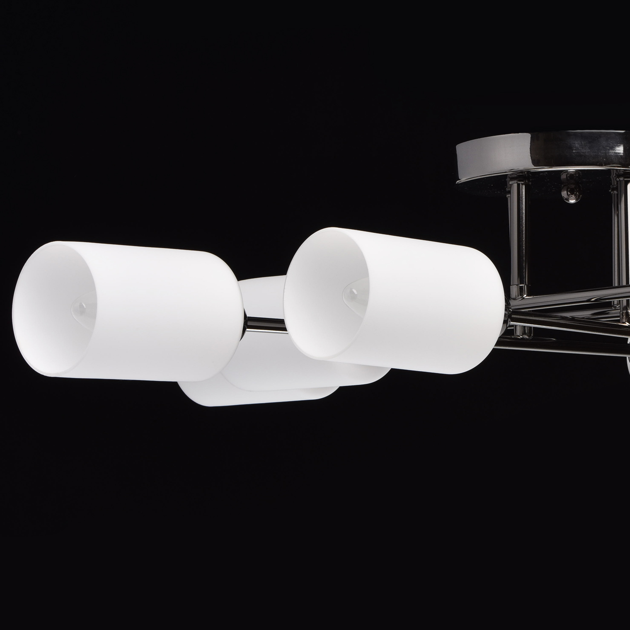 Основание светильника выполнено из металла и гальванизировано в цвет хрома. Потолочная чаша и держатели плафонов изготовлены по технологии обработки на токарном станке. Плафоны: стекло, отлито в форму. Плафоны матированы, изнутри окрашены в белый цвет.Тип помещения