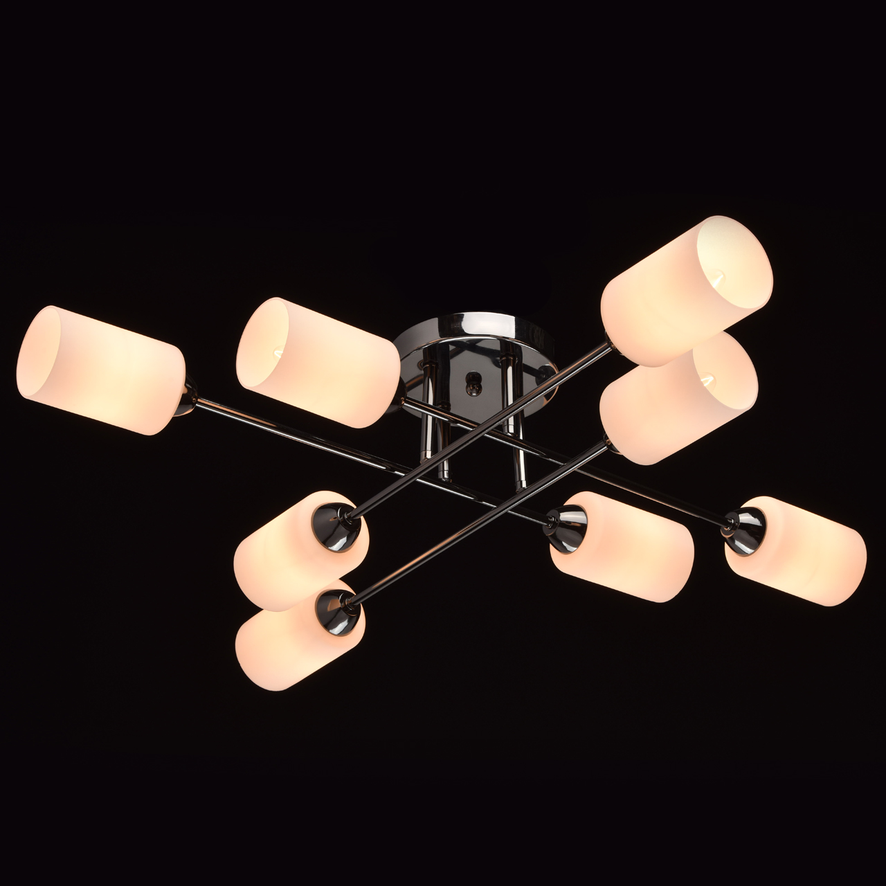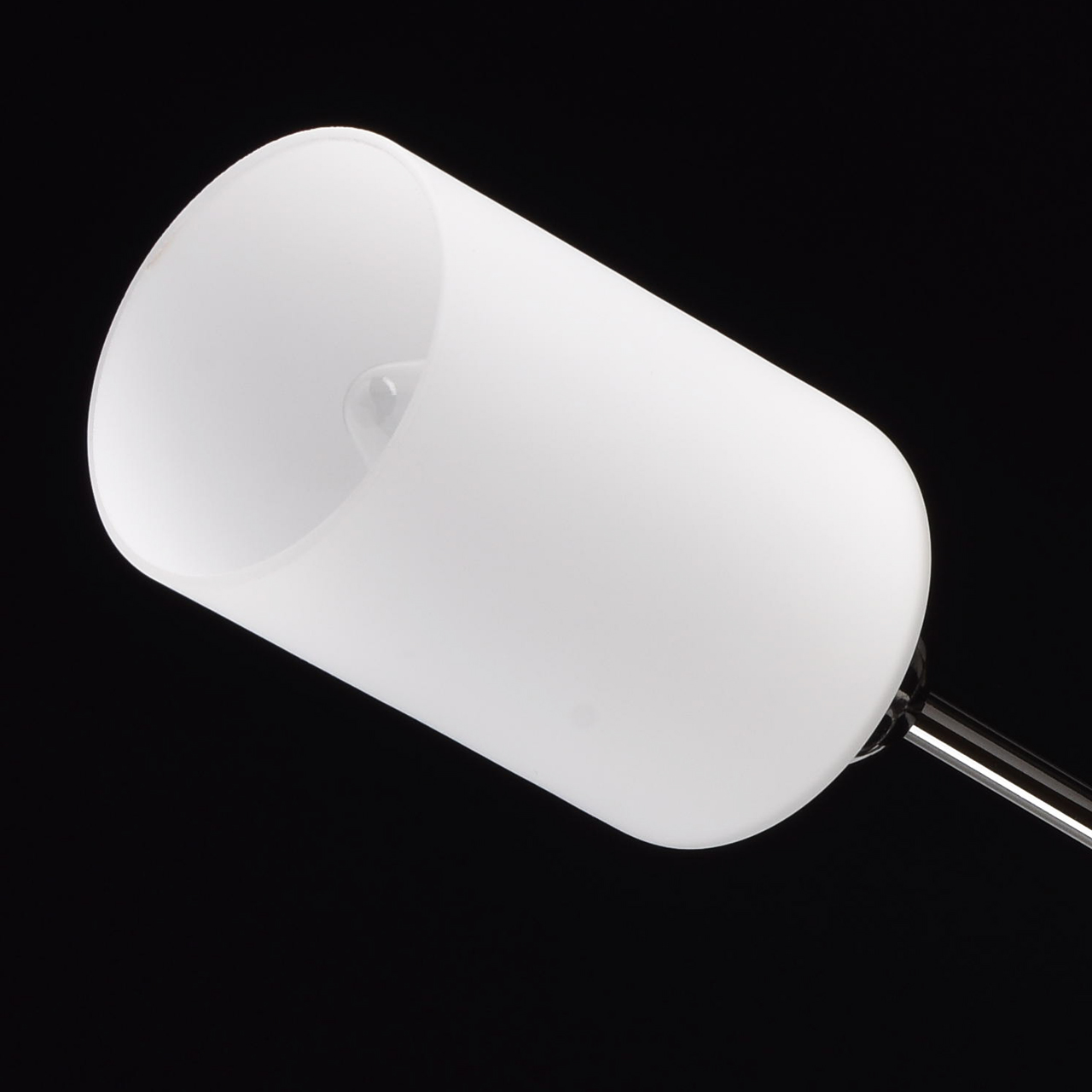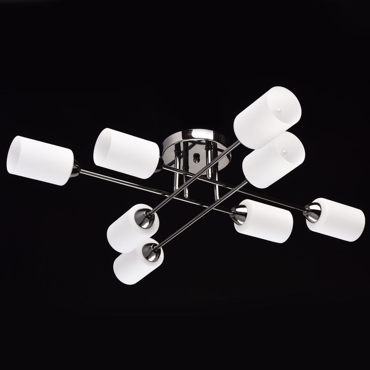 Основание светильника выполнено из металла и гальванизировано в цвет хрома. Потолочная чаша и держатели плафонов изготовлены по технологии обработки на токарном станке. Плафоны: стекло, отлито в форму. Плафоны матированы, изнутри окрашены в белый цвет.Тип помещения