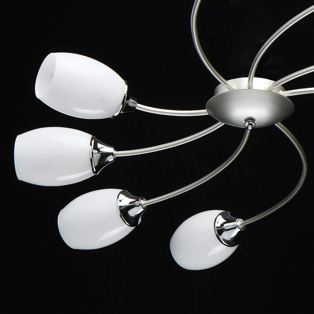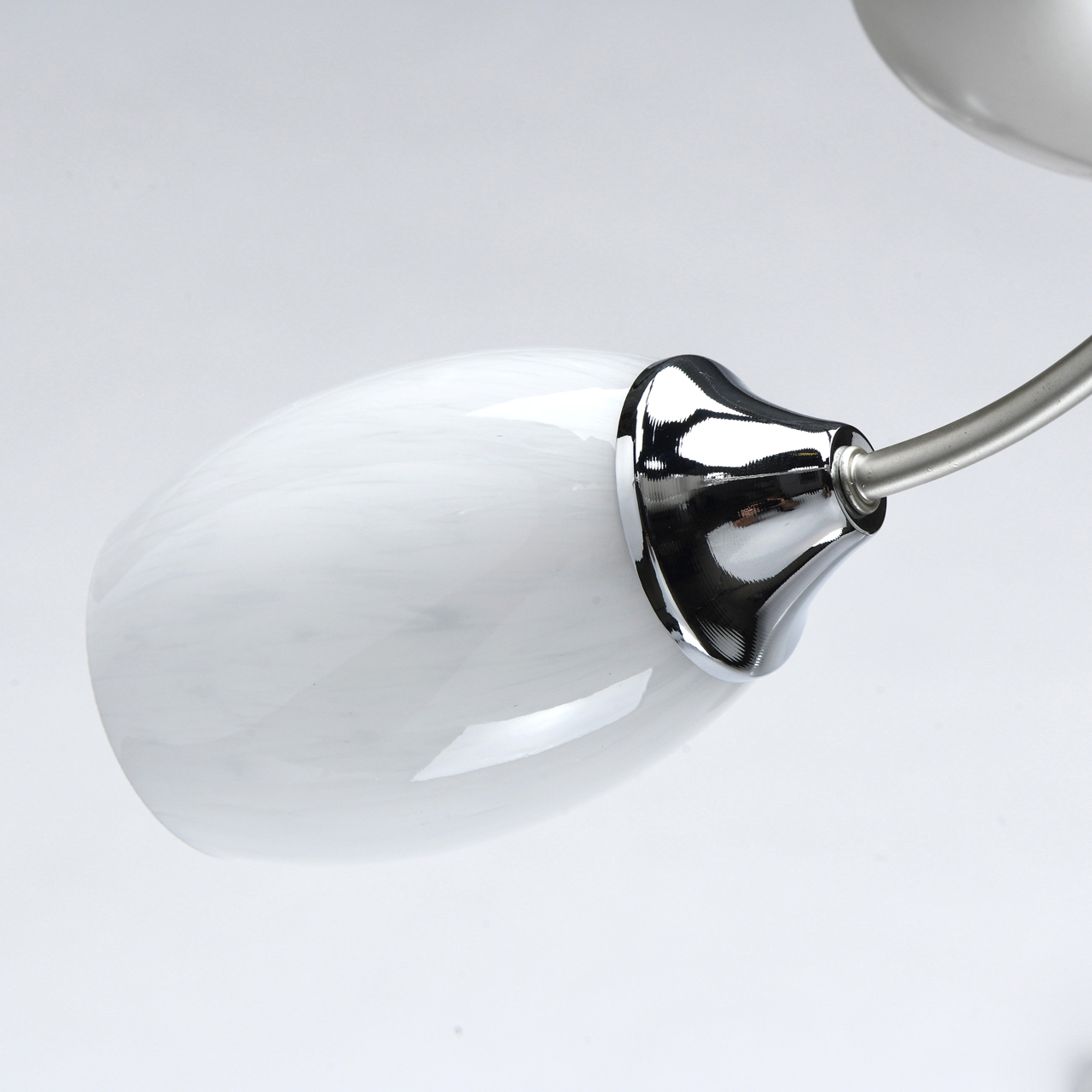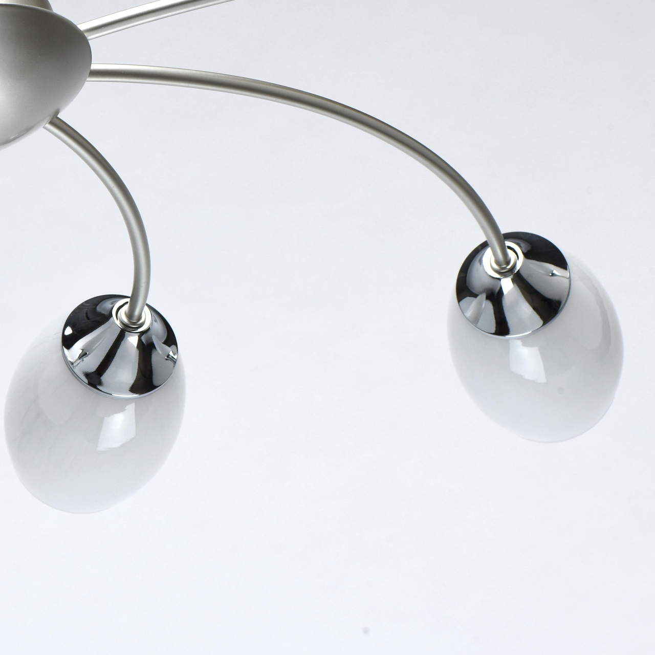 Основание светильника выполнено из металла и окрашено в цвет перламутрового серебра. Держатели плафонов гальванизированы в цвет хрома. Стеклянные плафоны фактурно окрашены изнутри в белый цвет.Тип помещения