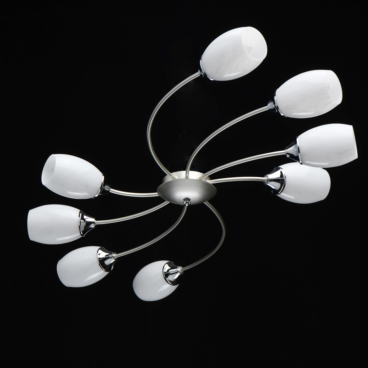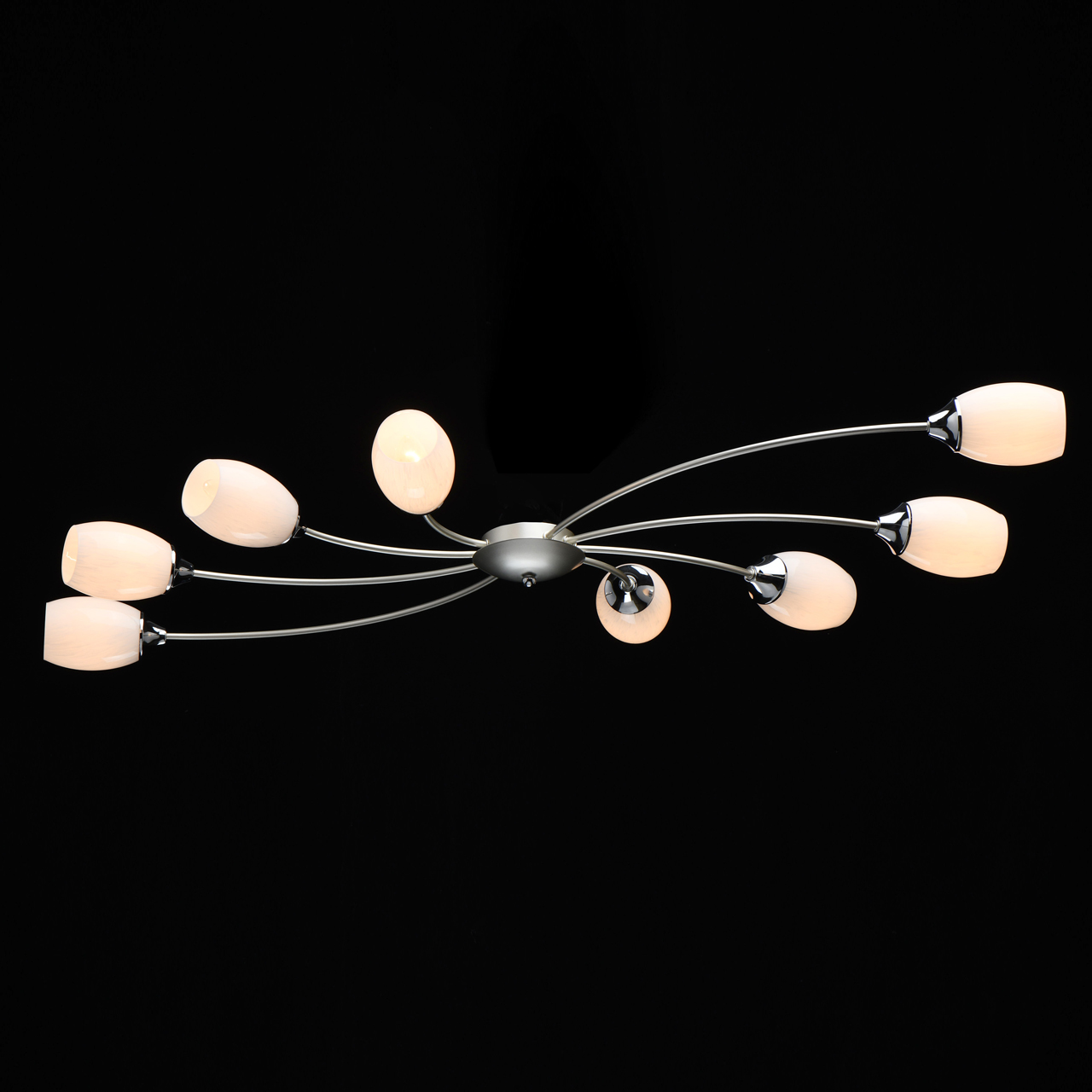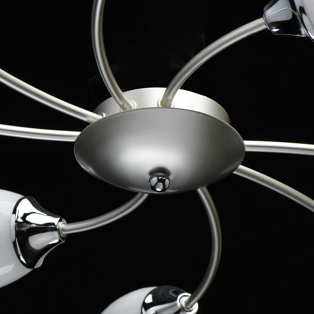 Основание светильника выполнено из металла и окрашено в цвет перламутрового серебра. Держатели плафонов гальванизированы в цвет хрома. Стеклянные плафоны фактурно окрашены изнутри в белый цвет.Тип помещения