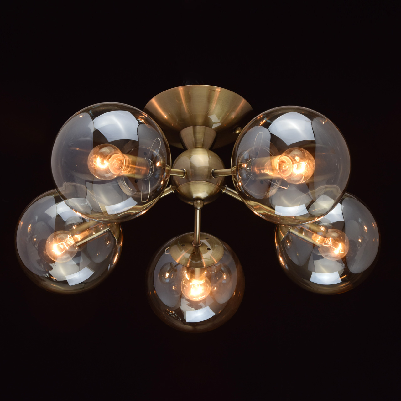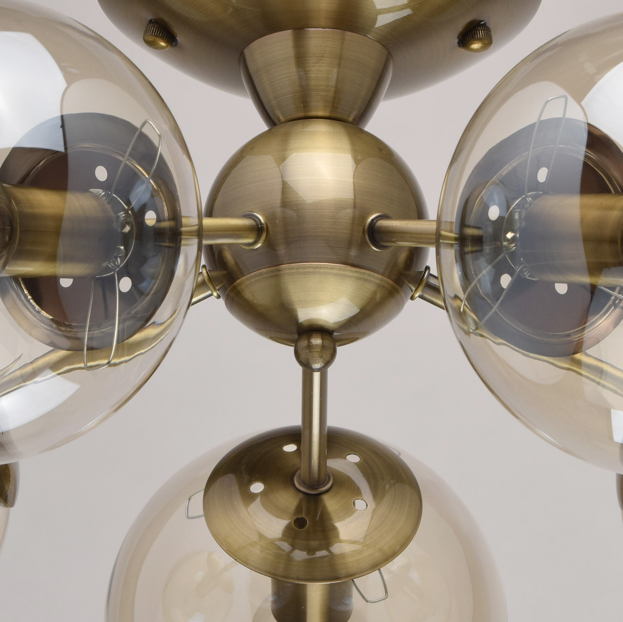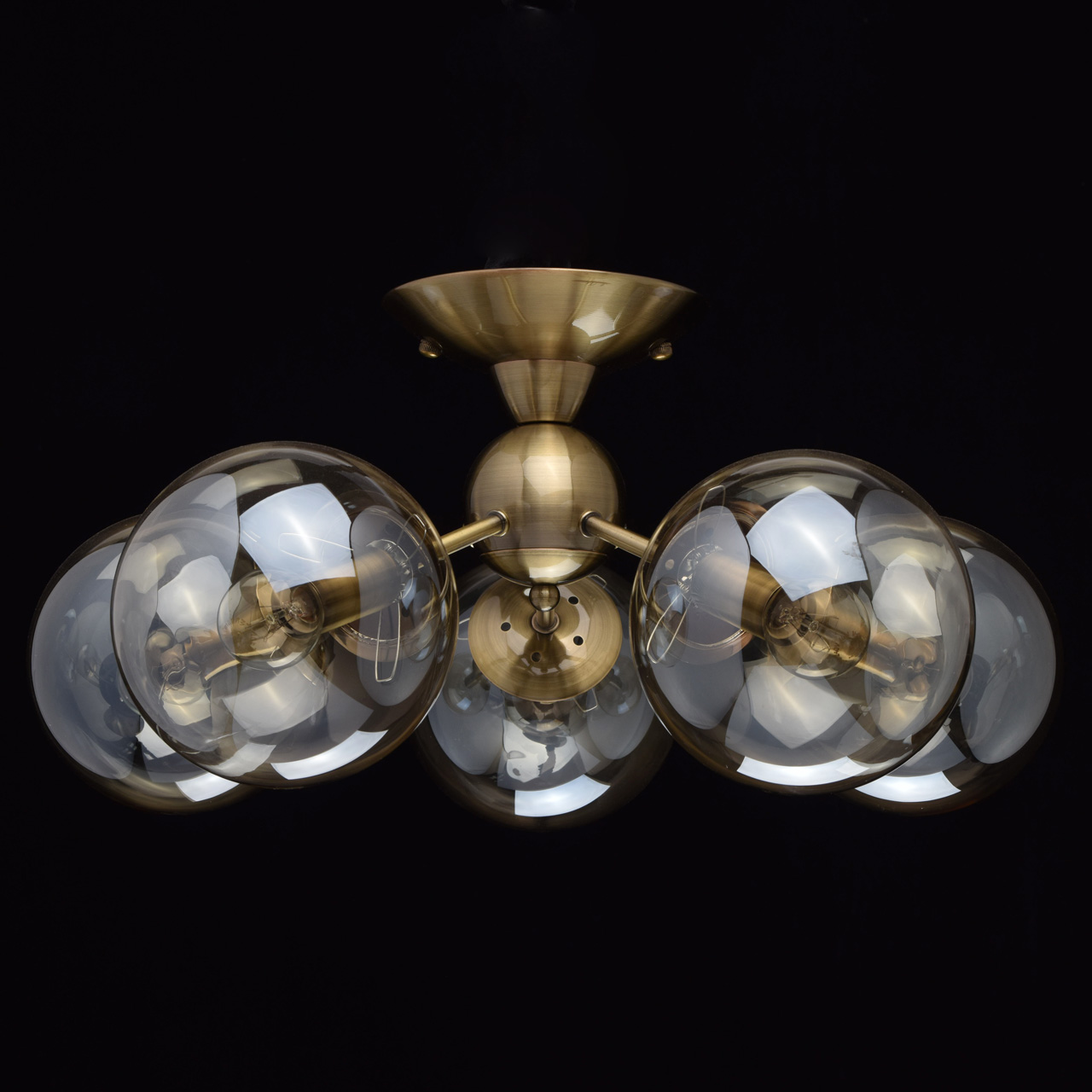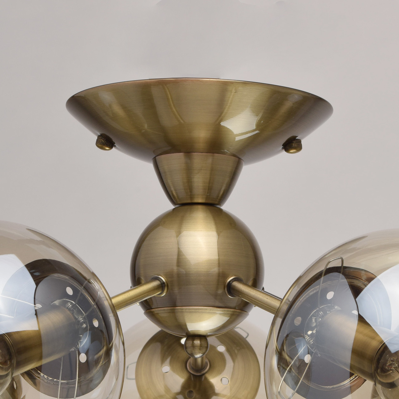 Основание: металл, гальванизация в цвет античной бронзы, лакирование. Потолочная чаша, корпус и держатели плафонов изготовлены по технологии обработки на токарном станке. Плафоны: стекло отлитое в форму, гальванизация в цвет шампань.Тип помещения