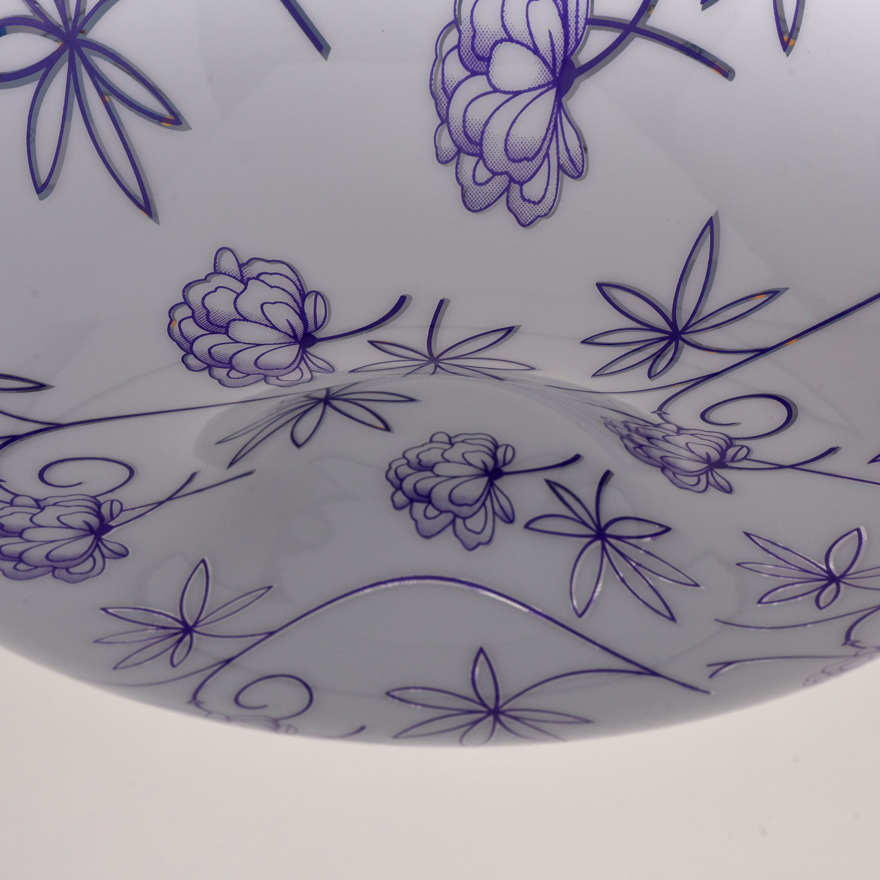 Оригинальный дизайн люстры из коллекции «Омега» прекрасно разнообразит интерьер. Белое металлическое основание дополнено широким глянцевым абажуром из акрила того же оттенка. Главная изюминка светильника – изящный флористический рисунок. На белом фоне контрастный фиолетовый цвет смотрится очень эффектно.Преимущества модели