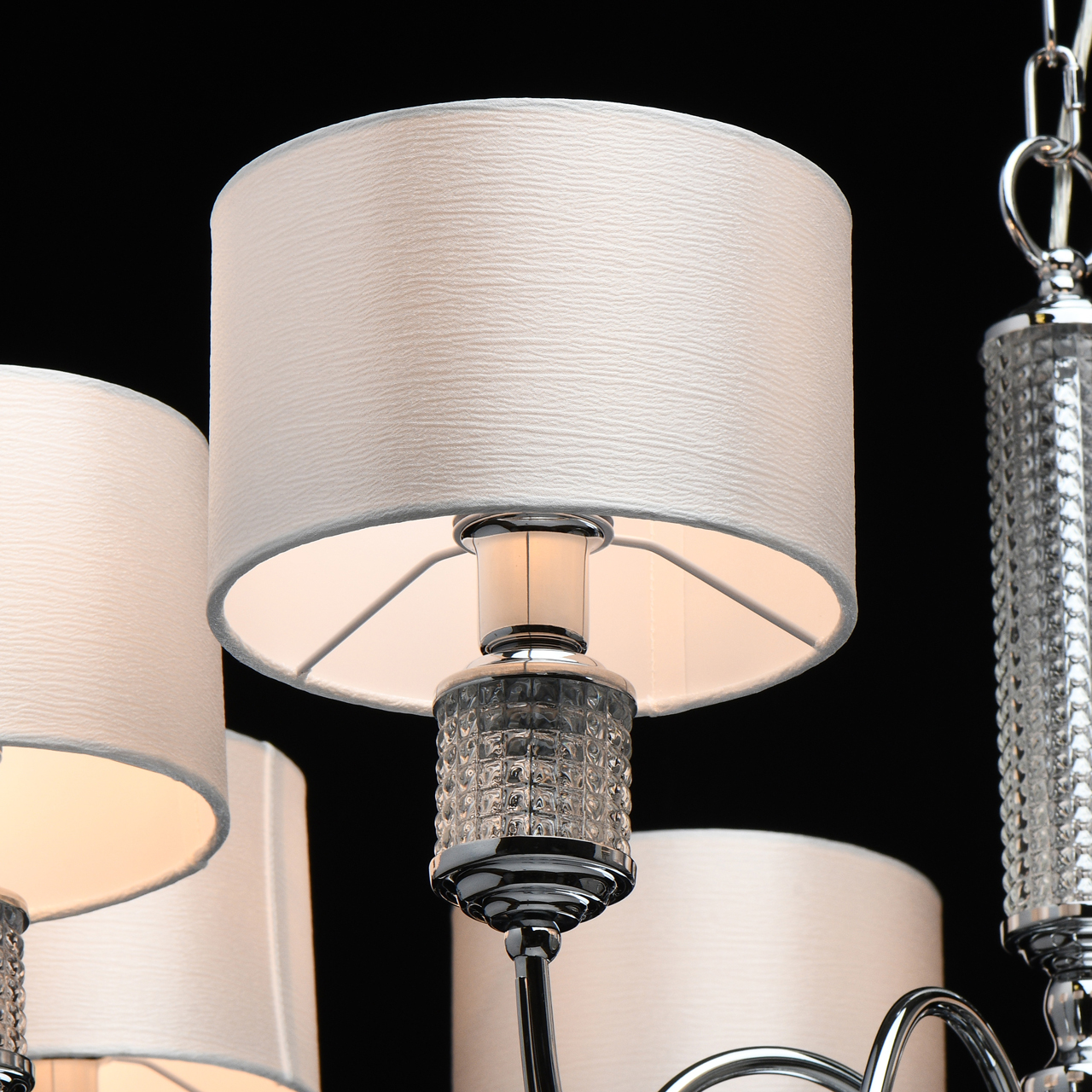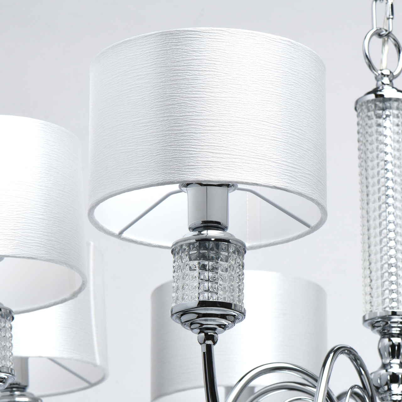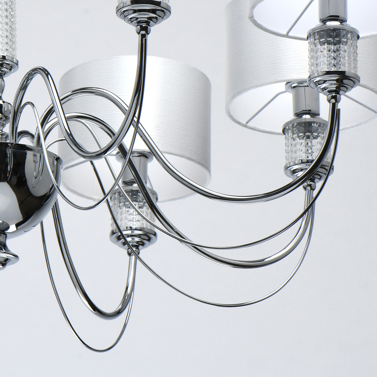 Основание светильника выполнено из металла и гальванизировано в цвет хрома. Текстильные абажура из белого атласа, внутри с термостойким акрилом, прошиты. Декор на рожках и центральной оси из прозрачного фактурного стекла.Тип помещения