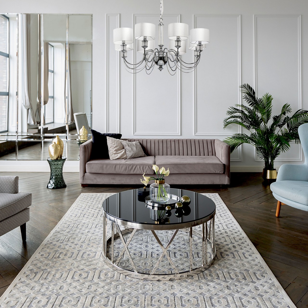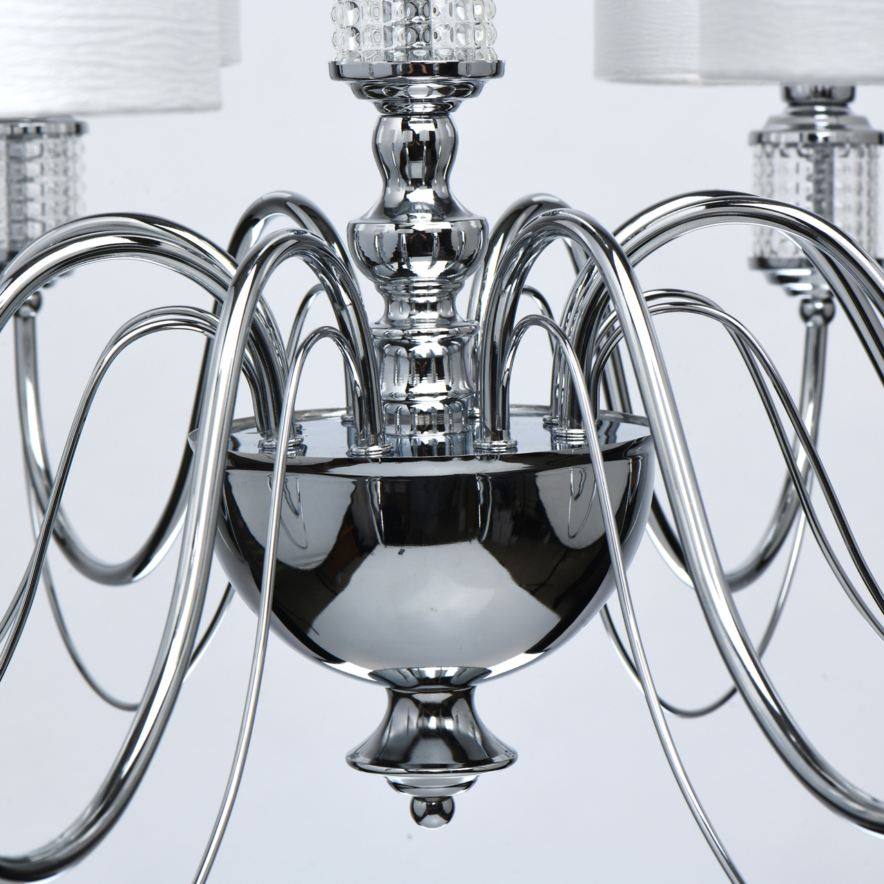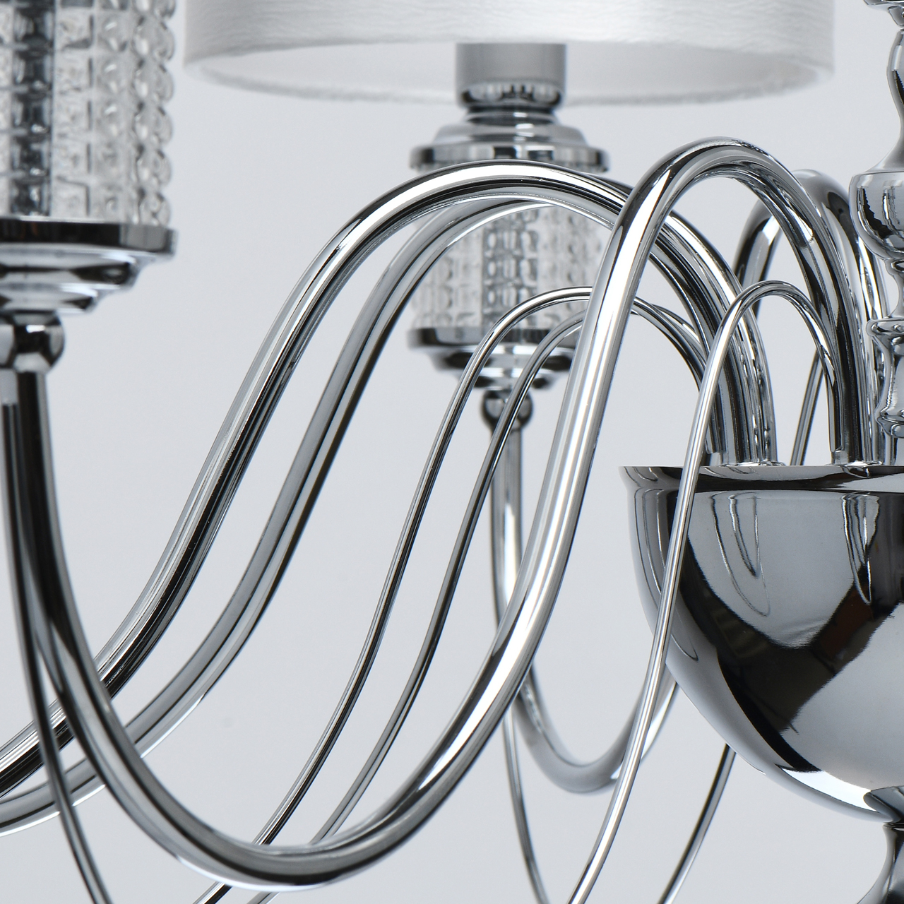 Основание светильника выполнено из металла и гальванизировано в цвет хрома. Текстильные абажура из белого атласа, внутри с термостойким акрилом, прошиты. Декор на рожках и центральной оси из прозрачного фактурного стекла.Тип помещения