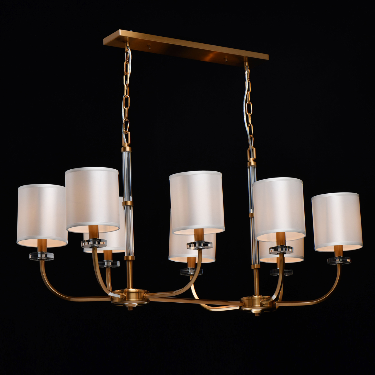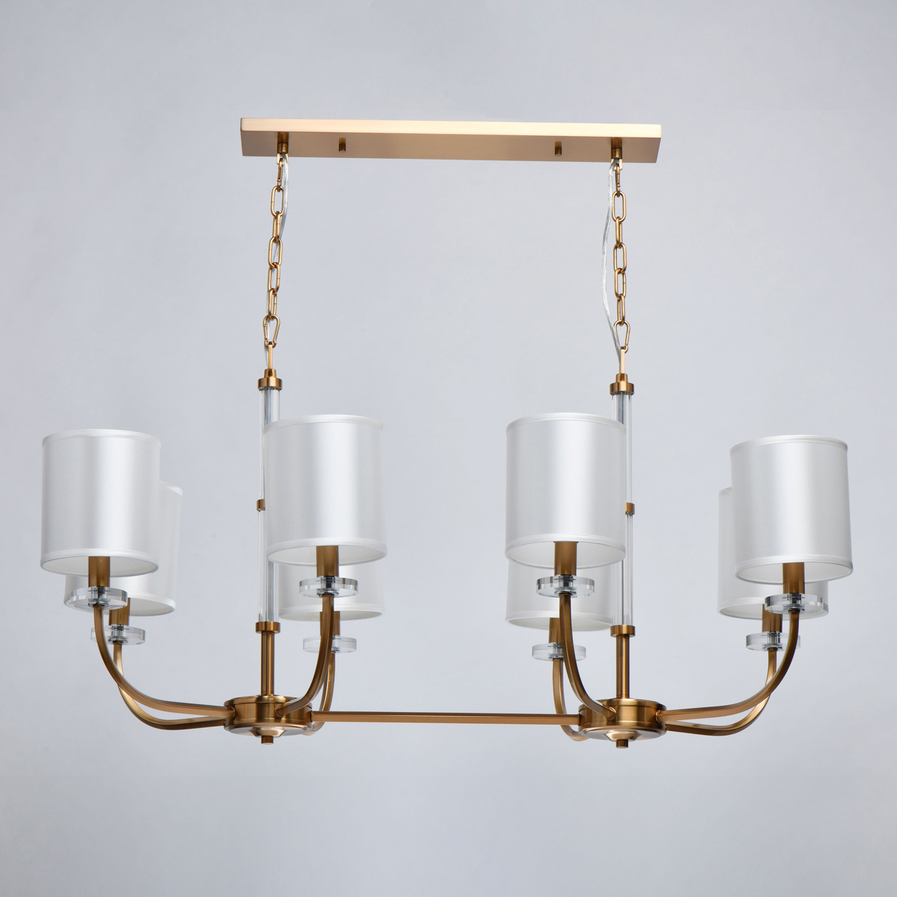 Модный минимализм в американском стиле придает актуальности интерьеру. Абажуры рисово-белого цвета смягчают строгость форм. Полная семья решает задачи общего и зонального освещения. Трендовые цвета в коллекции, хрома и бронзы, универсальны в любом интерьере.Стилевые решения интерьера