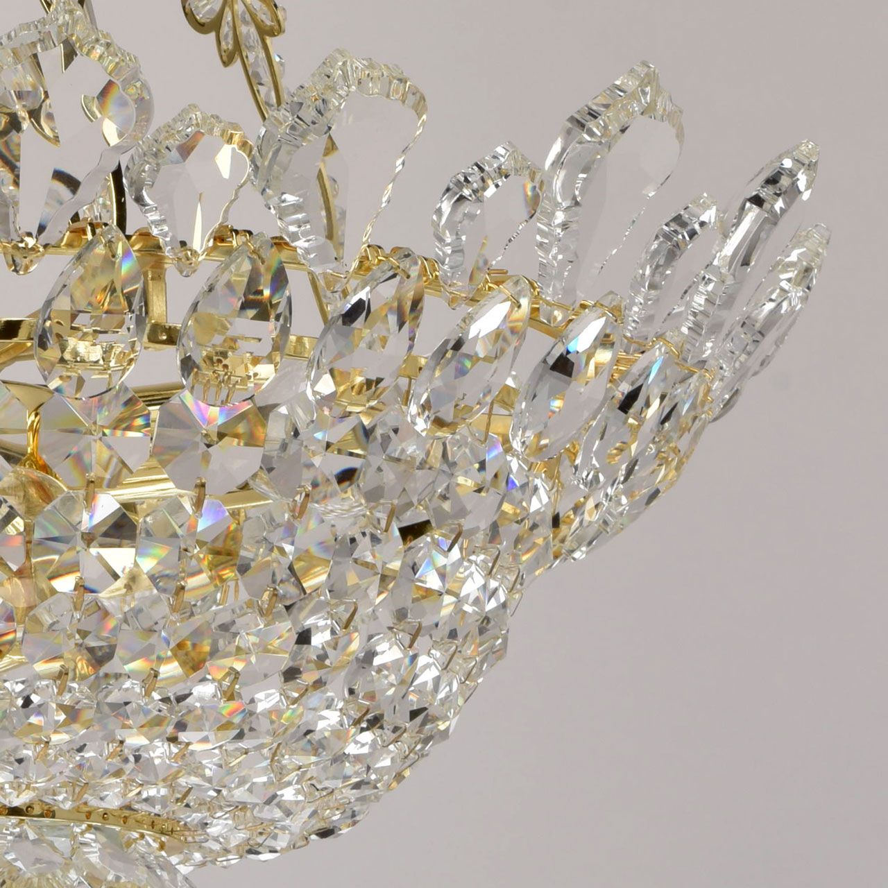 Основание: металл, гальванизация в цвет золота. Плафон: металлический каркас в цвет основания, декорирован крупным прозрачным хрусталем различных форм и огранки. Для декора используется более 6 видов хрусталя. Декор: центральная декоративная розетка из массива хрусталя. Декоративные подвесы: из хрустальных бусин, собранных во флористическую композицию.Тип помещения