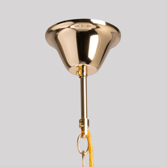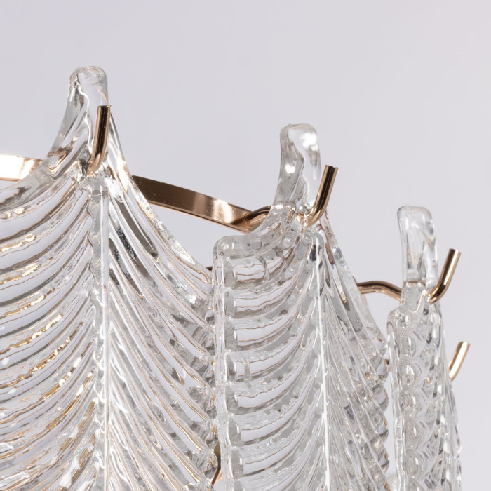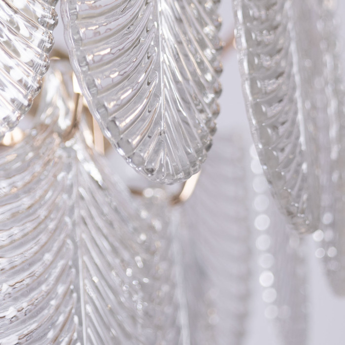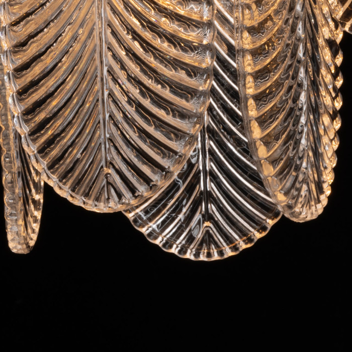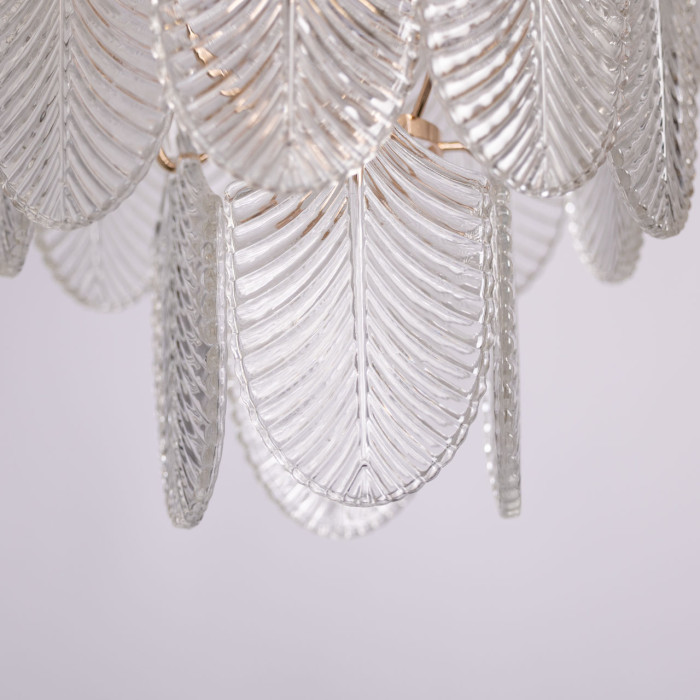 Цвет золота придает люстре элегантности. Стеклянный декор в форме листьев добавляет природной красоты. Сочетание материалов, форм и оттенков создает впечатляющий визуальный эффект и привлекает внимание к светильнику. Заменяемые источники света удобны в эксплуатации. Возможность регулировать комфортную высоту.Металлическое основание подвесной люстры гальванизировано в цвет золота. Светильник декорирован прозрачными стеклянными пластинами в форме листьев.