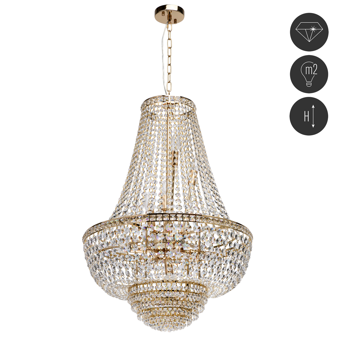 Двунаправленный свет за счет верхнего и нижнего ярусов светильника. Хрустальный декор украшает люстру и создает красивую игру света. Полностью собран для удобства установки. Увеличенная длина цепи 2 м для освещения парадных помещений с высокими потолками Полная семья решает задачи общего и зонального освещения.Стилевые решения интерьера
