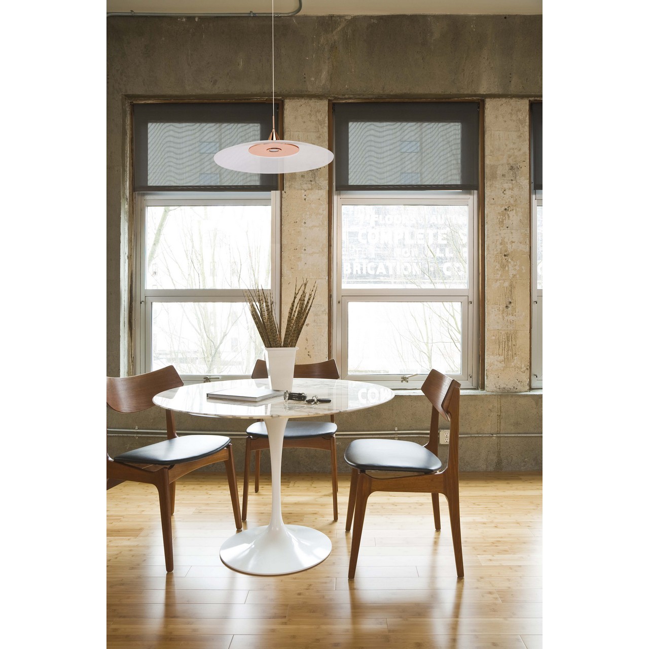Люстра из коллекции «Платлинг» станет прекрасным решением для зональной подсветки современной обстановки.Металлическое основание цвета розового золота подчеркнуто широким плоским плафоном из матового акрила. Модель будет гармонично смотреться в интерьерах в стиле лофт, минимализм.Преимущества модели