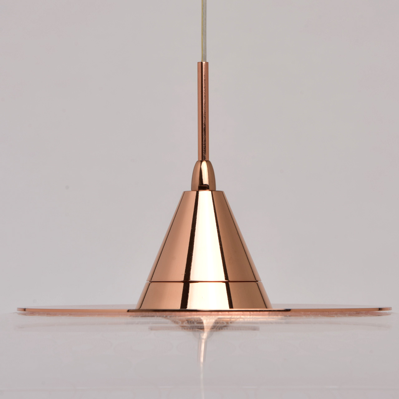 Металлическое основание цвета меди. Плафон из прозрачного акрила.Технология производства