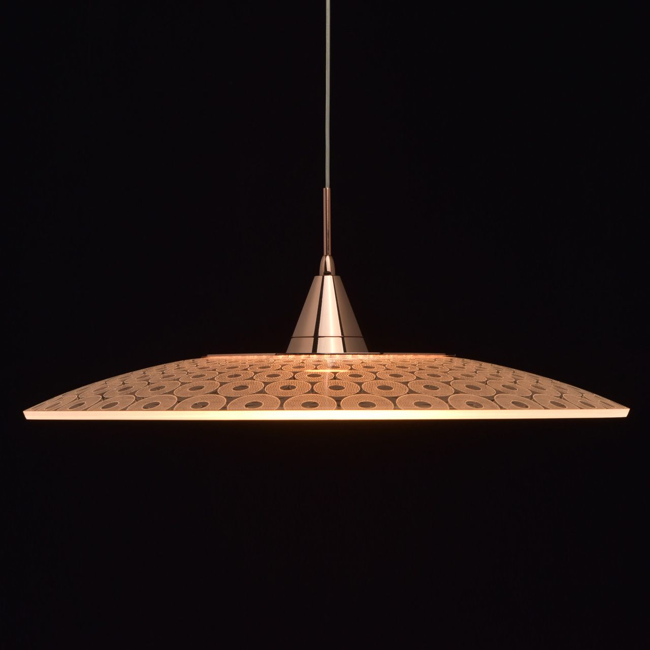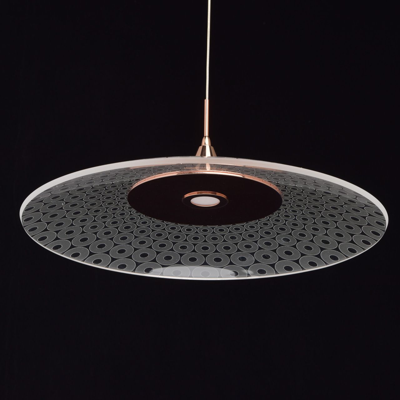 Основание: комбинация сплавов металлов, гальванизация в цвет меди. Потолочная чаша: металл. Центральная часть и держатель плафона: сплав алюминия. Плафон: прозрачный акрил, узор в виде окружностей нанесен по технологии цифровой печати. Светодиодный источник света типа SMD Сhip закрыт белым матовым акрилом.Тип помещения