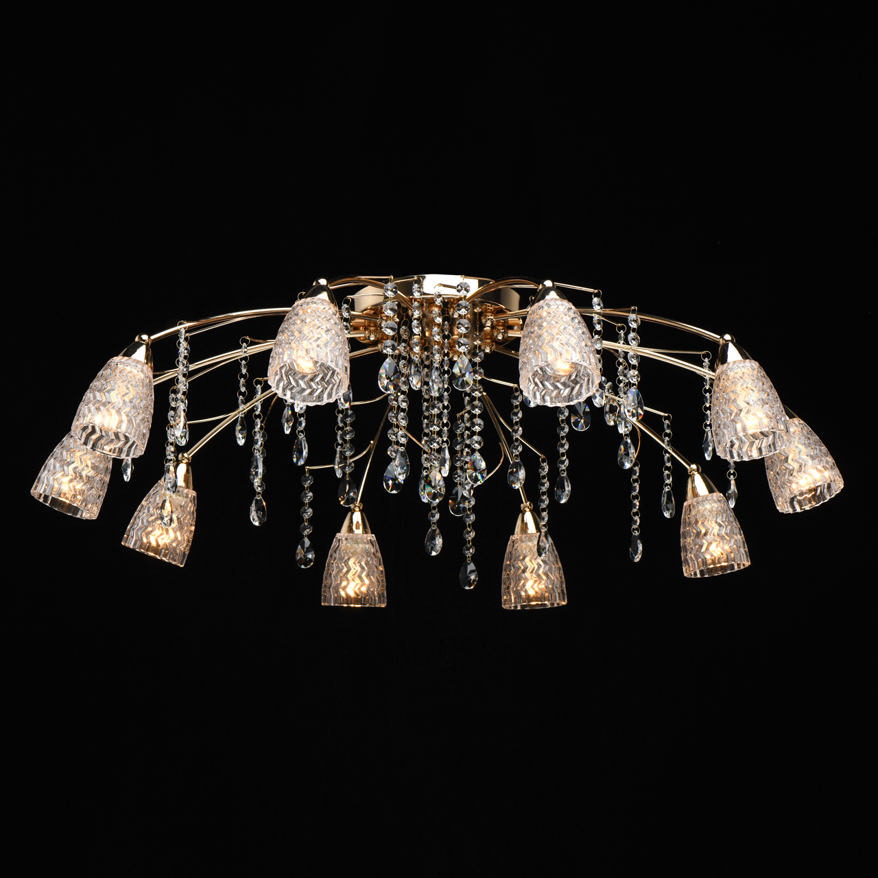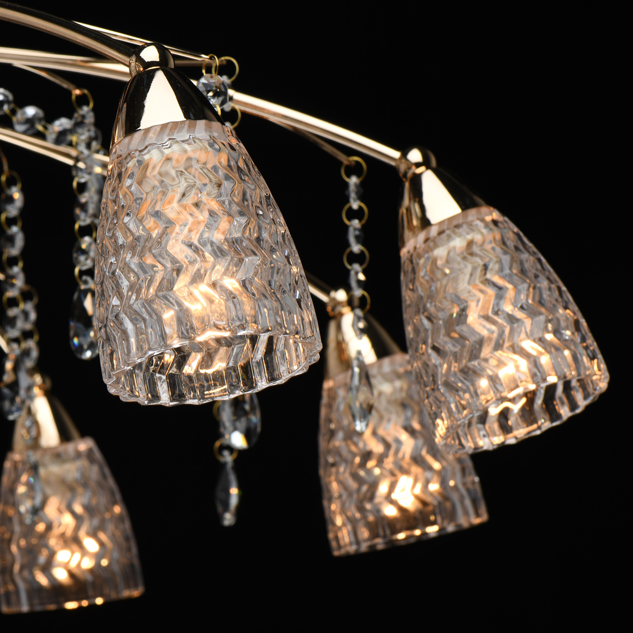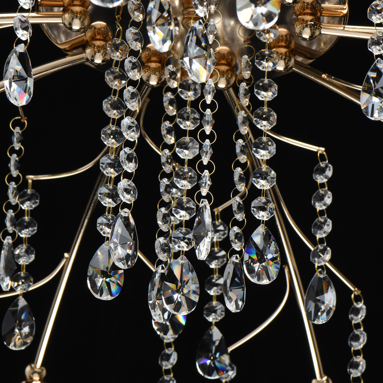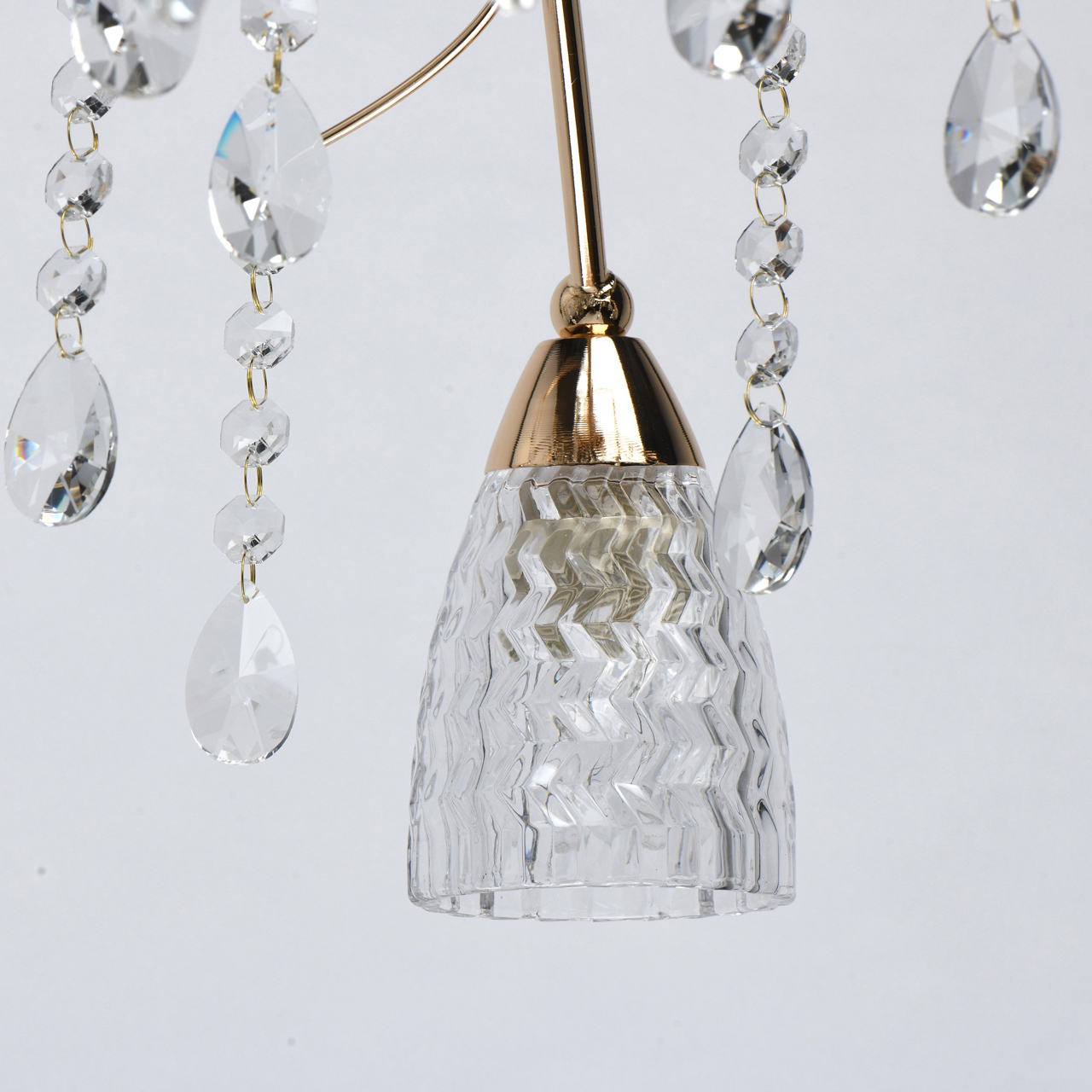 Основание светильника выполнено из металла и гальванизировано в цвет французского золота. Плафоны выполнены из прозрачного стекла, отлитого в сложную форму. Светильник декорирован прозрачным хрусталем формы миндаль и октагон.Тип помещения