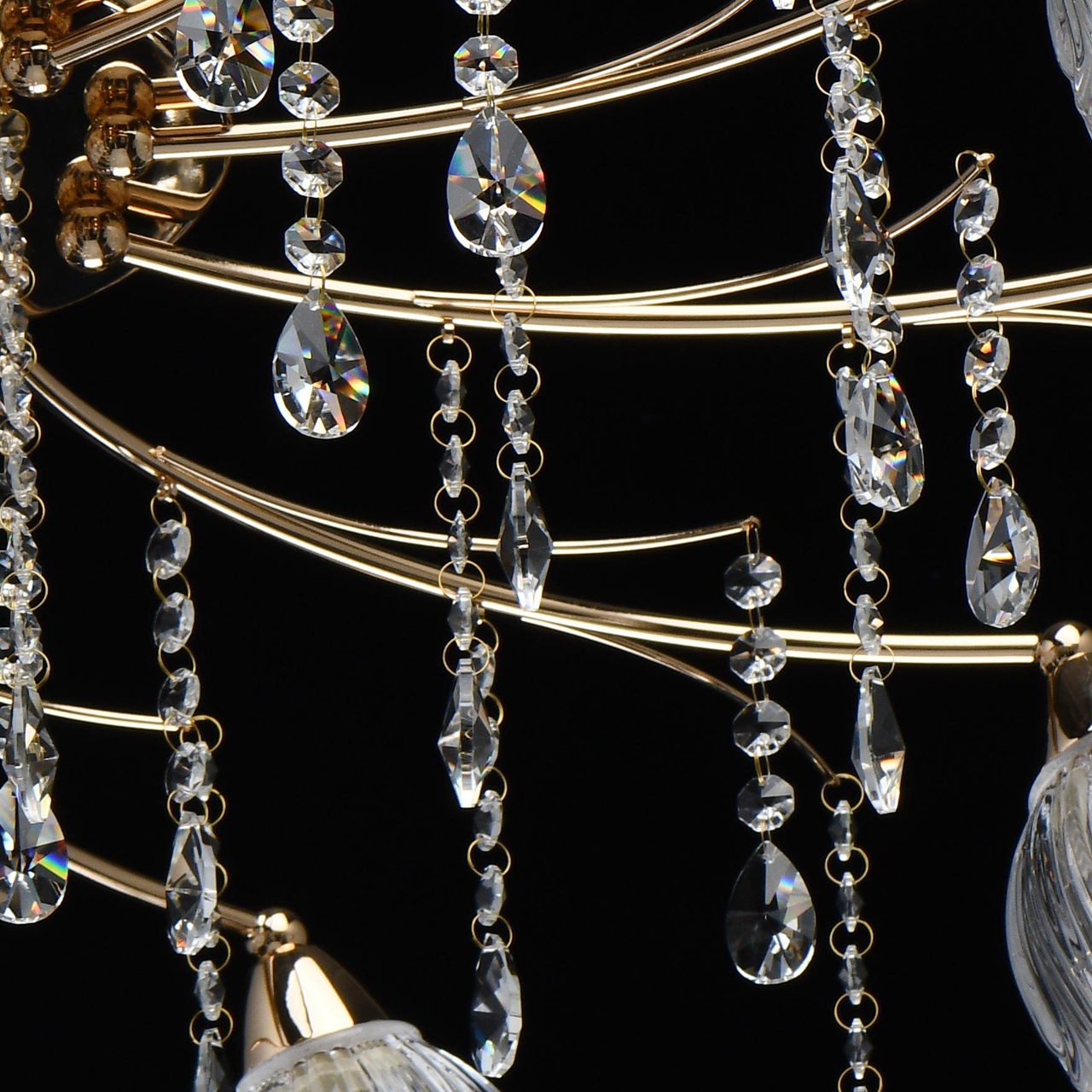 Популярный цвет золота основания светильника. Компактная высота светильника идеальна для стандартной высоты потолка. Декор стеклянных подвесок дополняет красоту модели. Широкий диаметр светильника обеспечивает высокие параметры освещения. Резные плафоны создают красивую игру света.Стилевые решения интерьера