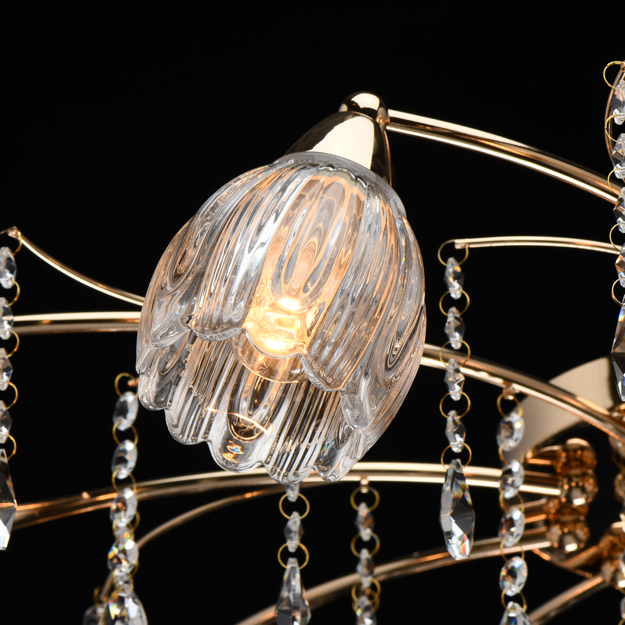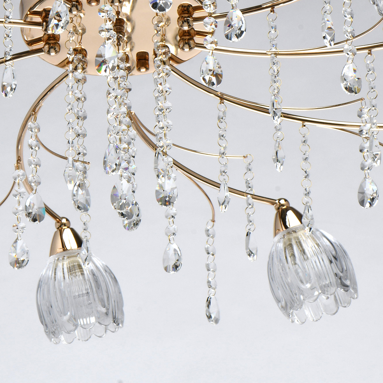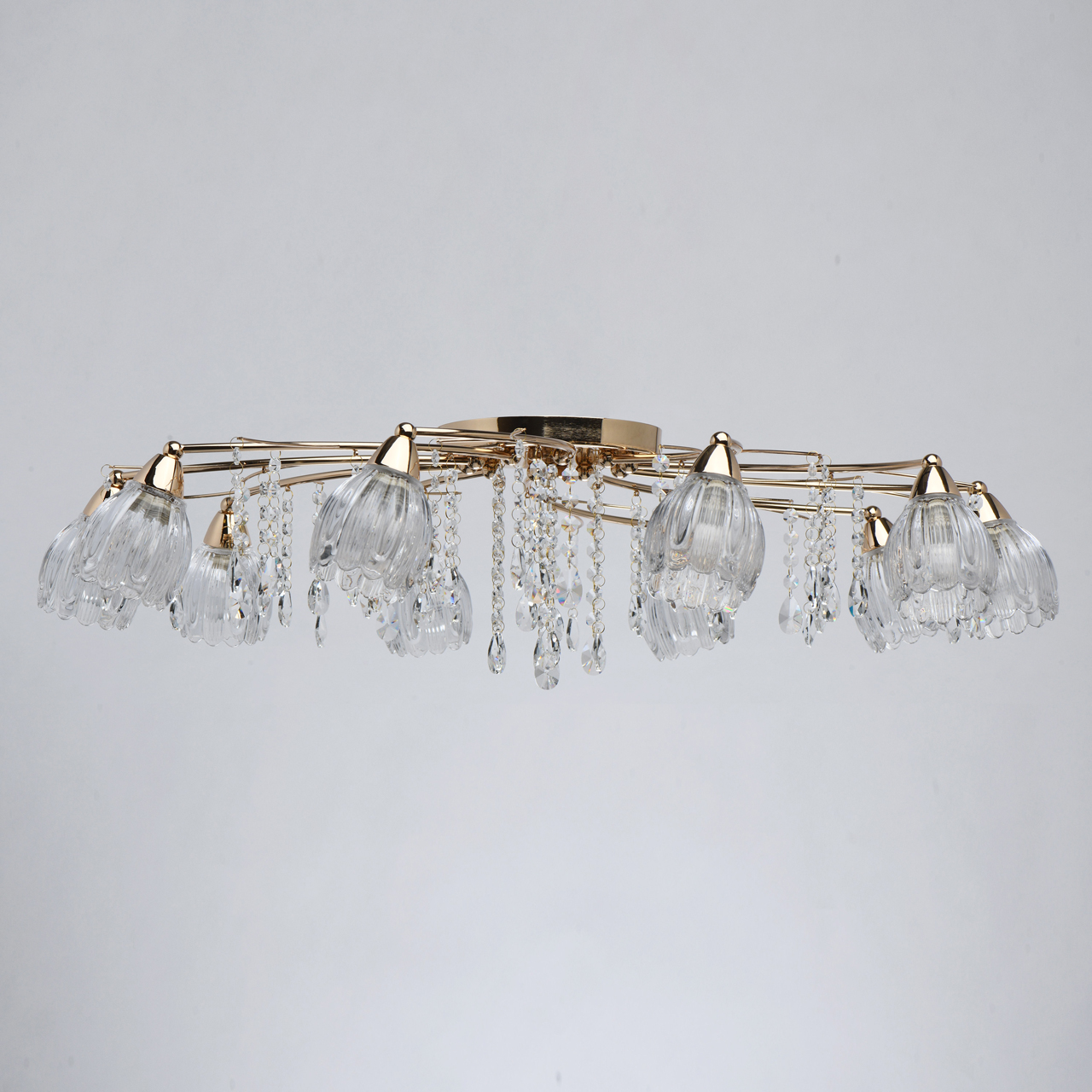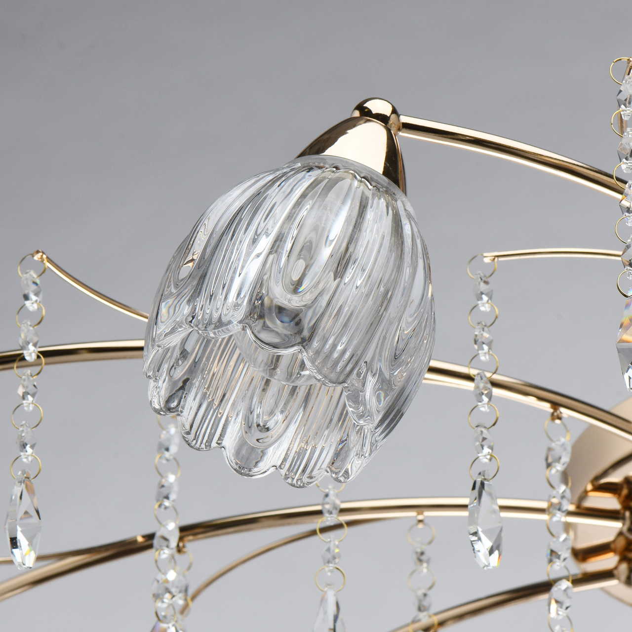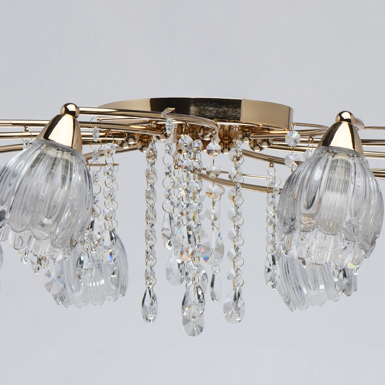 Основание светильника выполнено из металла и гальванизировано в цвет золота. Прозрачные стеклянные фактурные плафоны отлиты в сложную форму. Светильник декорирован прозрачным хрусталем.Тип помещения