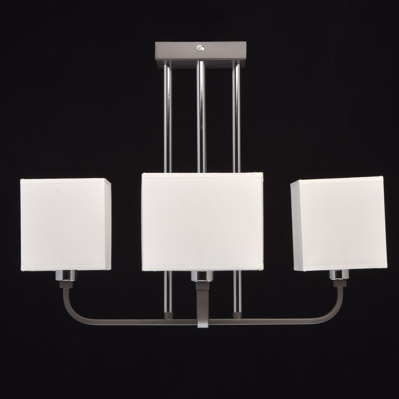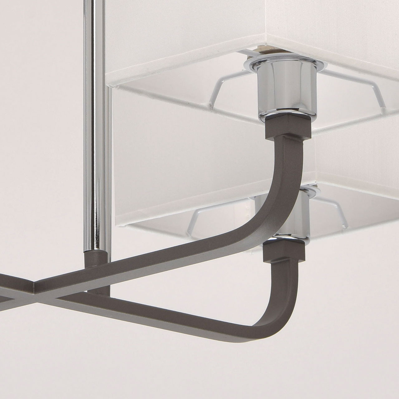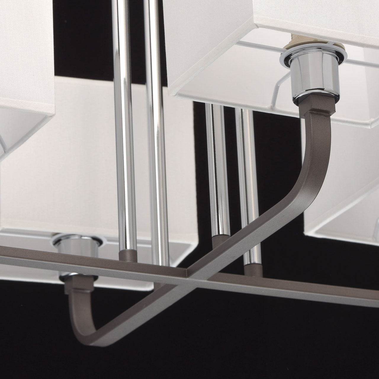 Смелые решения и строгая простота форм сочетаются в потолочной люстре из коллекции «Прато». Основание из металла матового графитового цвета гармонично дополнено хромированными стойками. Оригинальное пересечение рожков выгодно подчеркнуто тканевыми плафонами геометрически точной формы. Белый матовый оттенок, в котором выполнены плафоны, отлично смотрится на фоне основания. Сложно найти лучшее решение для современного интерьера!Преимущества модели