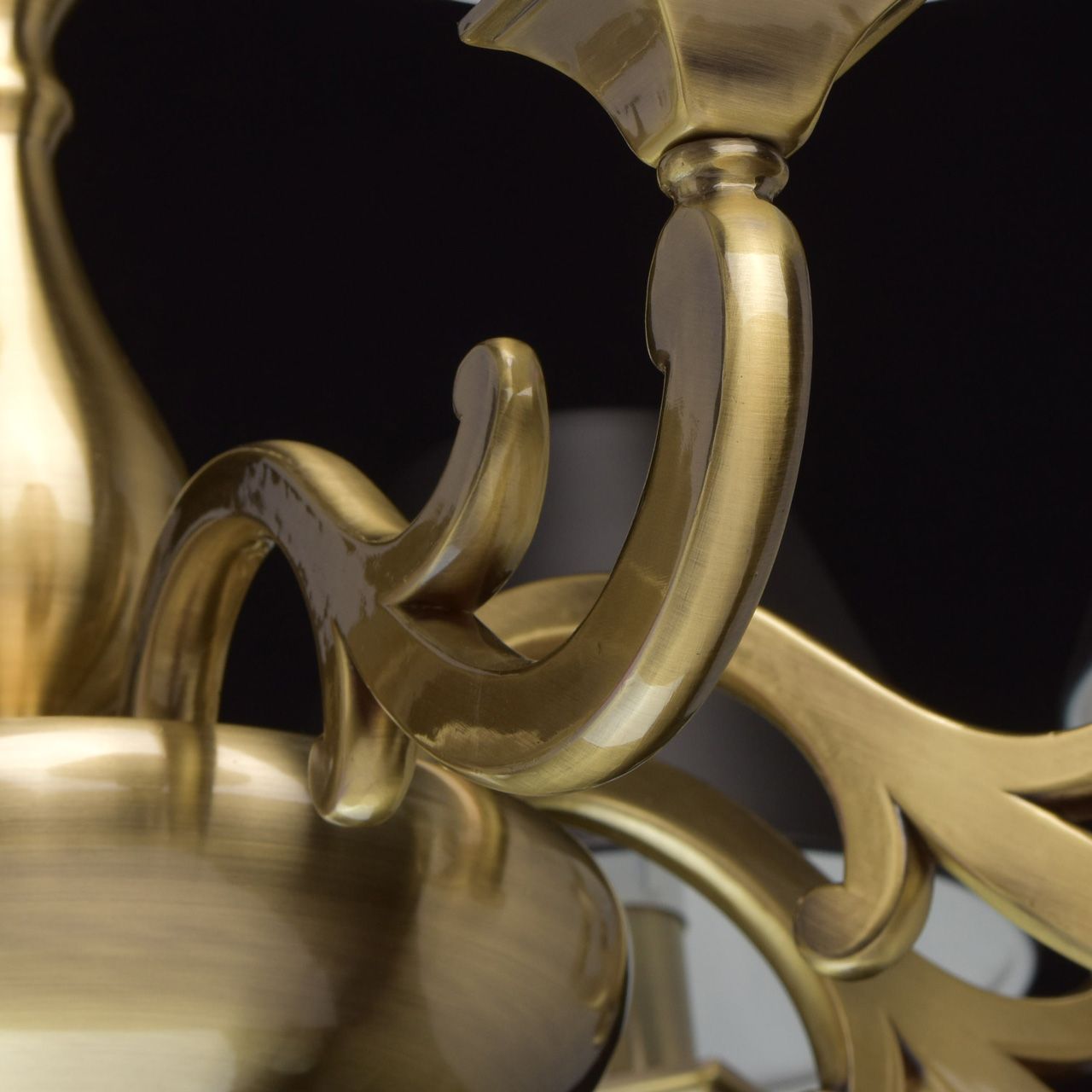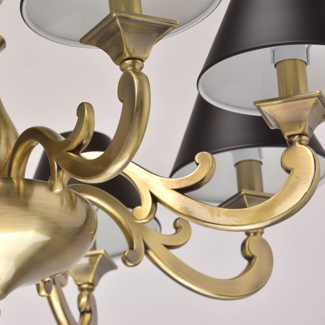 Основание выполнено из комбинации сплавов металлов, гальванизировано в цвет античной бронзы, патинировано, лакировано. Потолочная чаша, центральный стержень, корпус изготовлены из металла по технологии токарной обработки. Рожки, декоративная розетка изготовлены из сплава алюминия по технологии художественного литья. Плафоны выполнены из металла, окрашенного по внешней поверхности в черный цвет, по внутренней - в белый.Тип помещения