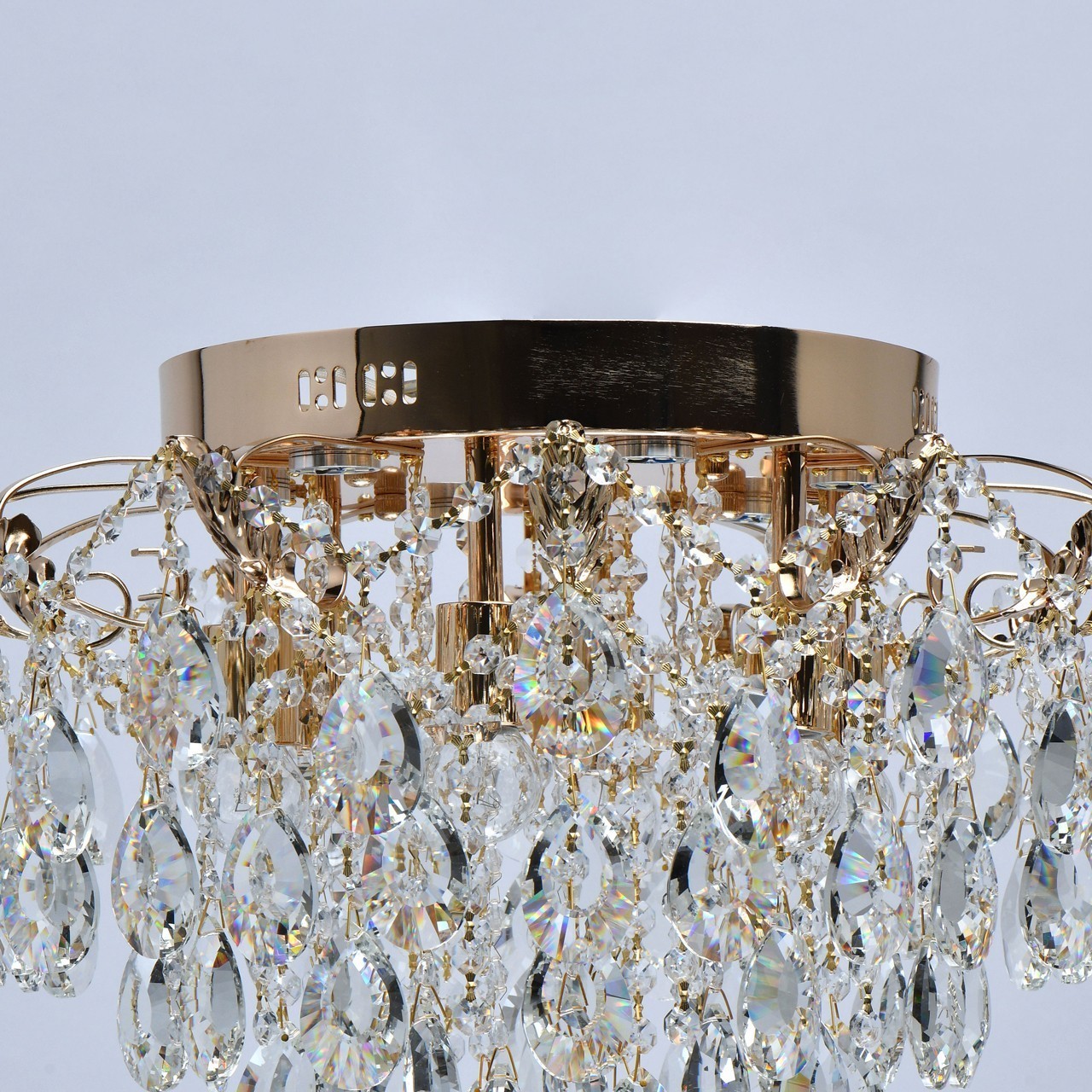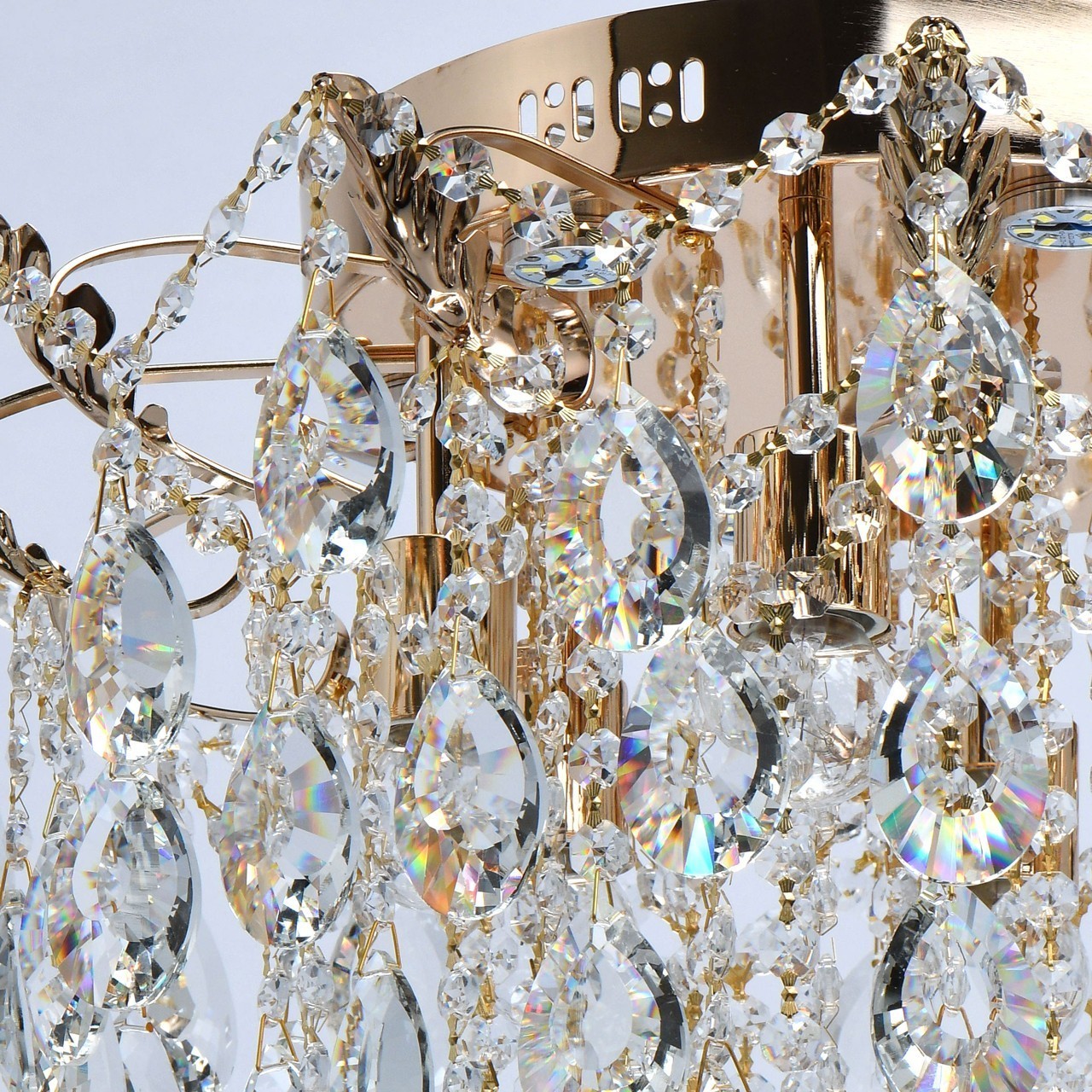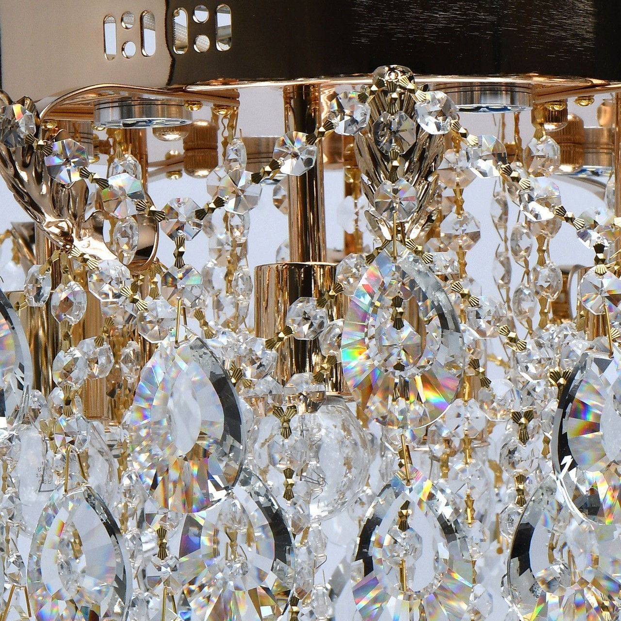 Основание светильника выполнено из сплава металла и гальванизировано в цвет золота. Светильник декорирован прозрачным хрусталем формы октагон и миндаль. Светодиодные источники света типа SMD Chip сочетаются со стандартными патронами типа Е-27.Тип помещения