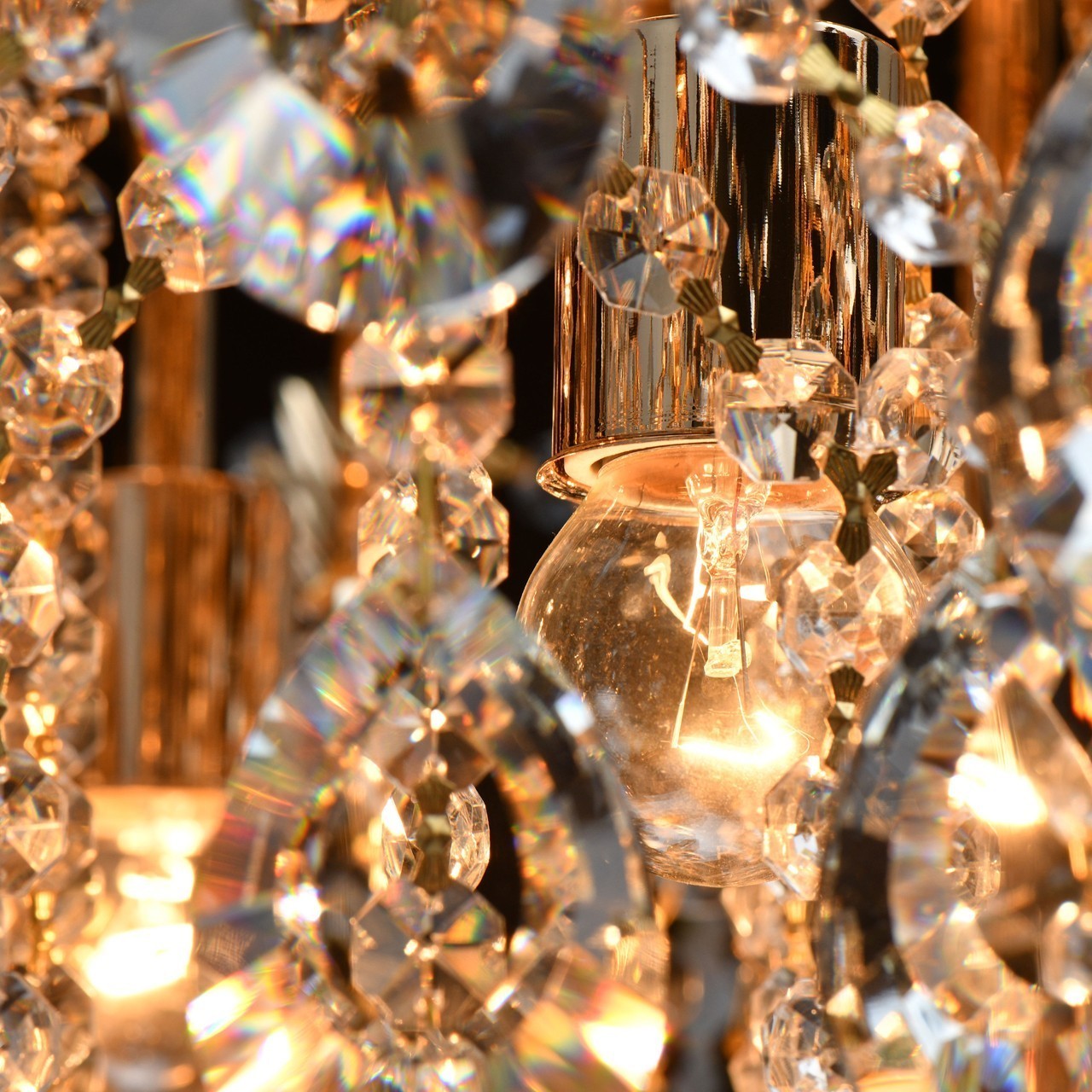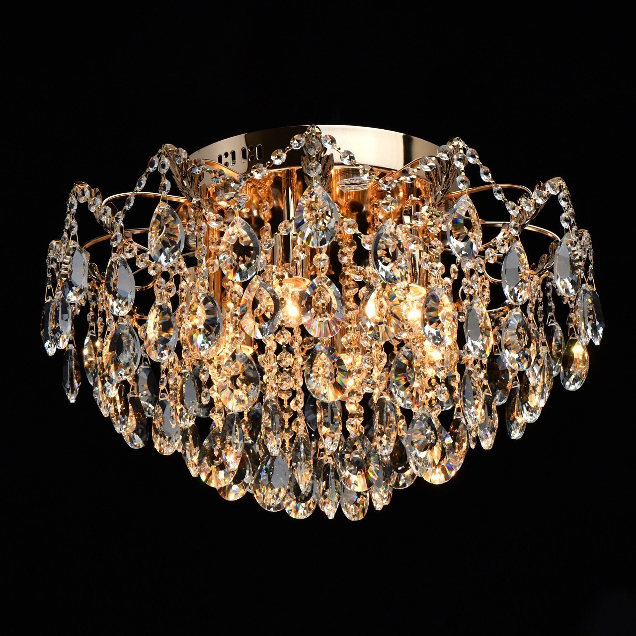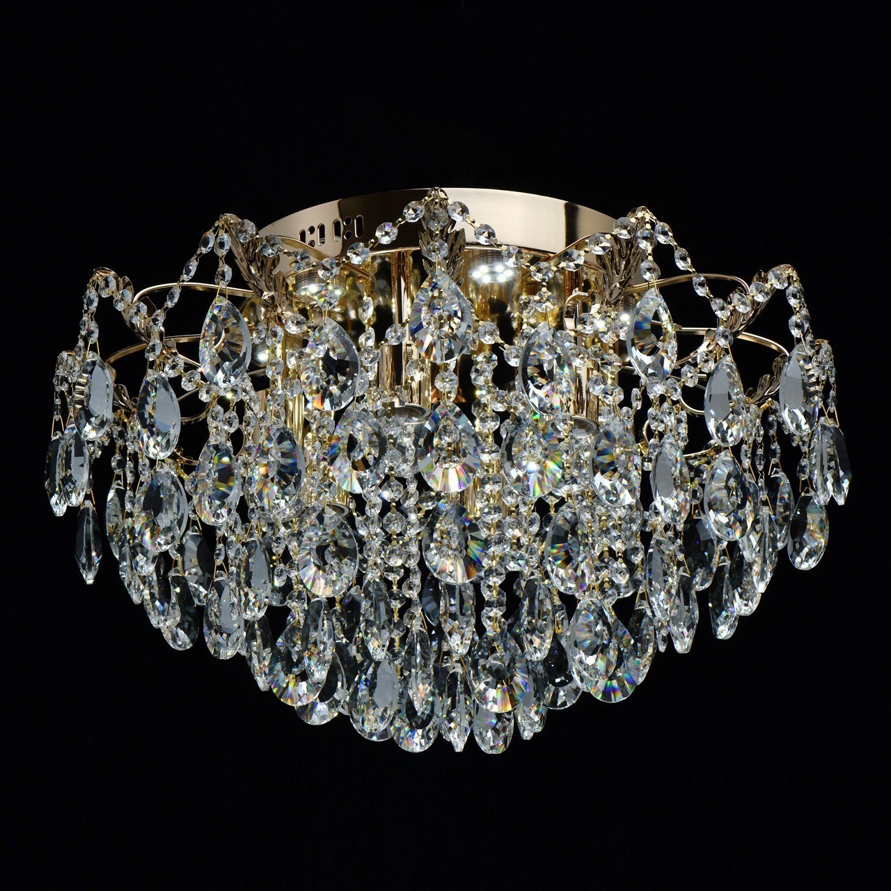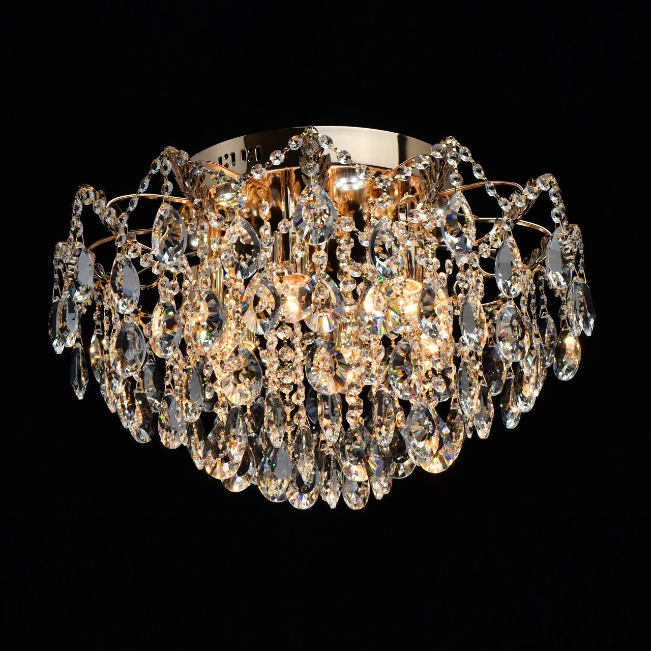 Основание светильника выполнено из сплава металла и гальванизировано в цвет золота. Светильник декорирован прозрачным хрусталем формы октагон и миндаль. Светодиодные источники света типа SMD Chip сочетаются со стандартными патронами типа Е-27.Тип помещения