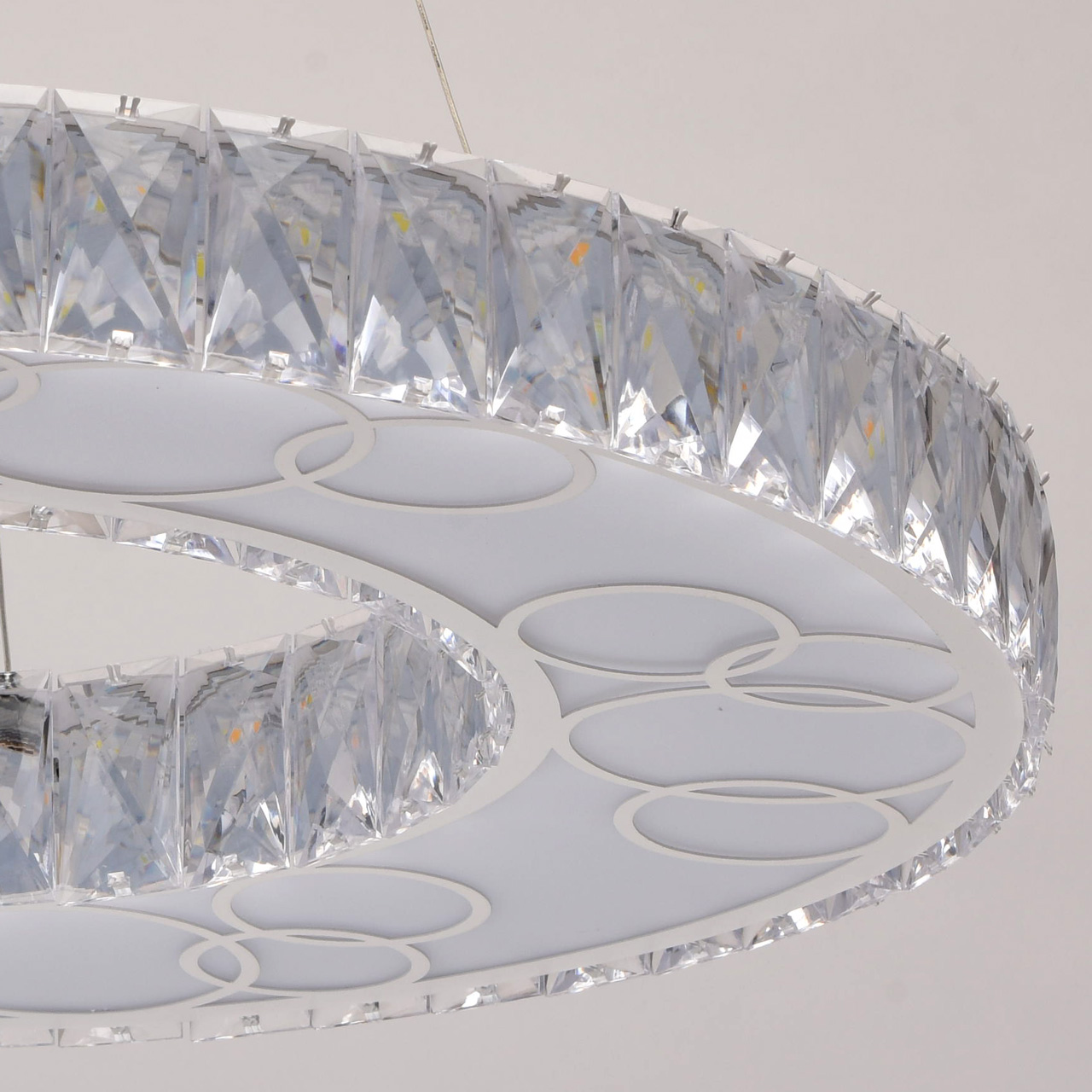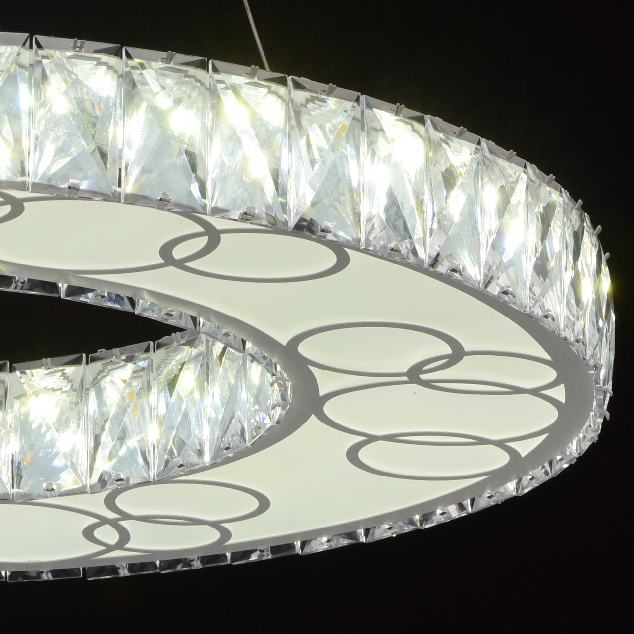 Основание из сплава металла окрашено в белый цвет. Декоративные элементы по краю плафона выполнены из прозрачного акрила. Светодиодный источник света типа SMD Board закрыт стеклянным рассеивателем, обработанным по технологии матирования. Изнутри рассеиватель покрыт стеклянной крошкой, снаружи декорирован геометрическими кругами, вырезанными из металлического листа по технологии лазерной резки и окрашенными в цвет основания.Тип помещения
