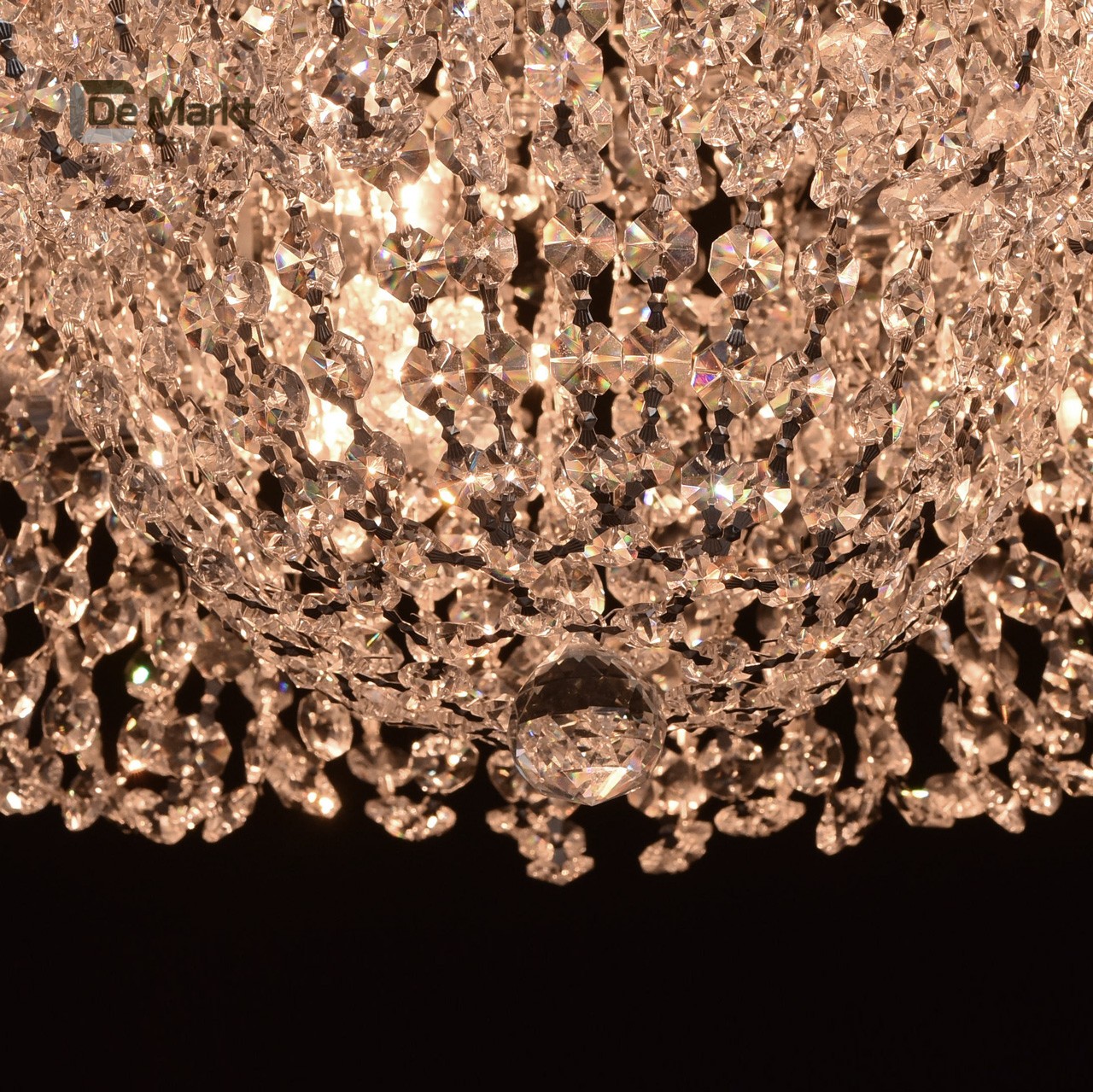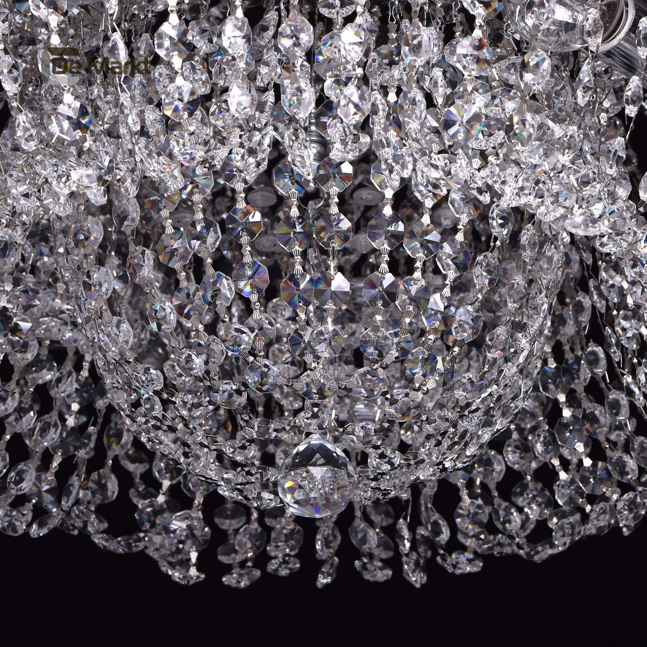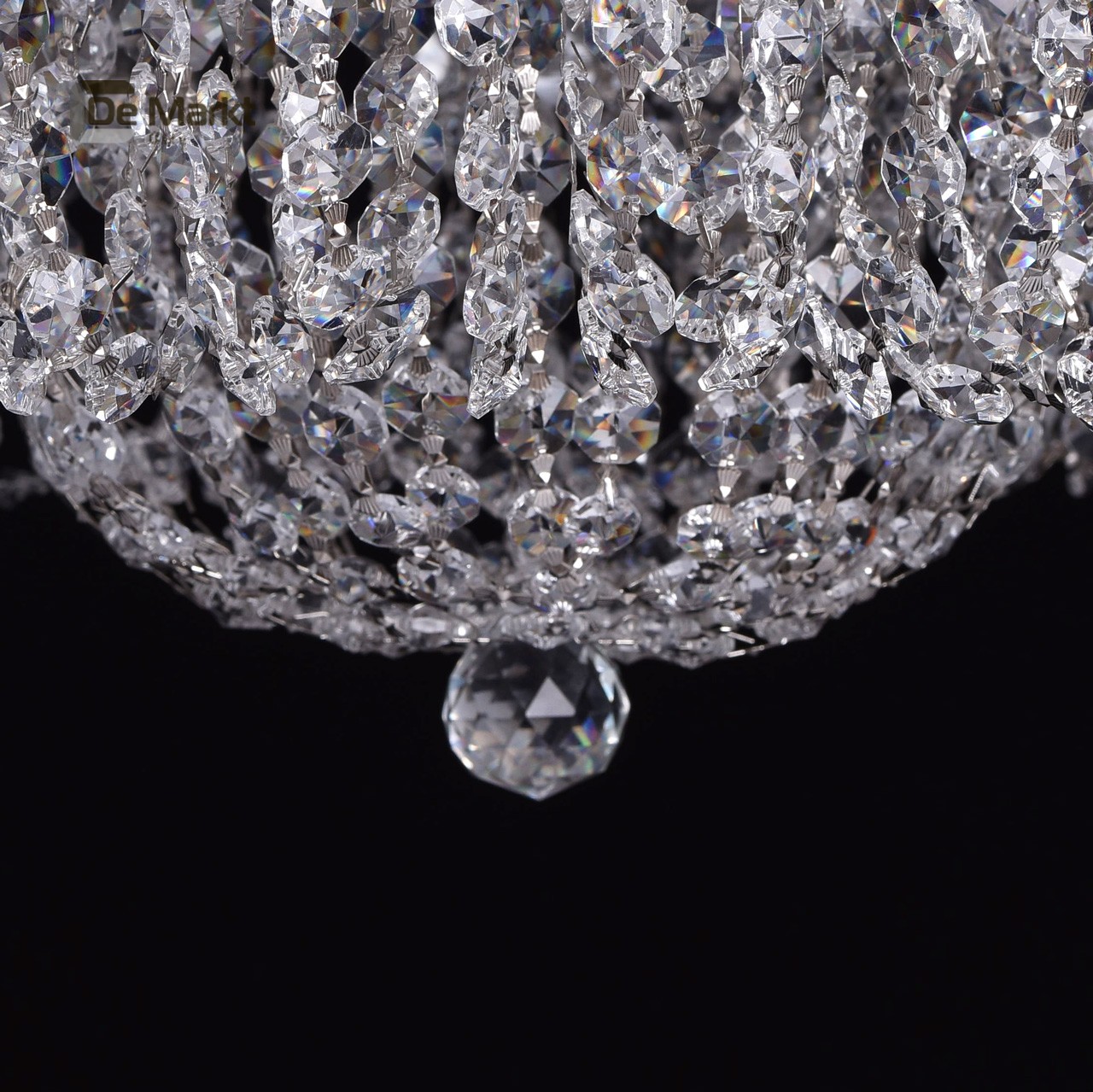 Металлическое основание светильника окрашено в цвет серебра и закрыто пластиной из нержавеющей стали, отполированной до зеркального блеска. Металлические надпатронники гальванизированы в цвет хрома. Светильник декорирован подвесками из хрустального стекла сложной огранки в форме октагонов, центральный подвес в форме шара.Тип помещения