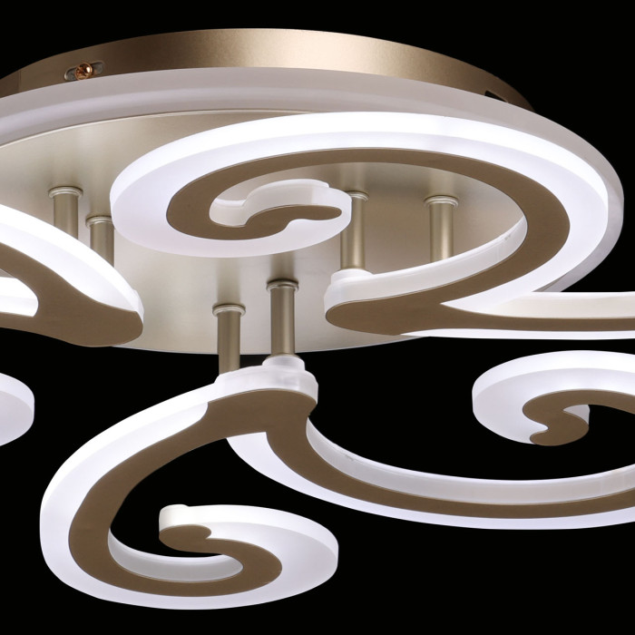 Многорежимность с изменением цветовой температуры и яркости света является элементом светодизайна. Качественные светодиоды обеспечивают яркое освещение и долгий срок службы. Наличие ПДУ позволяет управлять режимами освещения. Плавный диммер создает требуемое настроение в помещении. Подсветка потолка создает праздничное настроение. Модный цвет матового золота и оригинально изогнутые рожки придают потолочной люстре элегантности. Компактный светильник для стандартной высоты потолка.Металлическое основание потолочной люстры окрашено в цвет перламутрового золота. Корпус плафонов выполнен из сплава алюминия с цинком и окрашен в цвет основания. Светодиодные источники света закрыты белым матовым акрилом.