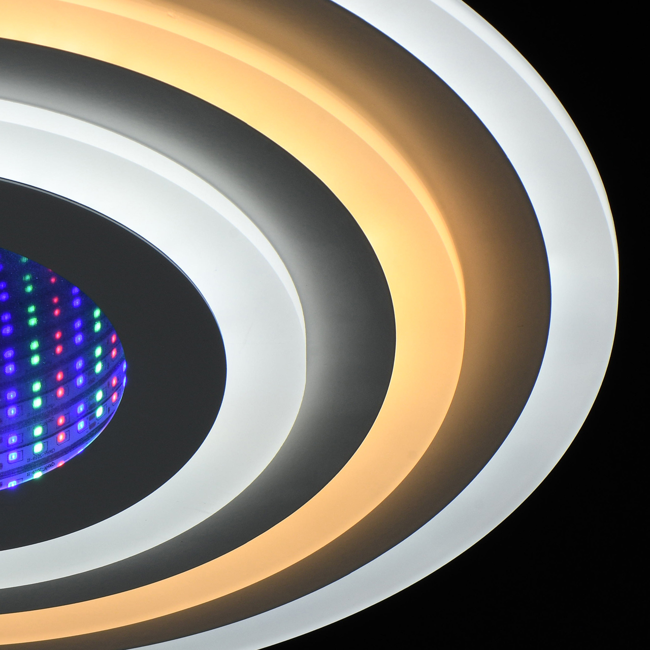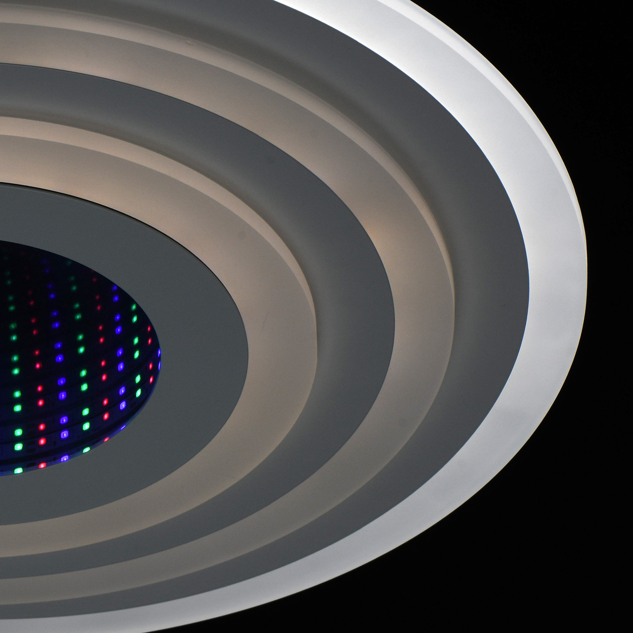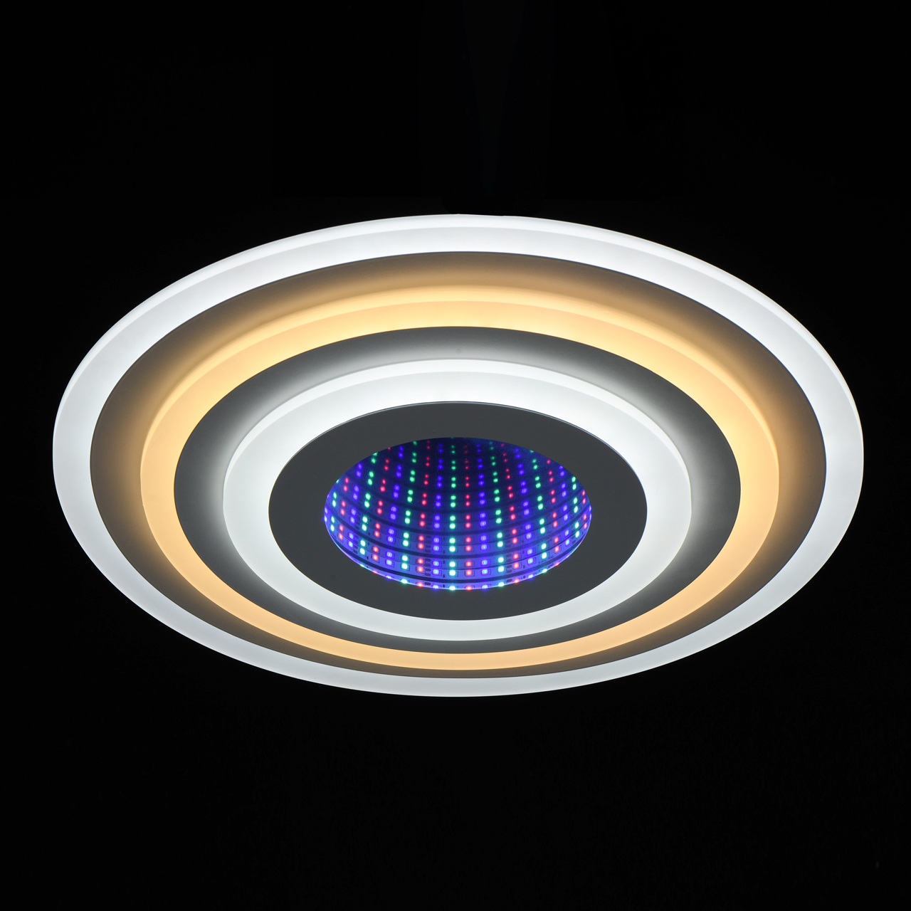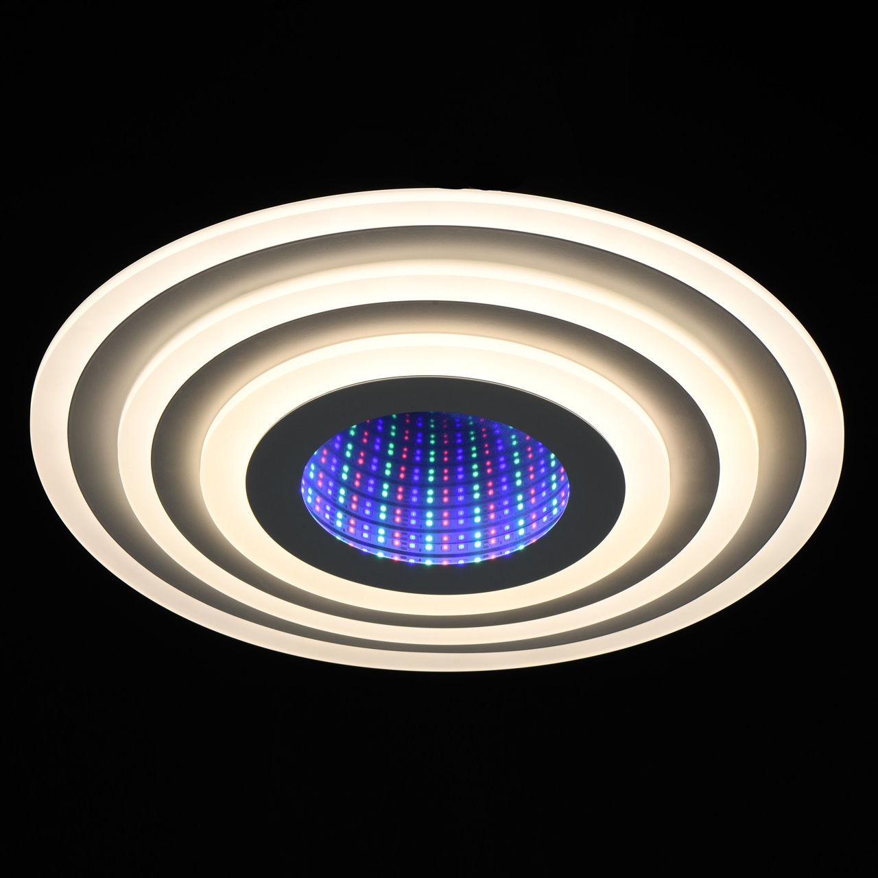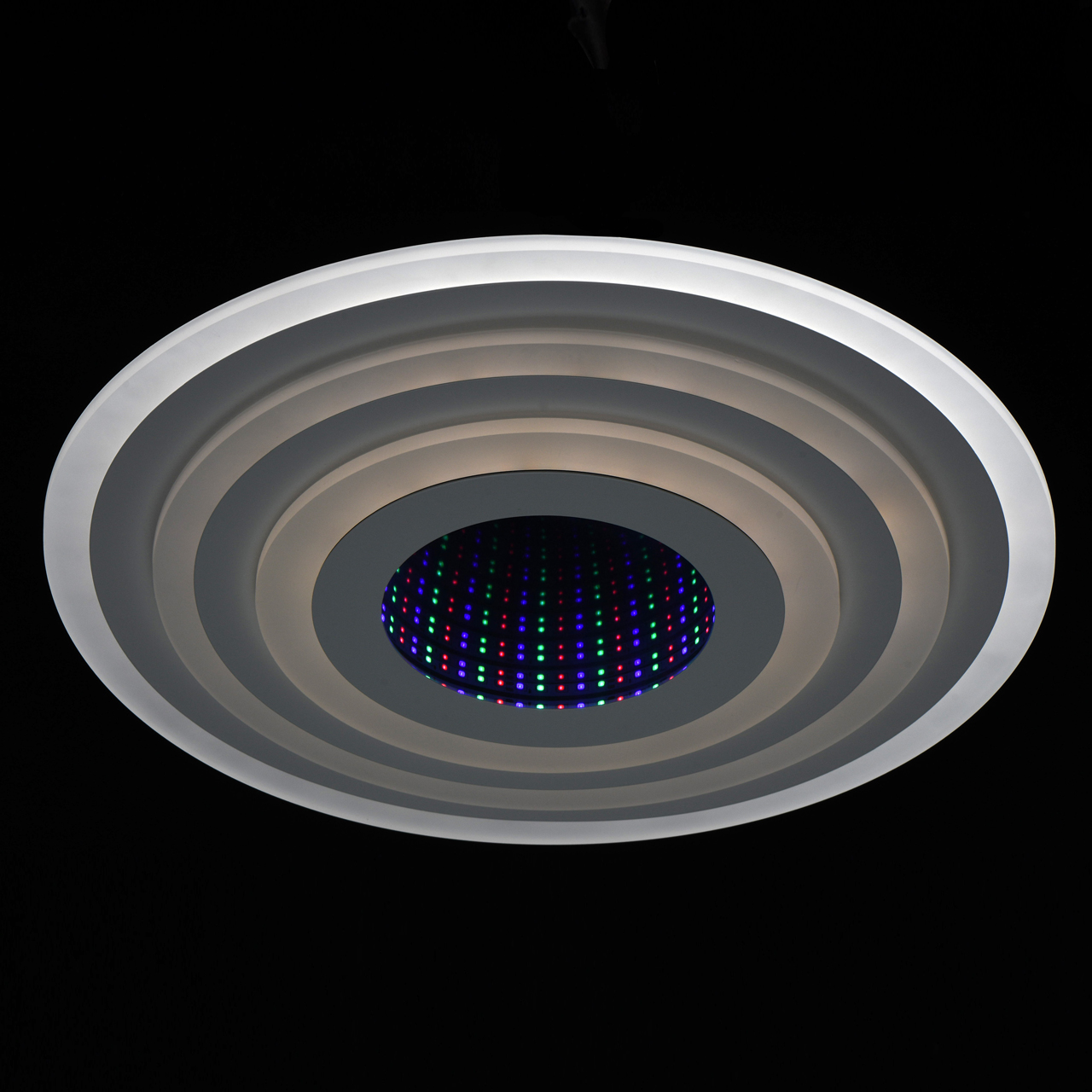Эргономичный дизайн с атмосферным 3D эффектом центральной части. Многорежимность света с изменением цветовой температуры и яркости света является элементом светодизайна. Мощные светодиоды последнего поколения обеспечивают яркое освещение и долгий срок службы. Наличие ПДУ, управляет 5-ю режимами освещения. Режим комбинированного света включает теплый, холодный, совмещенный свет, режим ночника. Возможность плавного диммирования яркости светового потока и цветовой температуры позволяет создавать требуемое настроение в помещениии. Компактный светильник для стандартной высоты потолка.Стилевые решения интерьера