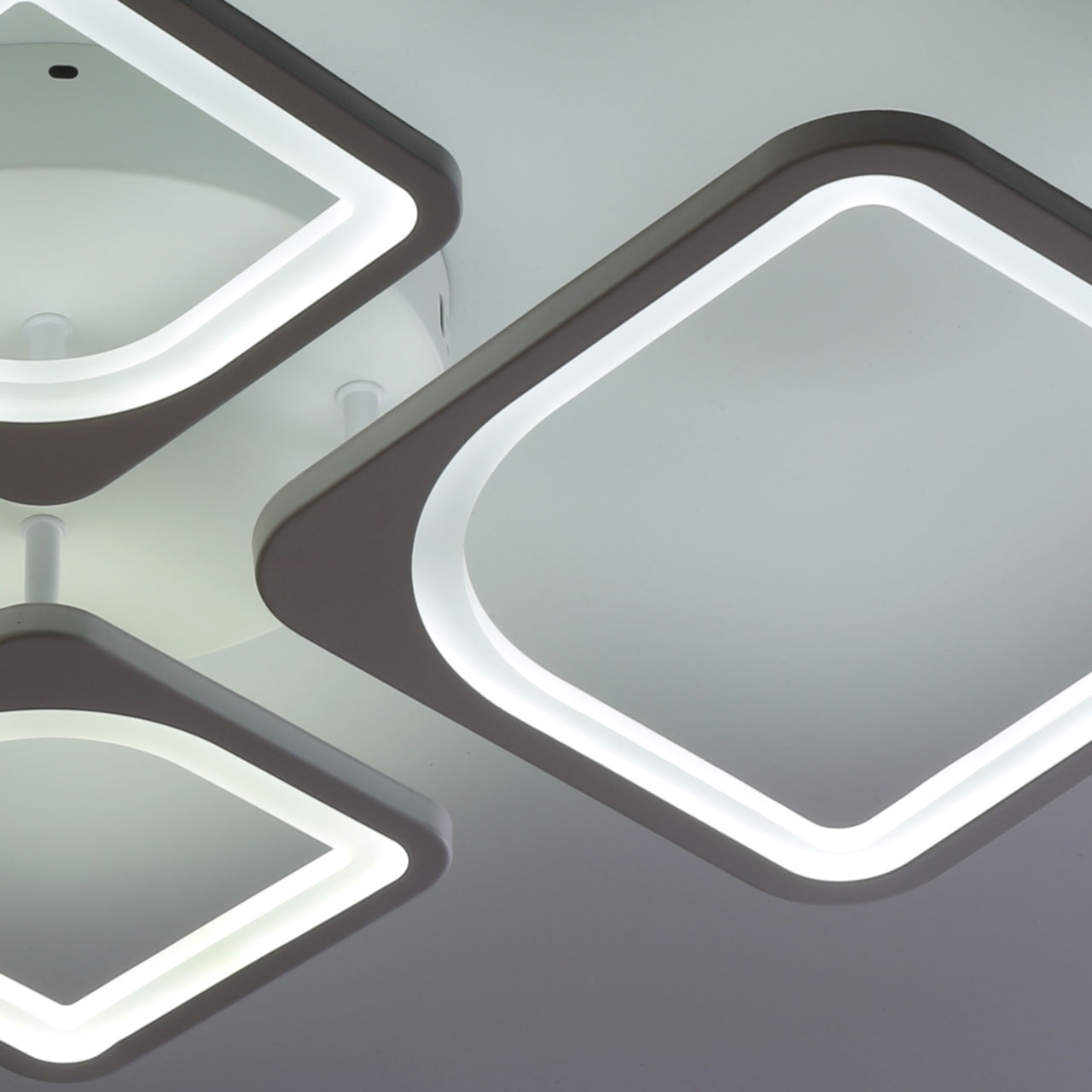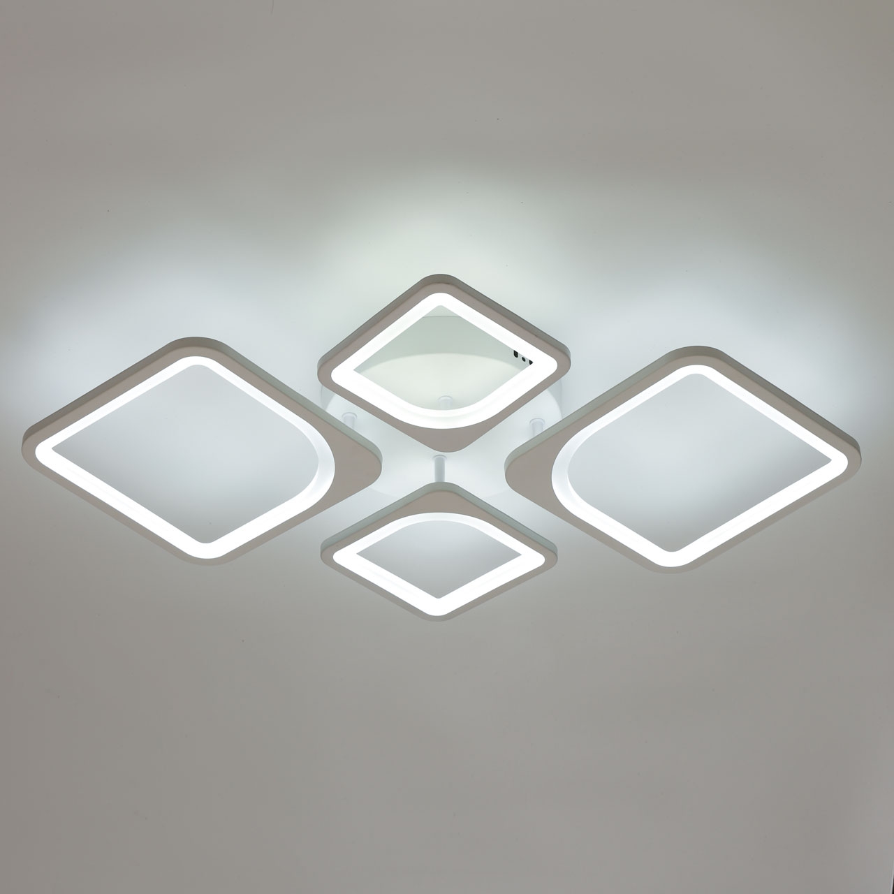 Потолочная люстра с пультом, светодиодная Мадлен 424012704 от немецкой фабрики DeMarkt подходит для размещения в гостиной, в кафе, в спальне, на кухне, в офисе, в стиле современный, хай-тек. Материал изготовления – металл, цвет белый. Модель имеет 4 рассеивателя (акрил). Цоколь LED, световой поток 8100 lm, цветовая температура 3000-6500 К, дневной, холодный, теплый цвет свечения. Мощность 120 W, питание от сети 220 V. Габариты: длина – 76 см, ширина – 49.5 см, высота – 8 см, крепление на монтажную пластину. Технические особенности: можно подключить к диммеру, возможно управление пультом. В комплекте лампочки, ПДУ.Характеристики