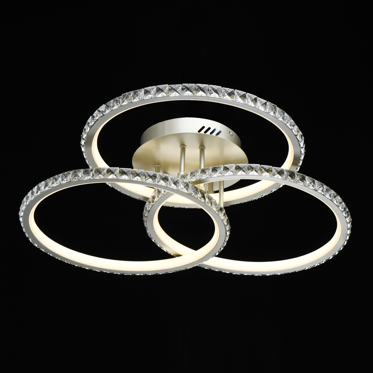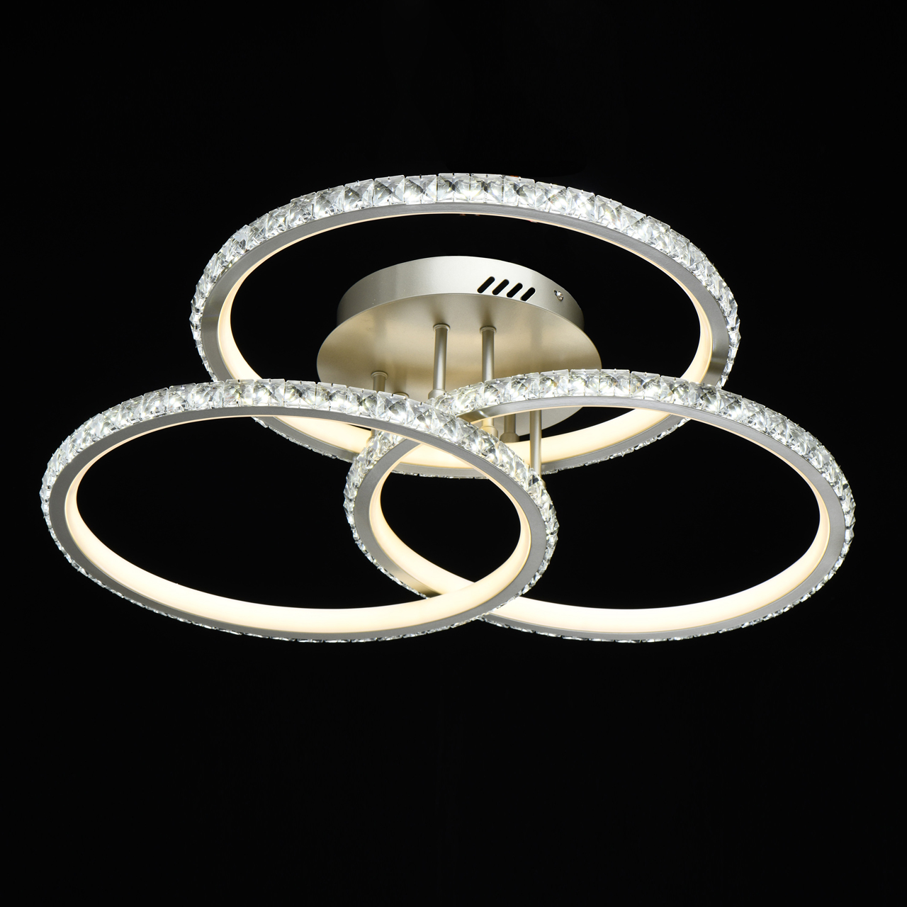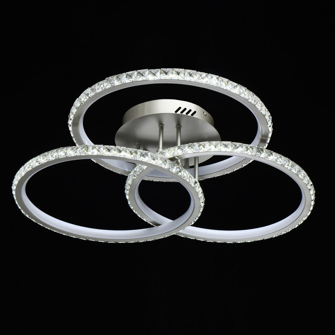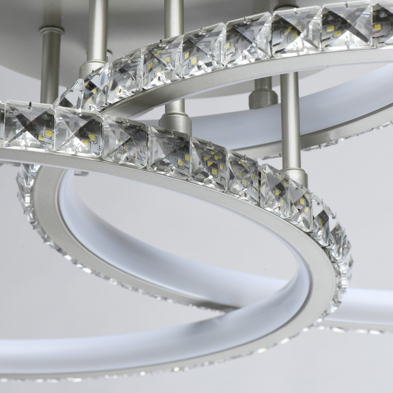 Трендовый цвет перламутрового серебра актуален для большинства интерьеров. Хрустальный декор квадратной формы создает красивую игру света. Наличие ПДУ, управляет 3 режимами, индивидуальный пульт не требует настройки со светильником. Независимый режим включает внешние кольца 6500К, внутренние кольца 4000К, имеется совмещенный режим. Полноценное освещение интерьера в каждом режиме благодаря высокой мощности светодиодов. Компактный светильник для стандартной высоты потолка. Широкий диаметр обеспечивает большую площадь освещения. Светильник в сборе облегчает монтаж.Стилевые решения интерьера
