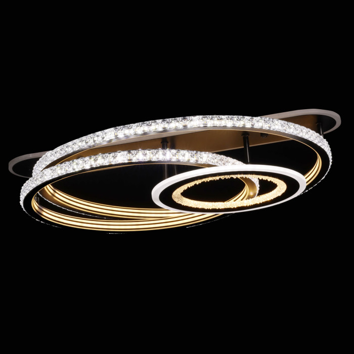 Глубокий черный цвет основания и плафонов обеспечивает единство дизайна и добавляет светильнику концептуальности. Матовый акрил мягко рассеивает свет, создавая комфортное освещение. Прозрачный многогранный акрил воспроизводит эффект игры бликов света. Функция RGB вносит атмосферность в интерьер. Многорежимность освещения от 3000К до 6500К позволяет подобрать комфортную температуру света. Наличие ПДУ и диммера делает люстру удобной при выборе режимов освещения. Качественные светодиоды экономичны и безопасны.Металлическое основание потолочной люстры окрашено в черный цвет. Корпус плафонов выполнен из сплава алюминия с цинком и окрашен в цвет основания. Светодиодные источники света закрыты прозрачным фактурным или матовым акрилом.