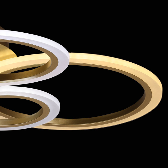 Металлическое основание потолочной люстры окрашено в матовое золото. Корпус плафона выполнен из сплава алюминия с цинком и окрашен в цвет основания. Светодиодные источники света закрыты белым матовым акрилом.