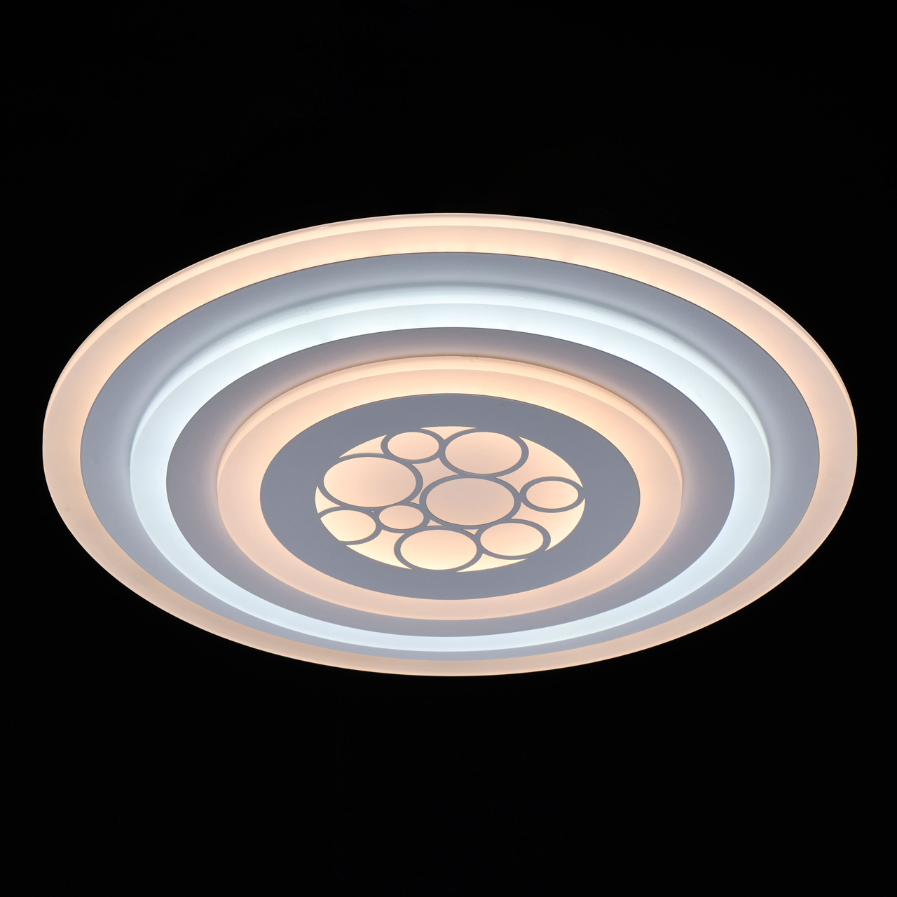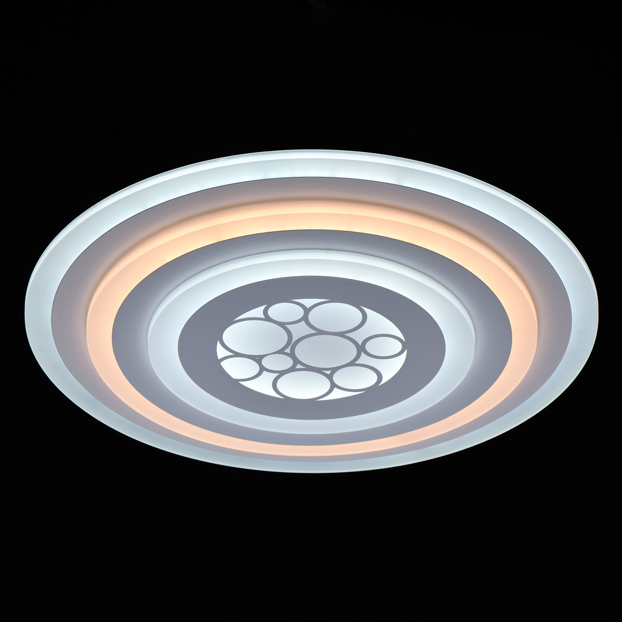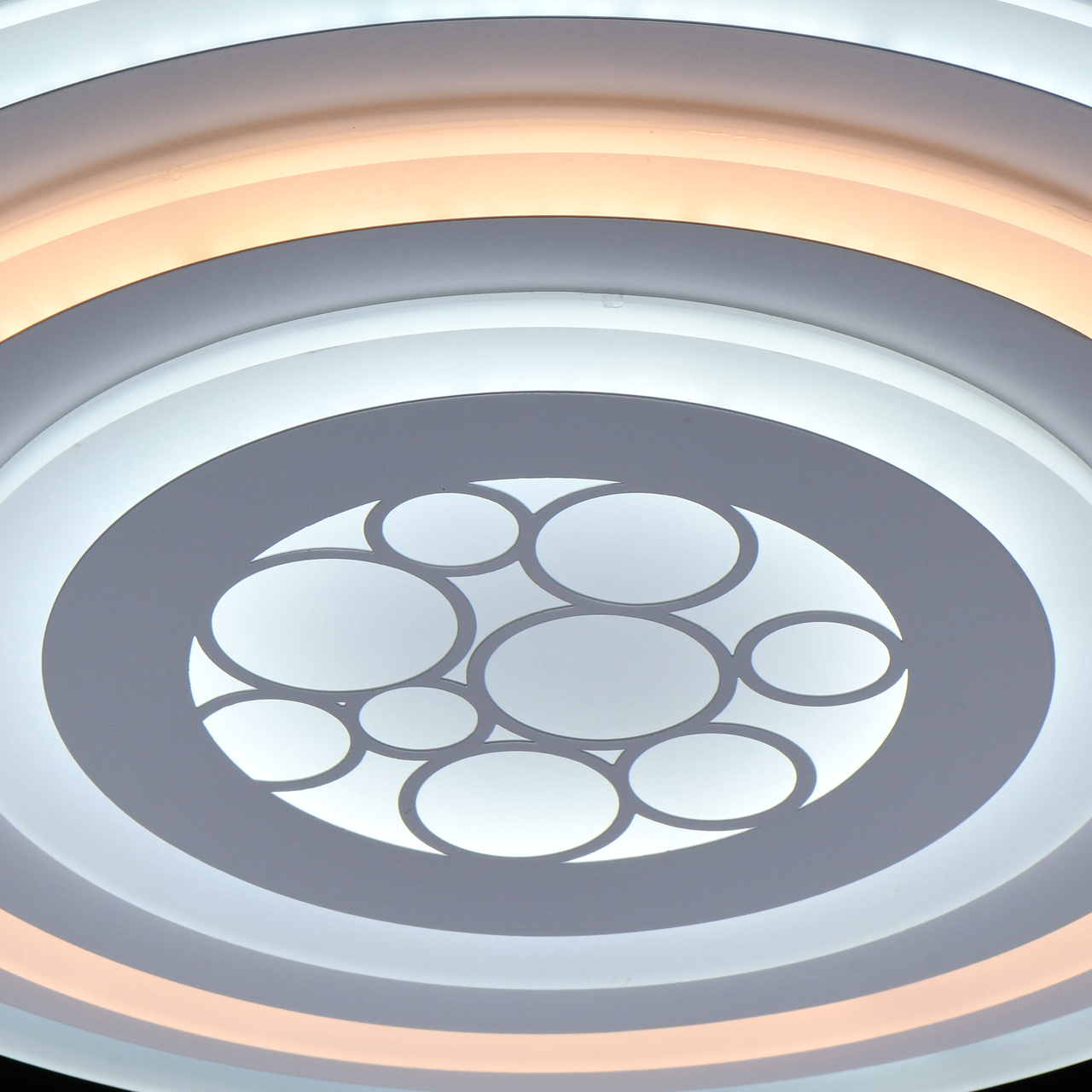 Эргономичный дизайн с акцентом в центре в виде геометрического рисунка. Многорежимность света с изменением цветовой температуры и яркости света является элементом светодизайна. Мощные светодиоды последнего поколения обеспечивают яркое освещение и долгий срок службы. Наличие ПДУ, управляет 6-.ю режимами освещения, универсальный пульт требует сопряжения со светильником Режим комбинировнного света включает теплый, холодный свет, режим ночника. Возможность диммирования яркости светового потока и цветовой температуры позволяет создавать требуемое настроение в помещениии. Компактный светильник для стандартной высоты потолка.Стилевые решения интерьера