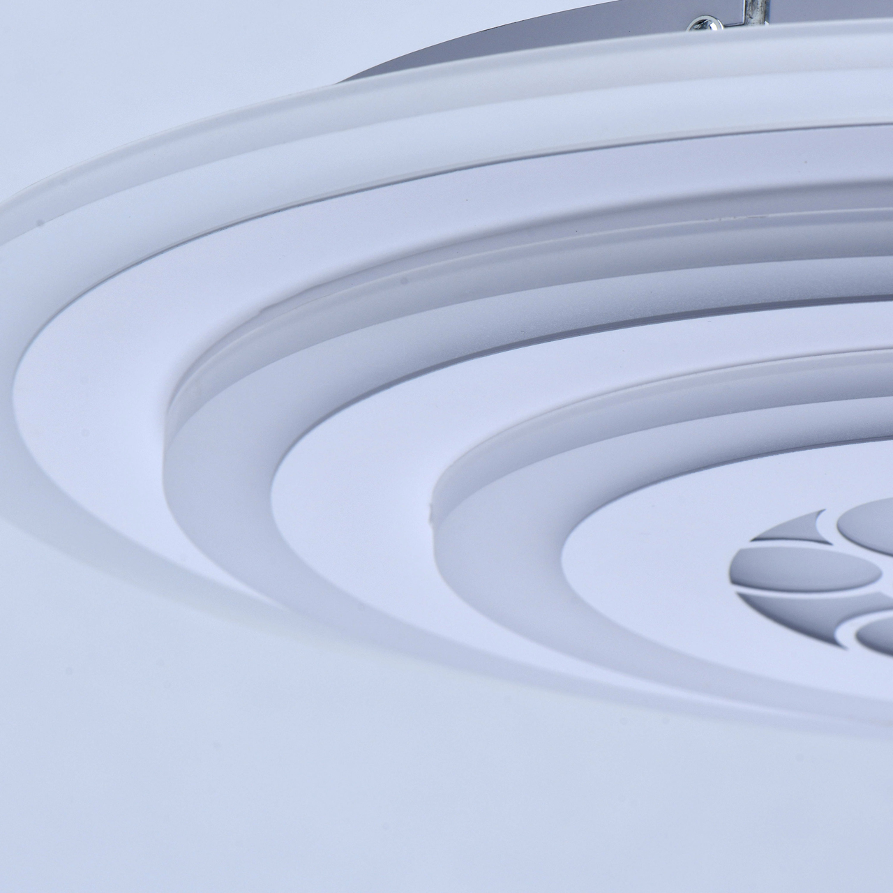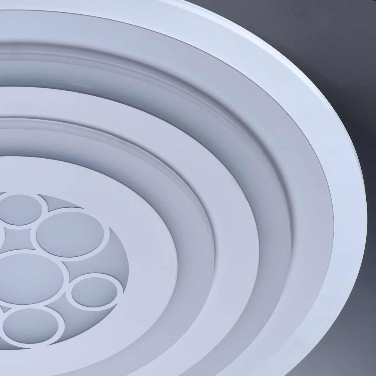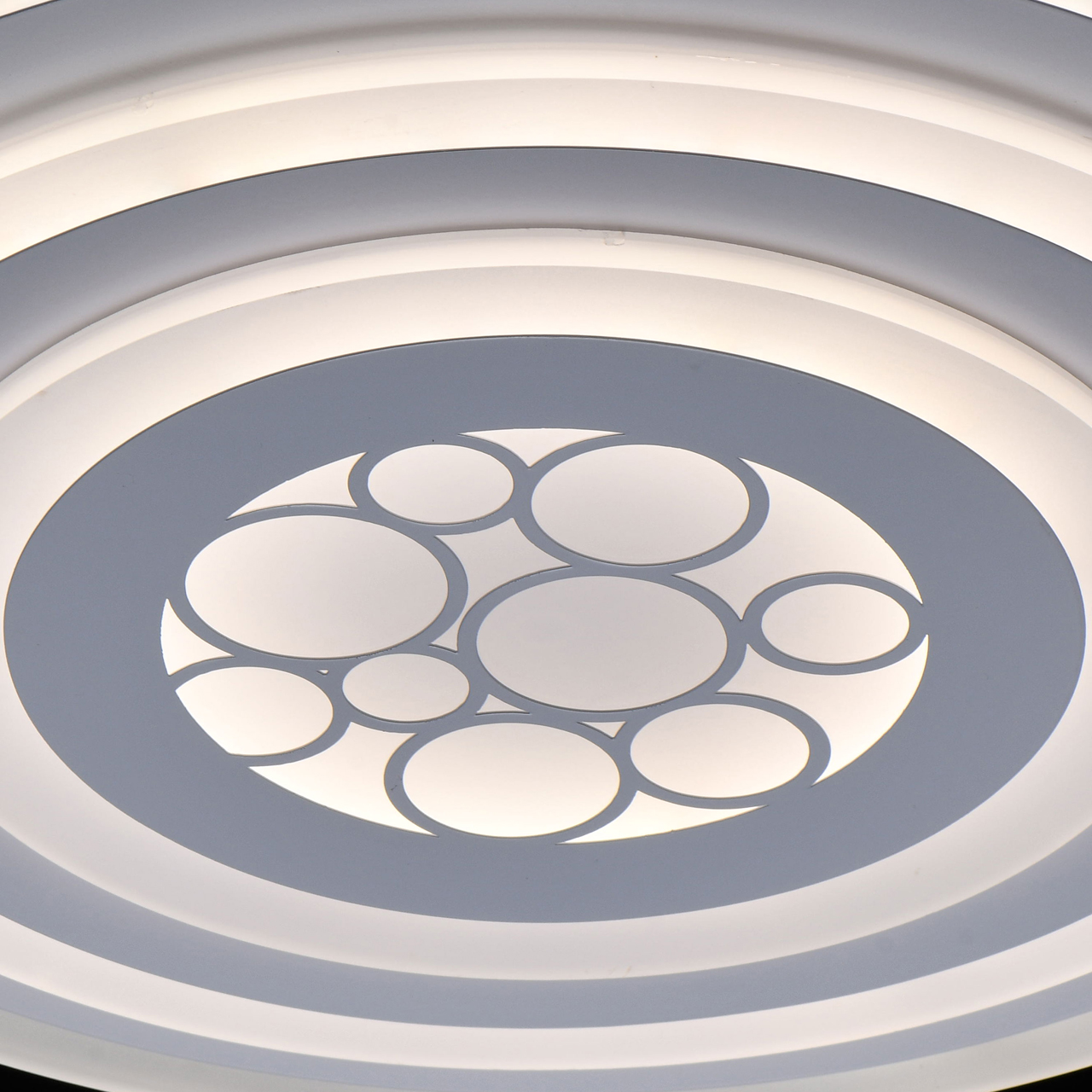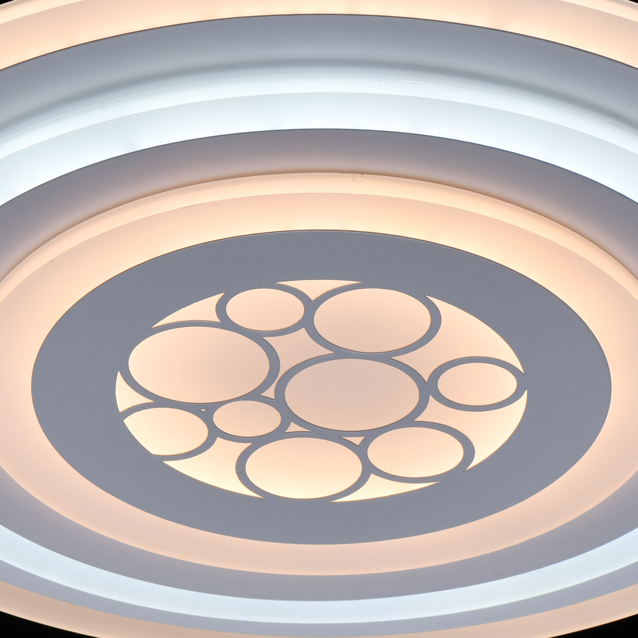 Эргономичный дизайн с акцентом в центре в виде геометрического рисунка. Многорежимность света с изменением цветовой температуры и яркости света является элементом светодизайна. Мощные светодиоды последнего поколения обеспечивают яркое освещение и долгий срок службы. Наличие ПДУ, управляет 6-.ю режимами освещения, универсальный пульт требует сопряжения со светильником Режим комбинировнного света включает теплый, холодный свет, режим ночника. Возможность диммирования яркости светового потока и цветовой температуры позволяет создавать требуемое настроение в помещениии. Компактный светильник для стандартной высоты потолка.Стилевые решения интерьера