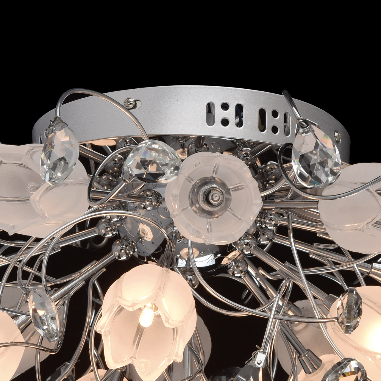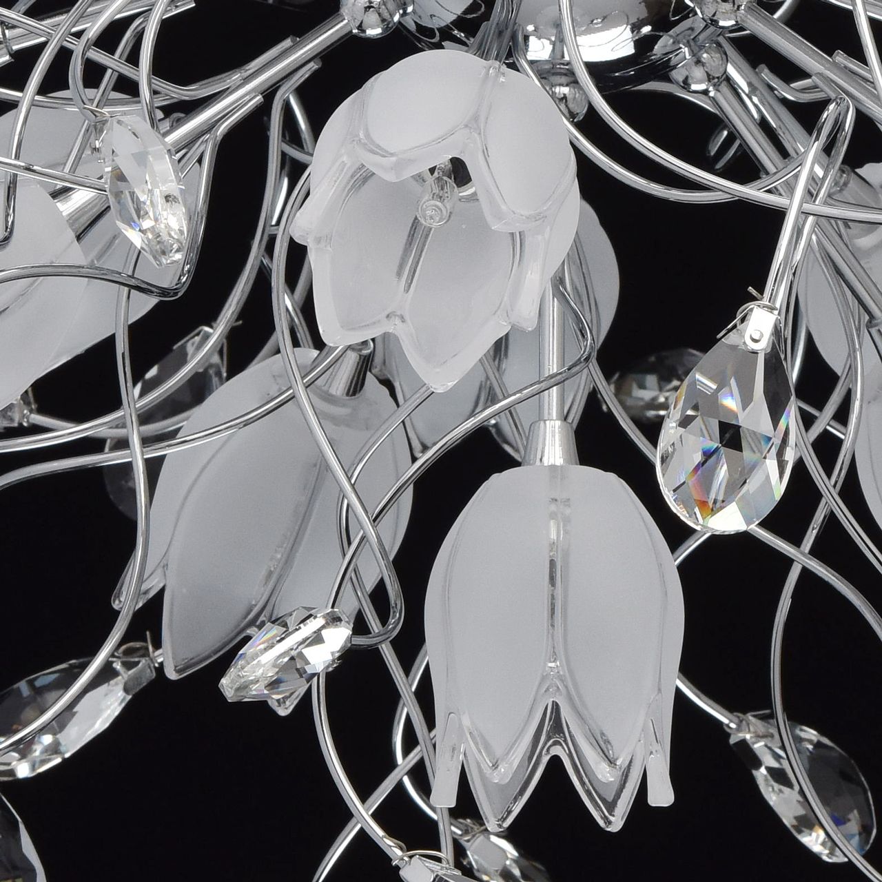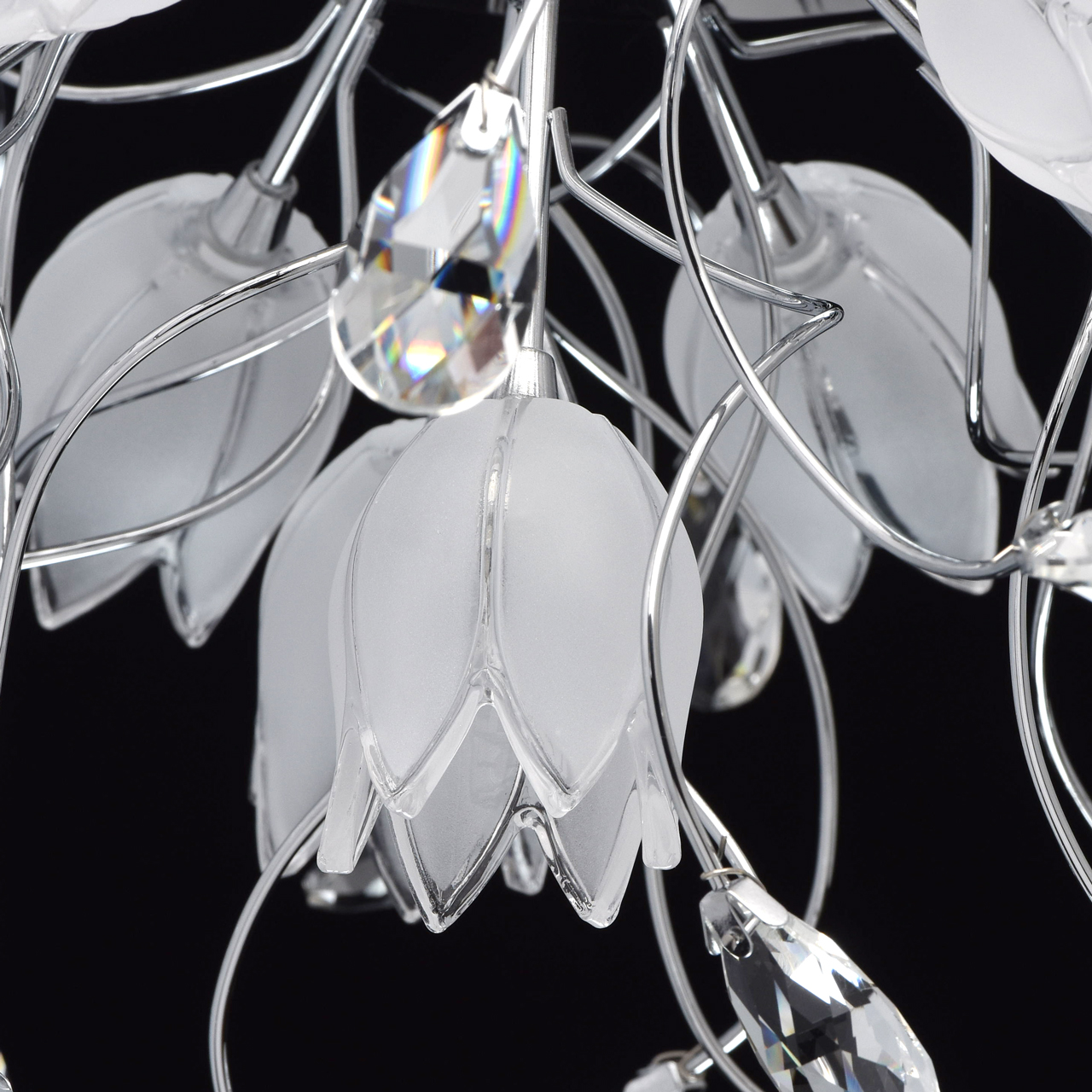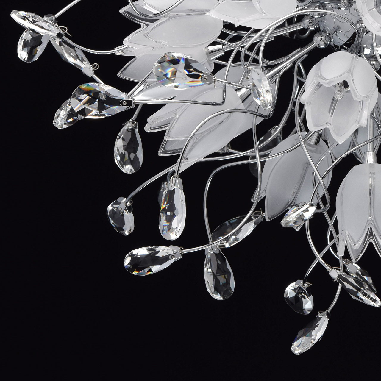 Чудесный светильник из коллекции «Подснежник» выглядит удивительно реалистично и напоминает волшебный цветок. Основание из металла цвета хрома эффектно дополнено хрустальным декором. Тонкие металлические веточки затейливо переплетаются, и каждая завершается хрустальной каплей. Посреди всего этого сияющего великолепия – множество стеклянных матовых плафонов-цветков. Холодные тона, в которых выполнена люстра, освежат обстановку, а флористический дизайн наполнит её нежной красотой. Рекомендуемая площадь освещения порядка 21 кв.м.Преимущества модели
