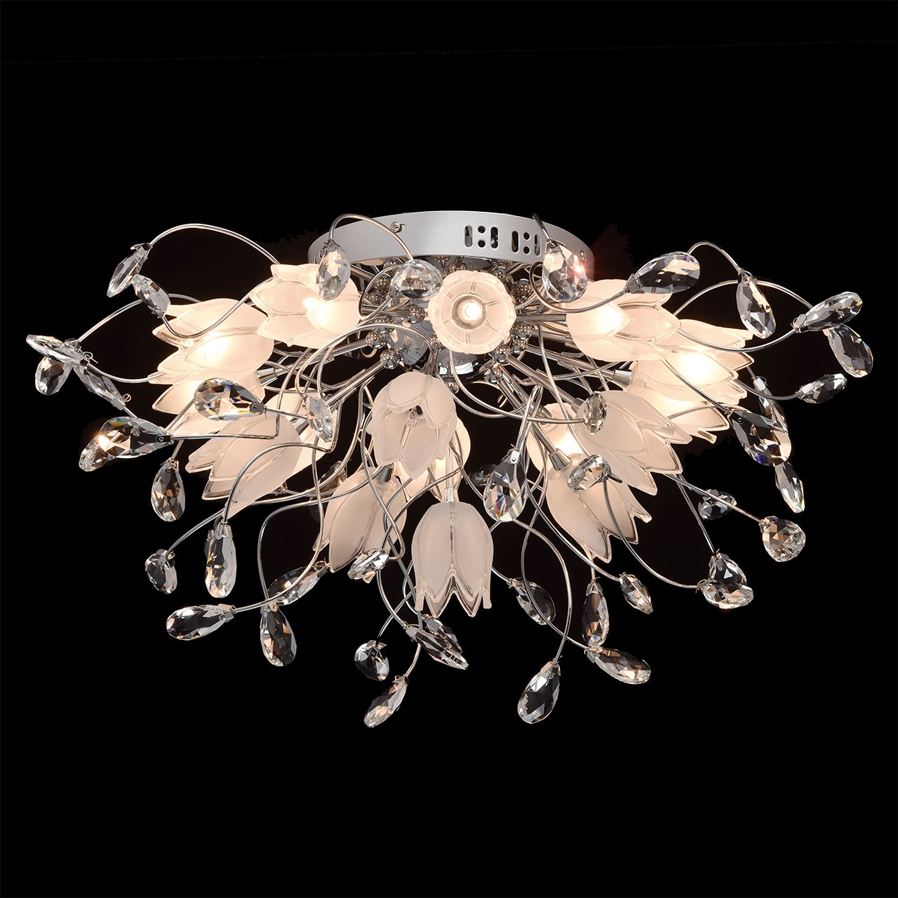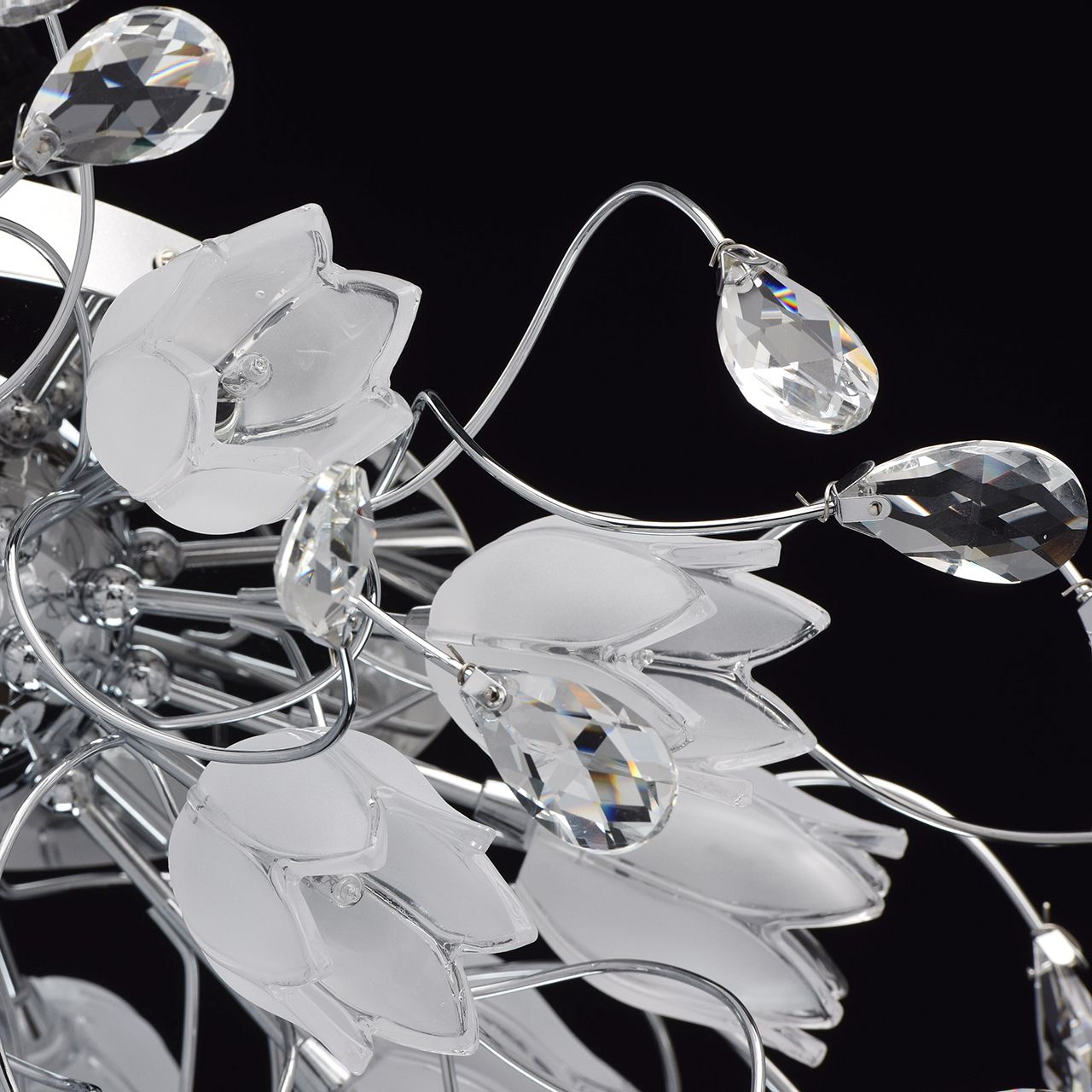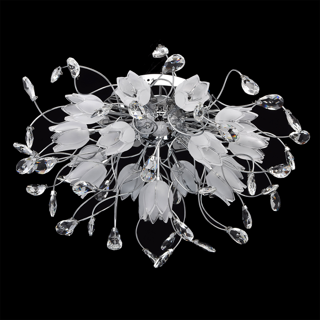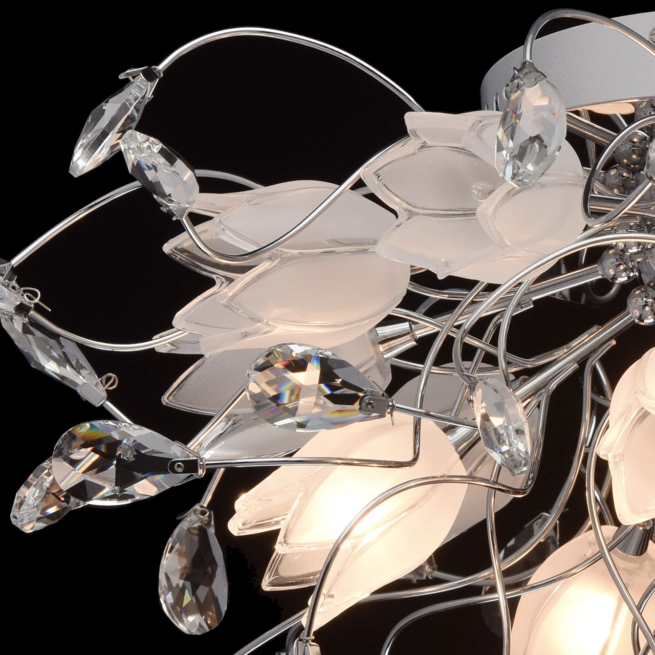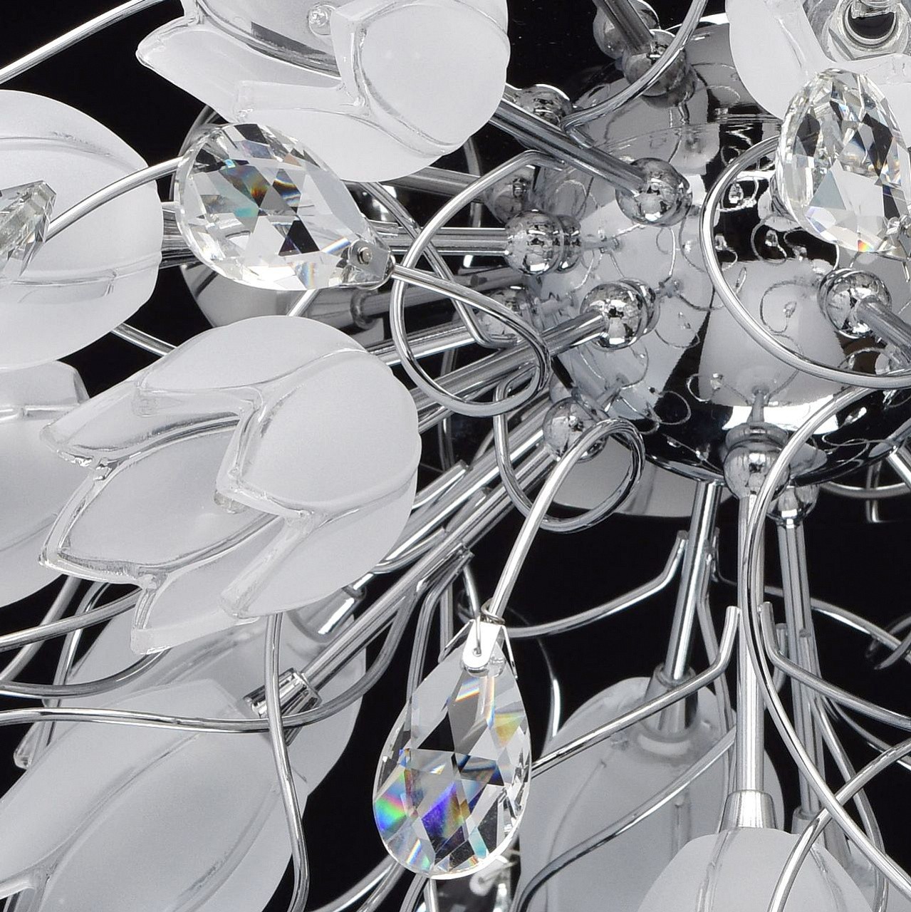 Чудесный светильник из коллекции «Подснежник» выглядит удивительно реалистично и напоминает волшебный цветок. Основание из металла цвета хрома эффектно дополнено хрустальным декором. Тонкие металлические веточки затейливо переплетаются, и каждая завершается хрустальной каплей. Посреди всего этого сияющего великолепия – множество стеклянных матовых плафонов-цветков. Холодные тона, в которых выполнена люстра, освежат обстановку, а флористический дизайн наполнит её нежной красотой. Рекомендуемая площадь освещения порядка 21 кв.м.Преимущества модели