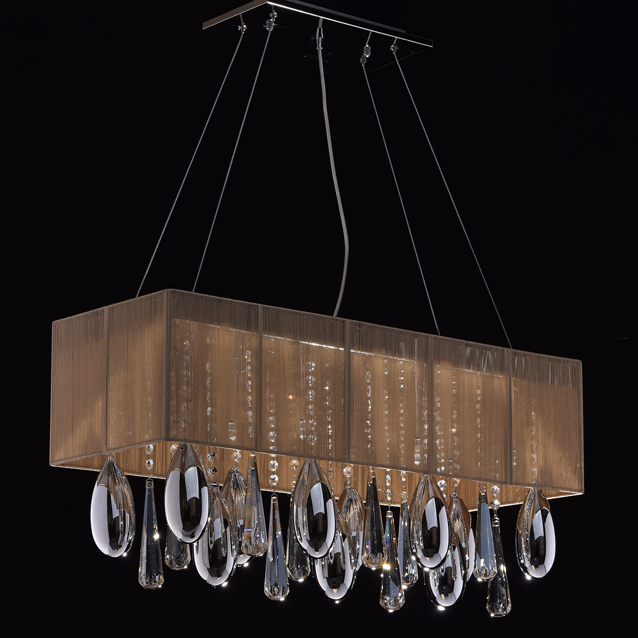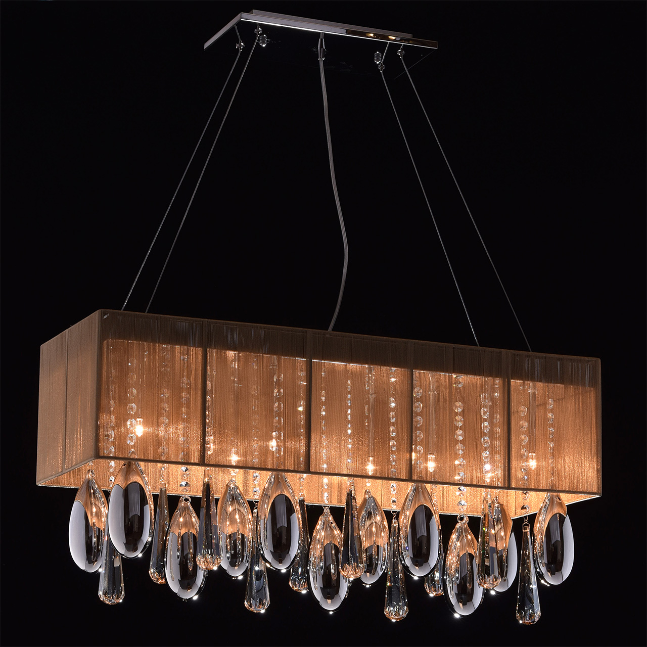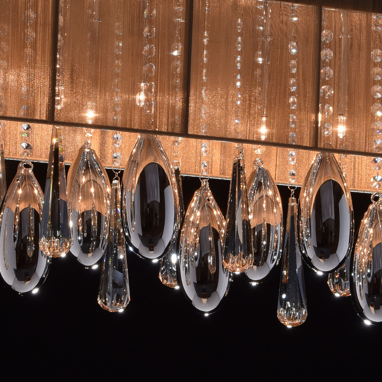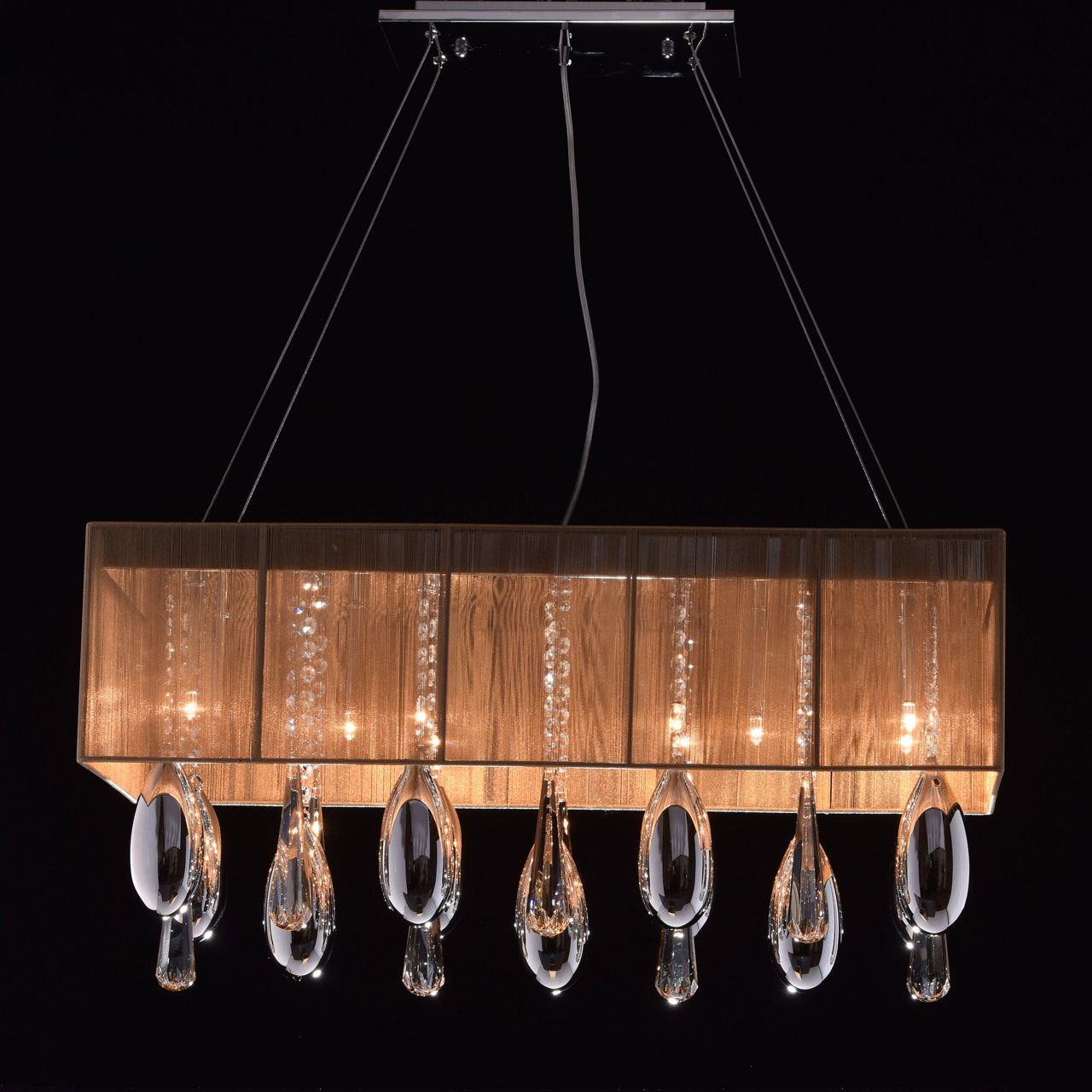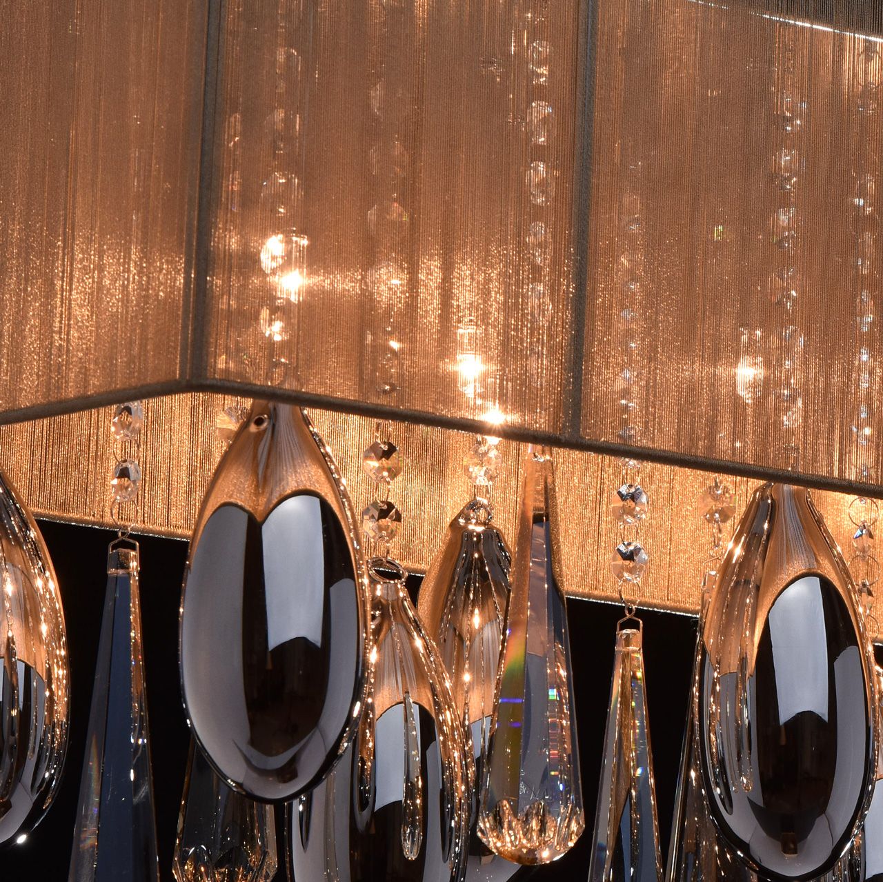 Гламурный светильник с изящным абажуром в интересном цветовом решении. Световой поток оказывается приглашенным в сказочное Зазеркалье между зеркальным основанием и декоративными стеклянными элементами с гальваническим покрытием в виде благородных капель на хрустальных подвесах.Преимущества модели