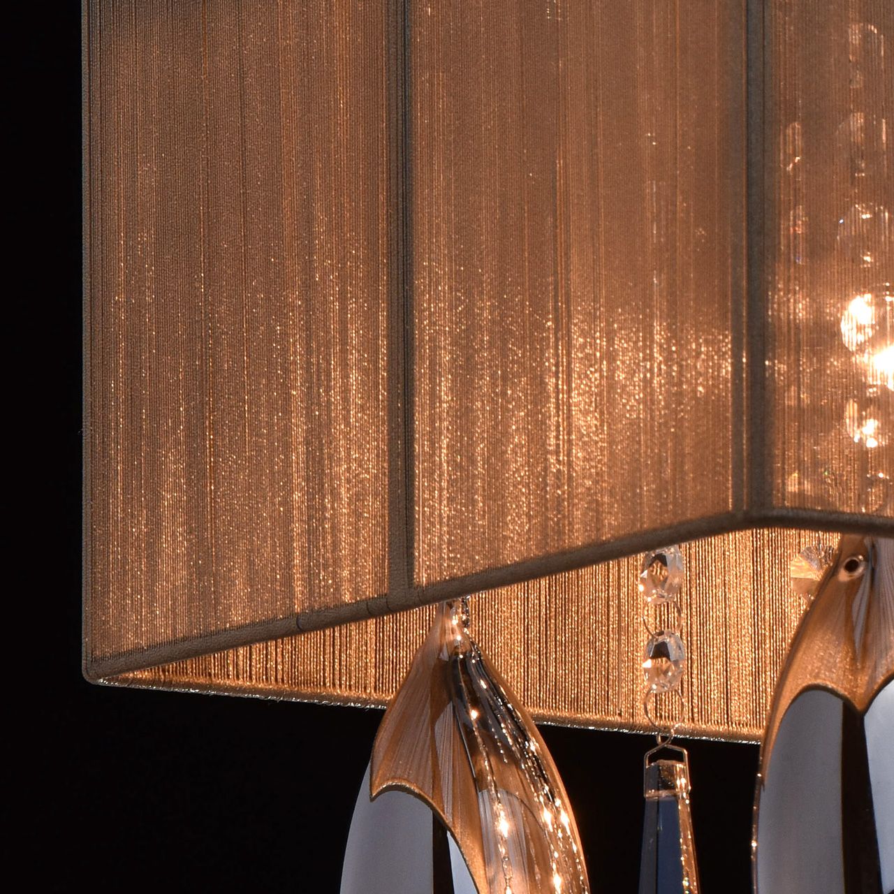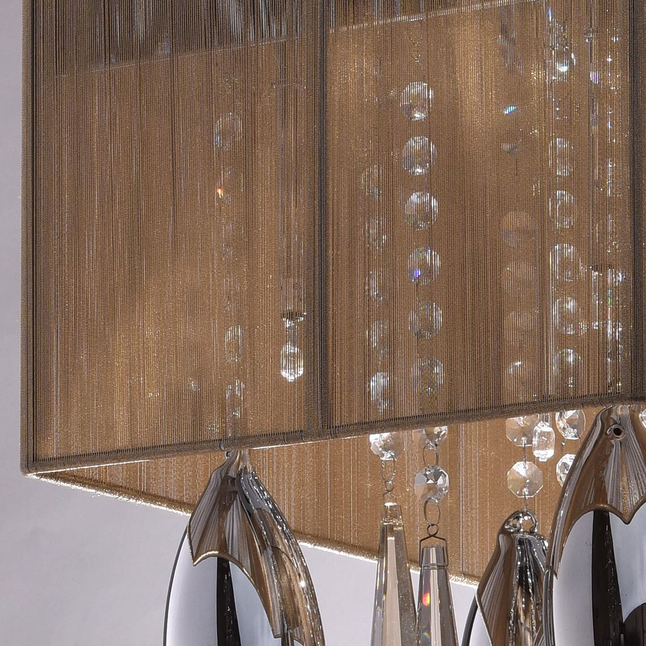 Металлическое основание цвета хрома. Абажур из нитей золотого цвета. Декоративные элементы из гальванизированного хрусталя и стекла.Технология производства