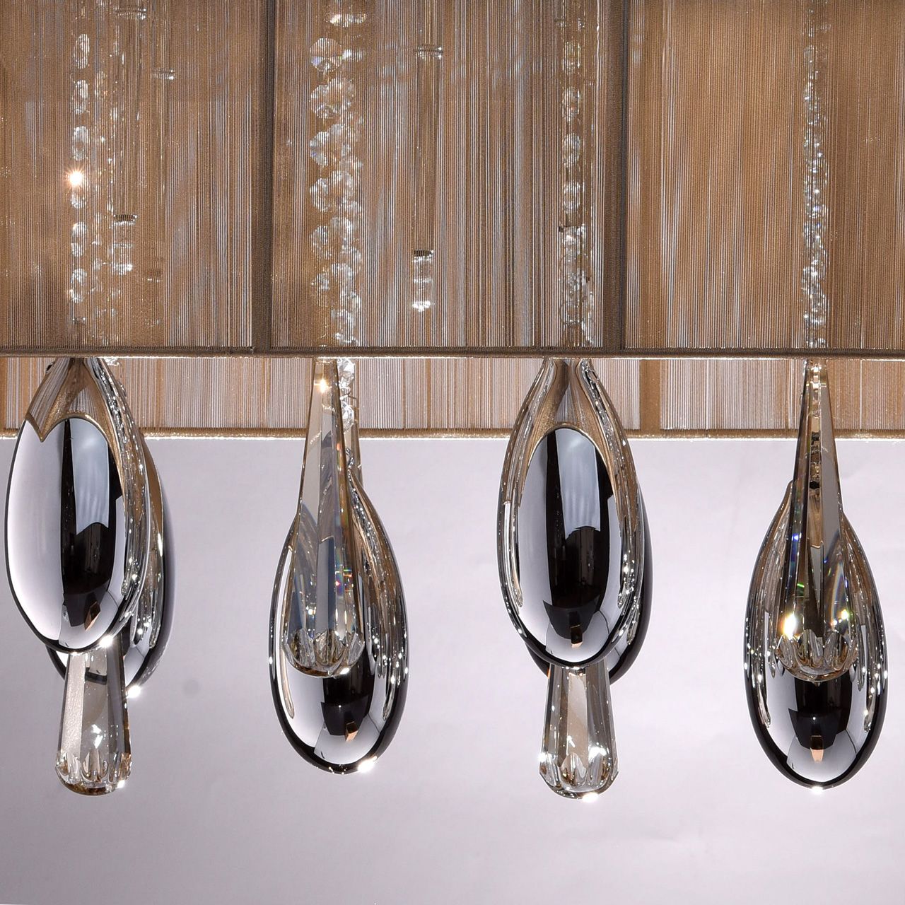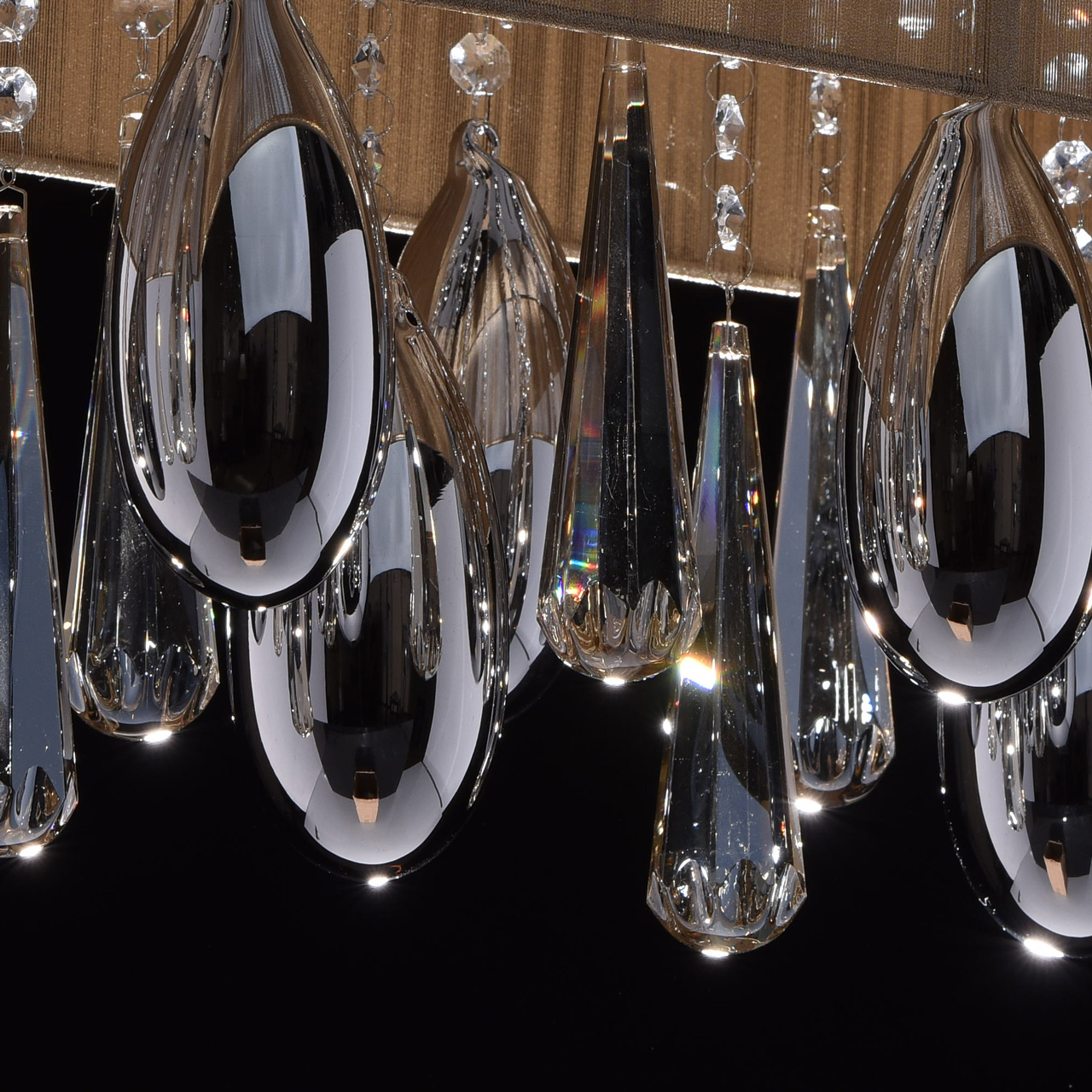 Основание выполнено из комбинации сплавов металлов. Потолочная чаша закрыта пластиной из нержавеющей стали, отполированной до зеркального блеска. Каркас абажура - металл. Абажур декорирован нитями золотого цвета. Декор - гальванизированное стекло и хрусталь. Светодиодный источник света типа LED SMD G4.Тип помещения