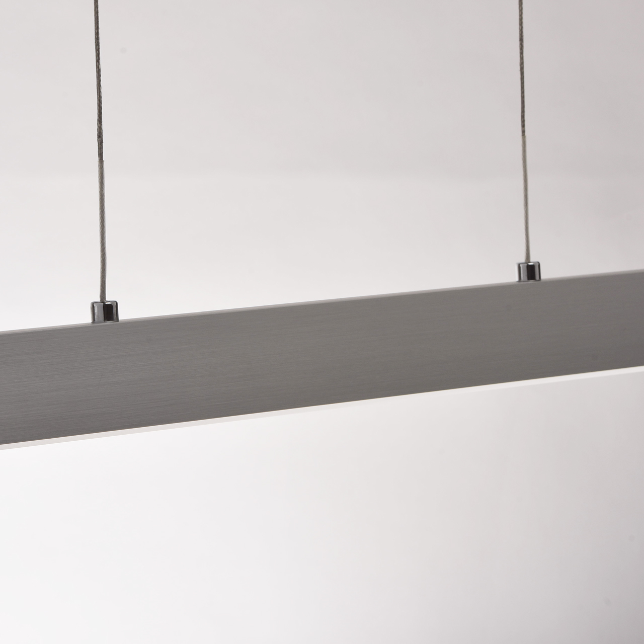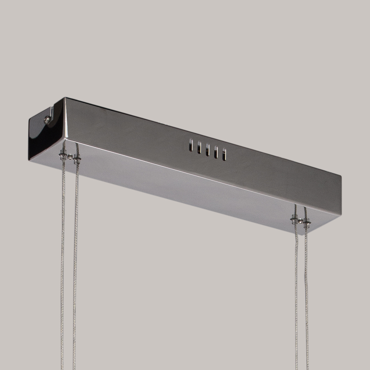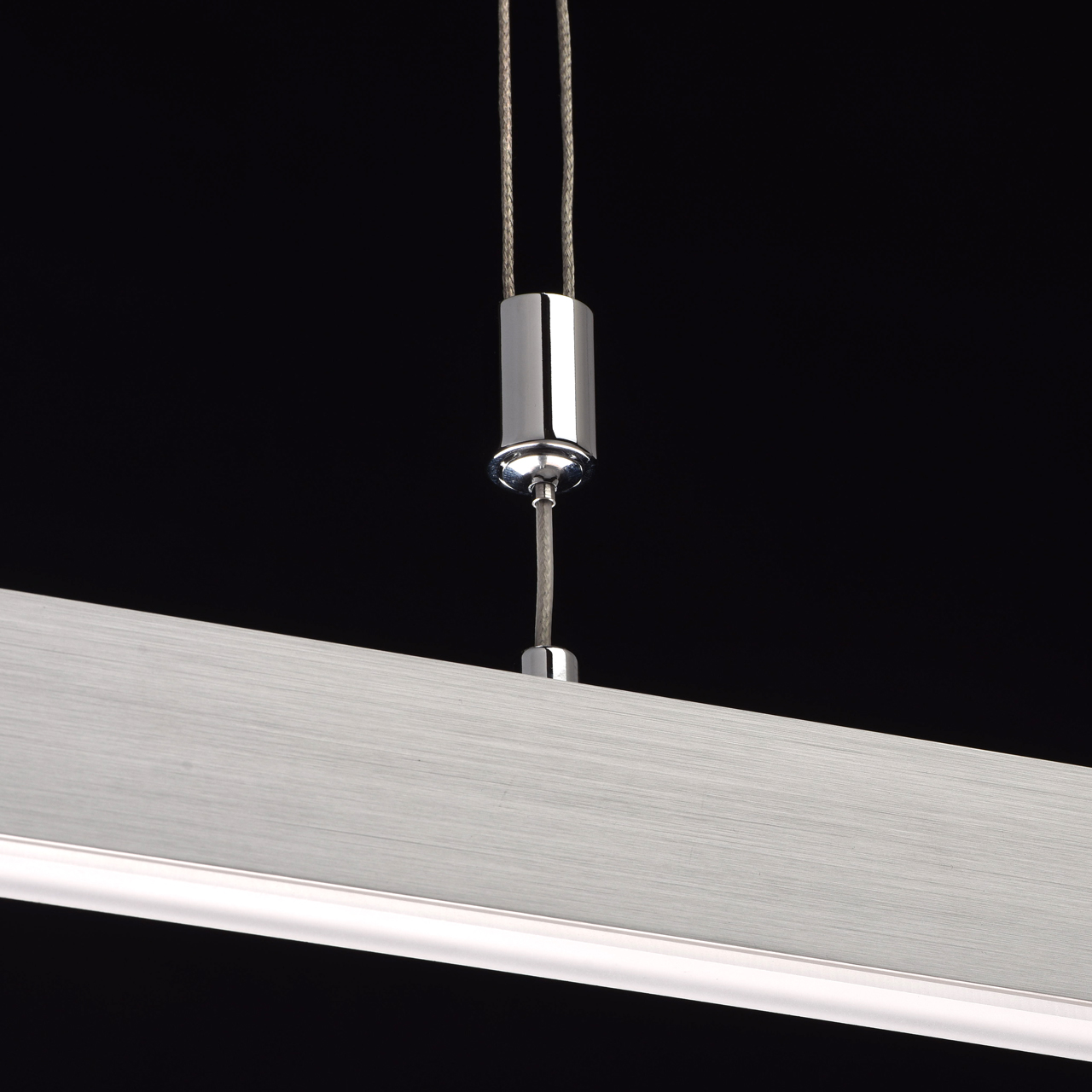 Основание: выполнено из металла гальванизировано в цвет хром, закрыто нержавеющей сталью отполированной до зеркального блеска. Плафон: из сплава алюминия обработан по технологи браширования. Светодиодные источники света SMD Strip закрыты белым матовым акрилом. Подвес - метализированные троссы с регулировочными цангами.Тип помещения
