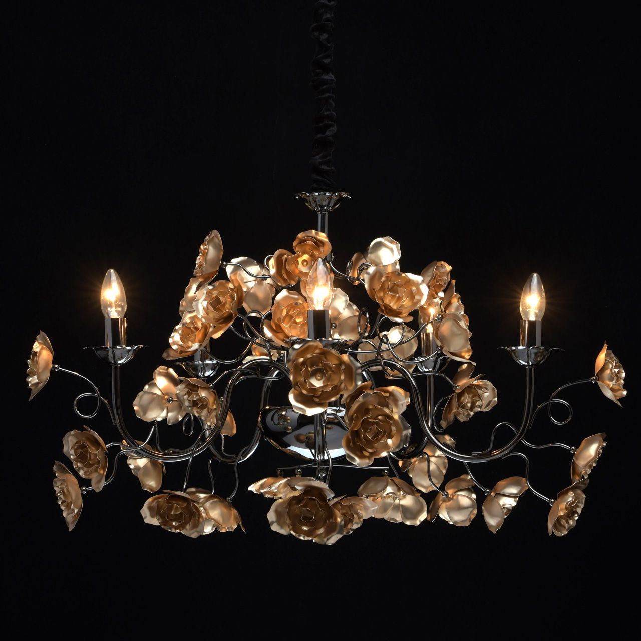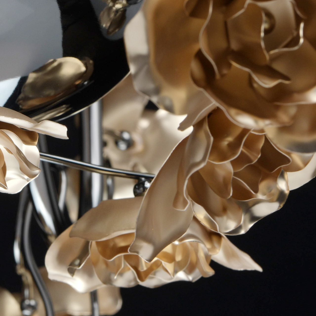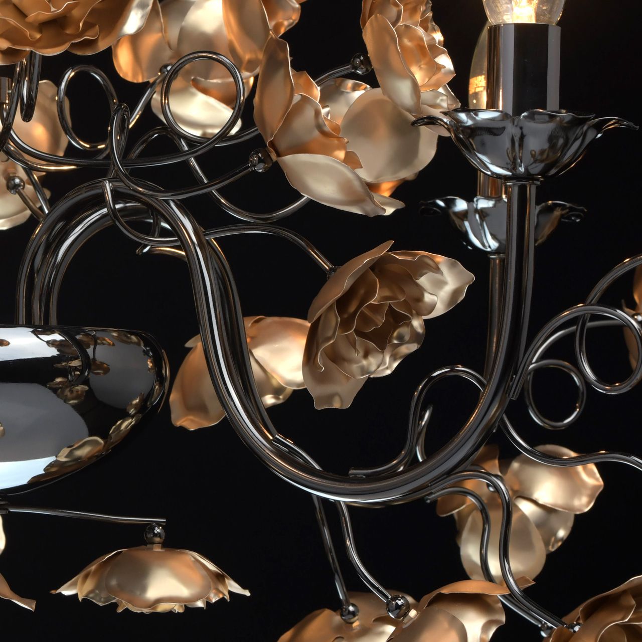 Основание светильника выполнено из металла и гальванизировано в цвет черного хрома. Светильник декорирован цветами, выполненными из металла по технологии прессования и окрашенными в цвет матового золота.Тип помещения